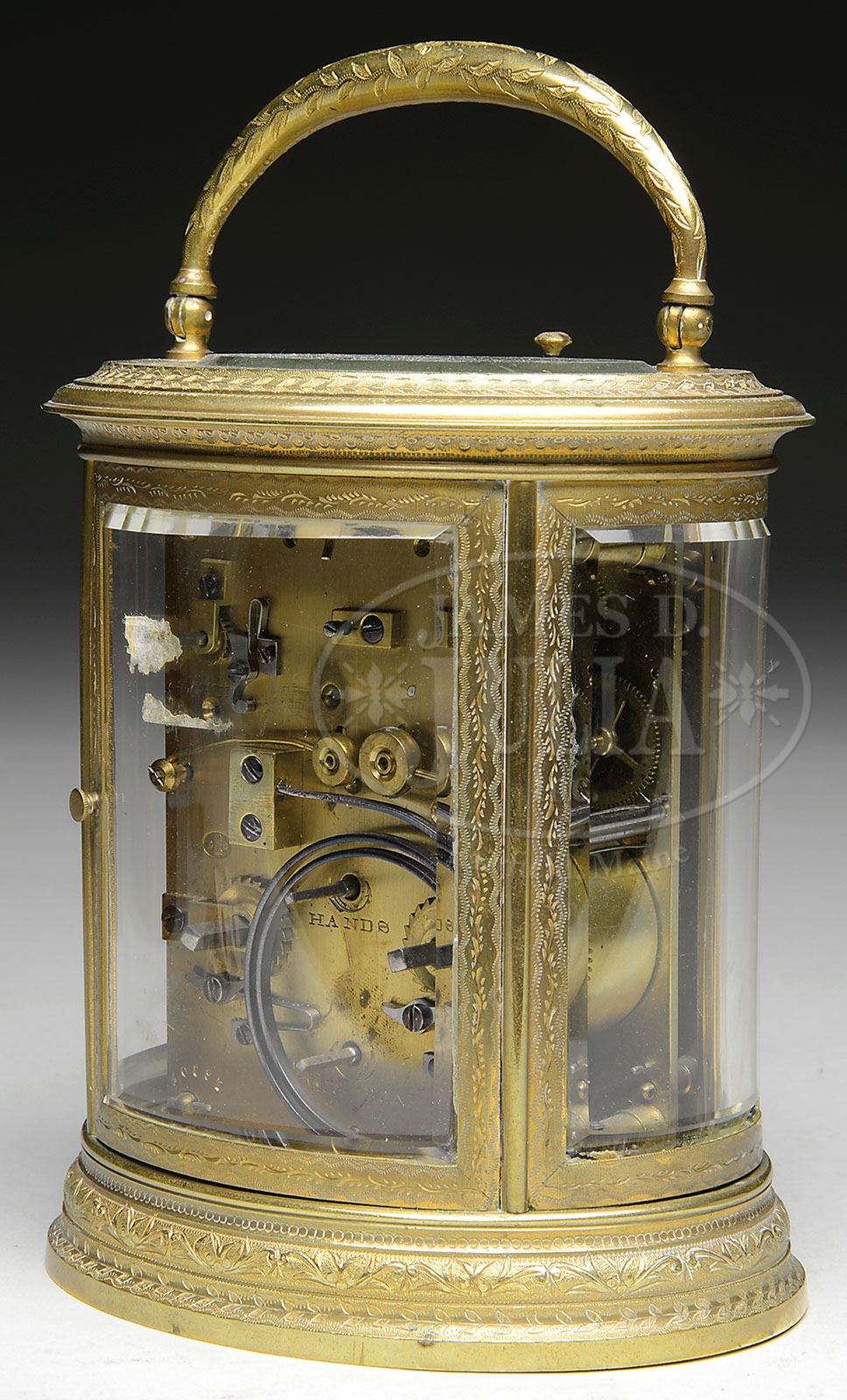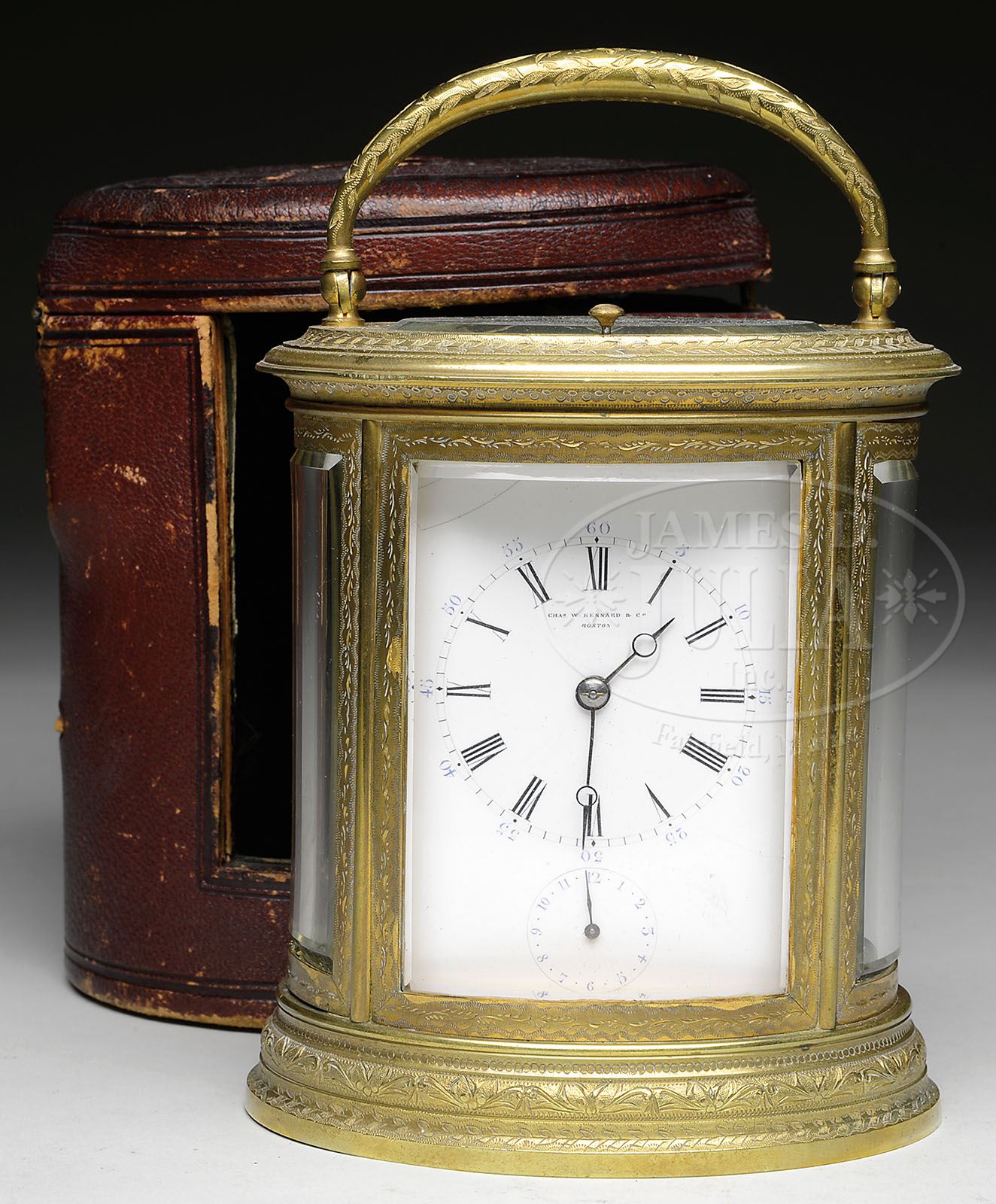 FINE CASED OVAL FRENCH CARRIAGE CLOCK. Fine brass case heavily engraved with folding handle beveled glass on four sides and top, with enamel dial, marked on dial “Charles W. Kennard & Co., Boston”, having time and strike movement with alarm and repeating mechanism. Presentation engraving on base “March 25, 1882”. In a fine red tooled leather case labeled “FABRIQUE PARIS POUR CHAs W. KENNARD & Co. 122 TREMONT BOSTON”. SIZE: 6″ h. CONDITION: Very good, case with minor chafing. 9-90525 (1,000-1,500)