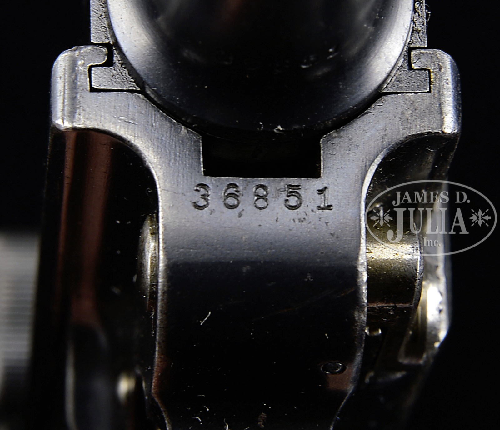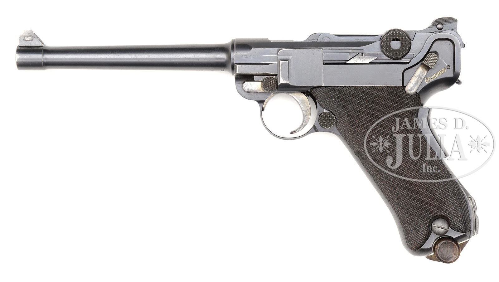 *◊ RARE 1906 DWM URUGUAYAN NAVY RIG WITH MATCHING STOCK.SN 36851. 6″ 9mm bbl with “BUG” proofs and full SN on bottom that is also Crown/M proofed. DWM scroll on center toggle link. 2-position Navy rear sight. Gesichert is in lower (unaltered) position. All numbered parts are matching down to the right checkered walnut grip, left grip is unnumbered. Plain wood bottom magazine. With the orig matching numbered stock and holster with attaching straps, rod/oiler and unmarked takedown tool. Full 5-digit SN is stamped across top of stock lug. This gun is featured on pp. 892, 900 and 901 of The Borchardt & Luger Automatic Pistols by Joachim Gortz & Dr. Geoffrey Sturgess. This is one of less than 30 examples with Uruguayan provenance. PROVENANCE: Collection of Dr. Geoffrey Sturgess. CONDITION: Excellent. Retaining 97% orig blue that is fading with light corrosion on grip straps. 75% orig straw with scattered light corrosion. Bore is worn with light pitting. Grips are lightly worn and oil soaked dark with dings and indents on checkering. Magazine has minor dents and chips on wood bottom and very little wear on body. Mechanics are excellent. Stock is excellent with normal wear on wood. Lug retains about 80% blue and 40% straw. Holster is very good with flaking and cracking primarily on rod pouch, flap and takedown tool pouch. Pull strap is partially missing. Straps are very good with scattered cracks and flaking. 4-52113 BWS32 (10,000-20,000) – Lot 3063