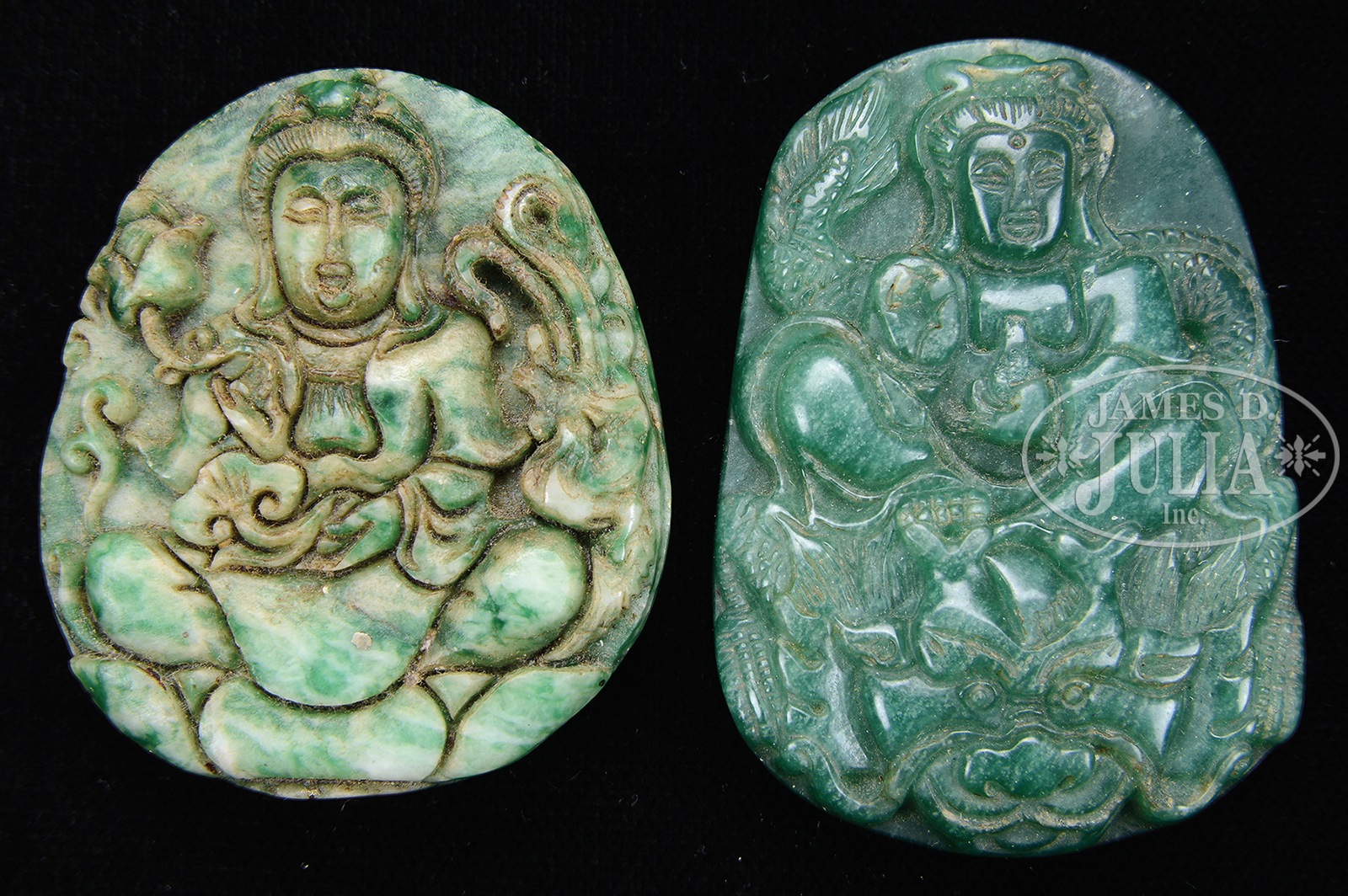 TWO JADEITE PENDANTS.20th century, China. Each carved with images on Quanyin. SIZE: Each about 2″. CONDITION: Very good. 9-96152 (1,500-3,000) – Lot 3063