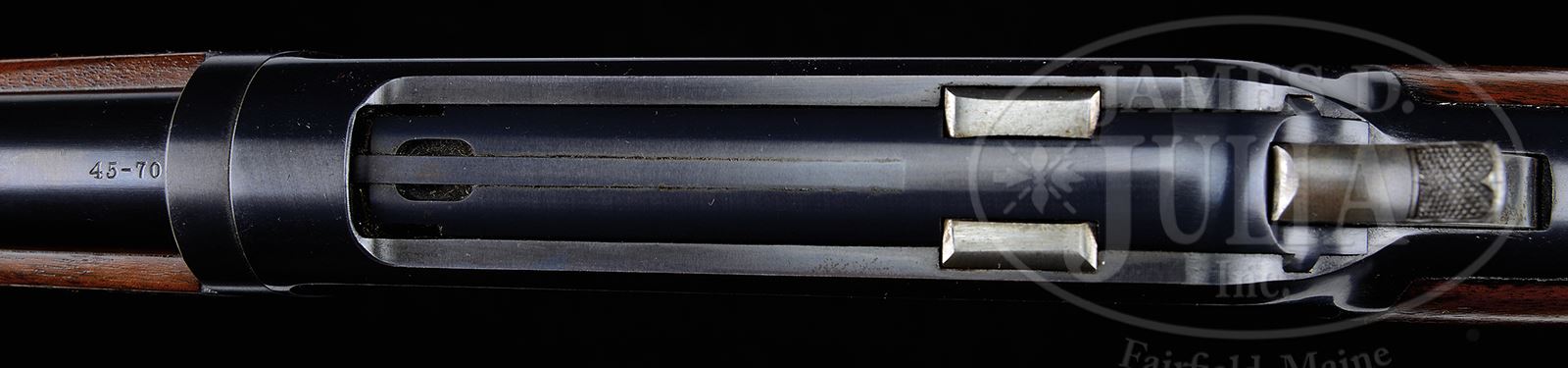 SN 129398. Cal. 45-70. Standard grade rifle with 24″ tapered extra light rnd bbl, half magazine, takedown with pedestal mounted “certifiable antique ivory” bead Lyman hunting front sight, Lyman 6-A two leaf folding rear sight & Lyman combination tang sight. Bbl is marked “NICKEL STEEL” on bbl over chamber area. Mounted with uncheckered straight grain American walnut, straight stock with Winchester trademark embossed hard rubber buttplate. This rifle was produced in about 1903 when the daily use of firearms was commonplace both for hunting & self-protection. Firearms of that era usually saw hard service & are rarely found today with high orig finish. Special Note: This item contains or is made of ivory. Do not bid on this lot unless you have read and agreed to our "Ivory Position Statement" and the "Waiver of Legal and Financial Risk to James D. Julia in regards to your Purchase of an Ivory Object." This information is located in the front section of our catalog. CONDITION: Extremely fine plus. Overall retains about 99% crisp orig factory finish with only a couple of tiny little nicks on receiver. Blue is crisp and bright and case colors on lever & hammer are brilliant. Wood is sound with a very few, very small handling & storage nicks & scratches & retains virtually all of its bright orig finish. Mechanics are crisp. Brilliant shiny bore. May be unfired. 49608-7 JR C&R; IVORY (7,000-10,000) – Lot 3063