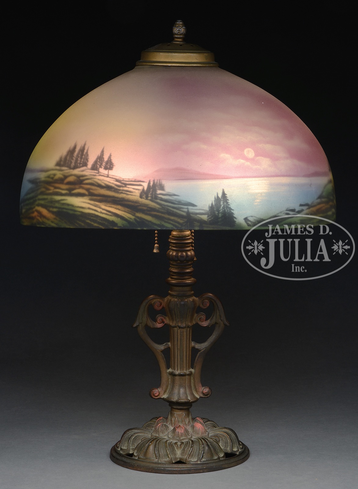 REVERSE PAINTED TABLE LAMP.The 14-1/4″ shade with a moonlit lake scene with colorful sky, water and shoreline. Unsigned. The base having two light fixtures with the bottom signed “E.416 A P PAT APPF4R 151″ white metal with urn and flower base. SIZE: 20″ h. 14-1/4” dia CONDITION: Very good. 49480-5 (800-1,200) – Lot 3063