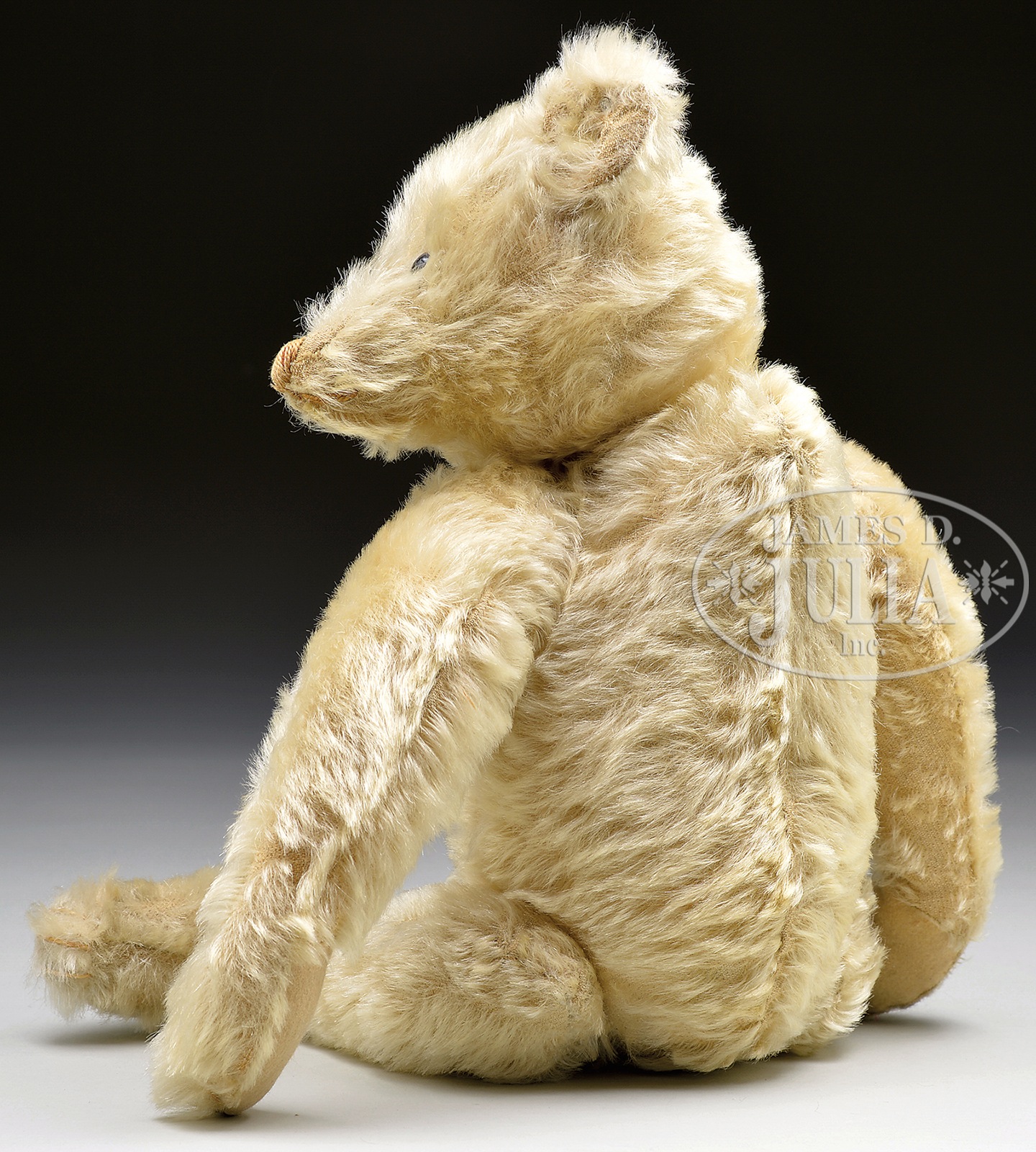 VERY EARLY WHITE STEIFF MOHAIR BEAR WITH BUTTON.This sweet and innocent looking bear is made from white mohair, which has mellowed slightly with age. He is 5-ways jointed, and has traditional and early Steiff proportions including long arms, long narrow feet, and a pronounced back hump. Bear has tan mohair pads with five claws on each paw. His most endearing face is very childlike and is detailed with black shoebutton eyes and a brown hand-embroidered nose. You can see the brown felt that underlies the nose stitching. Bear retains a tiny blank button as his Steiff ID. SIZE: Overall 16″ t (40cm). Sitting 10″ t (25cm). PROVENANCE: Chuck & Cathy Steffes Collection. CONDITION: Professional pad restoration and restitching of claws. Light playwear and general mohair thinning, especially on the front torso and right arm. Otherwise good. 1-13874 (4,000-6,000) – Lot 3064 Auction: Advertising, Toy & Doll - Spring 2014 Please Note: All prices include the hammer price plus the buyer’s premium, which is paid by the buyer as part of the purchase price. The prices noted here after the auction are considered unofficial and do not become official until after the 46th day. |