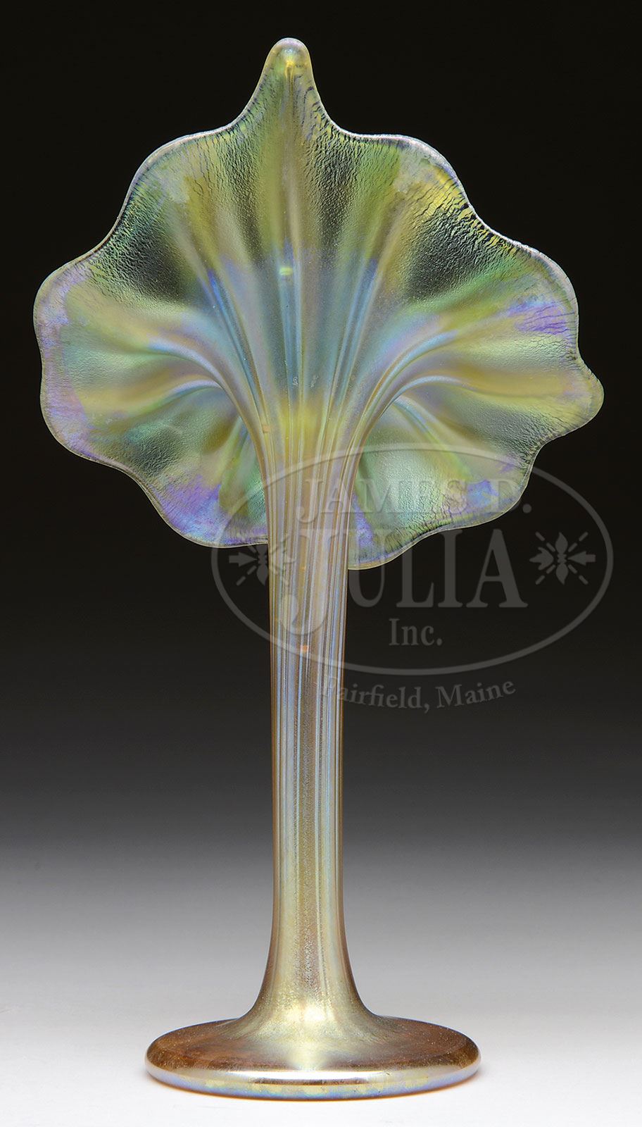 TIFFANY GOLD FAVRILE JACK IN THE PULPIT VASE.Tiffany gold favrile vase in the jack in the pulpit form has a ribbed stem with the ribs following on to the back of the jack in the pulpit face. Vase is finished in bright gold iridescence while the face of the jack is even brighter with a lightly ruffled and stretched rim. Signed on the underside “L.C. Tiffany-Favrile 220K”. SIZE: 11-1/4″ t. CONDITION: Very good to excellent with three light scratches on top of foot. 5-69406 (3,500-4,500) – Lot 3065
