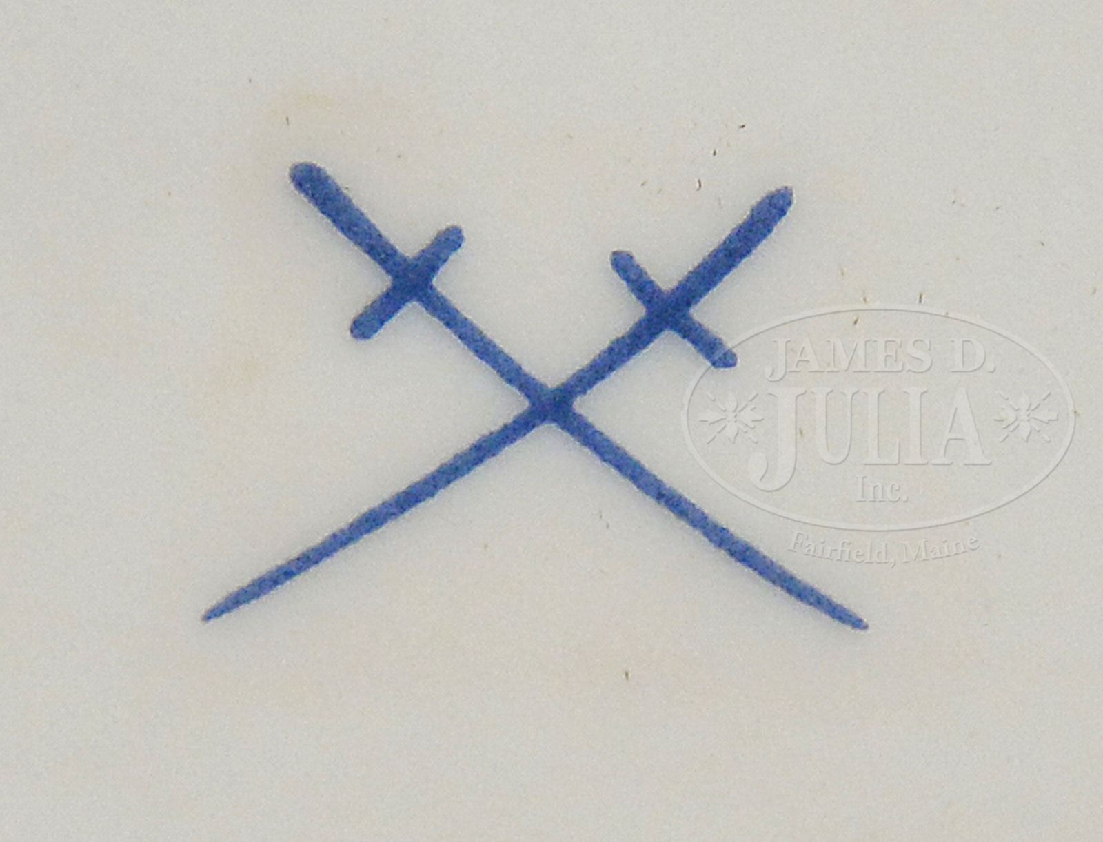 LARGE PAIR OF GARNITURE VASES. Late 19th, early 20th century, probably Germany. Possibly exhibition pieces. This large pair of garnitures having heavy gold gilt decoration with hand painted polychrome floral sprays & elaborate swan bases. The sides molded with scrolling leaf tips. Marked with spurious Meissen crossed swords in overglaze blue. SIZE: 28-1/4″ h x 19″ w and 28-3/4″ h x 18″ w. CONDITION: Very fine. 9-90007 (700-900)