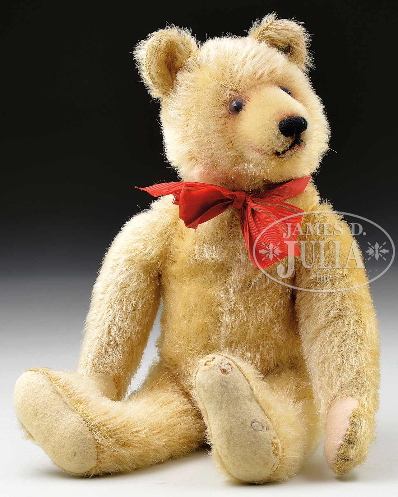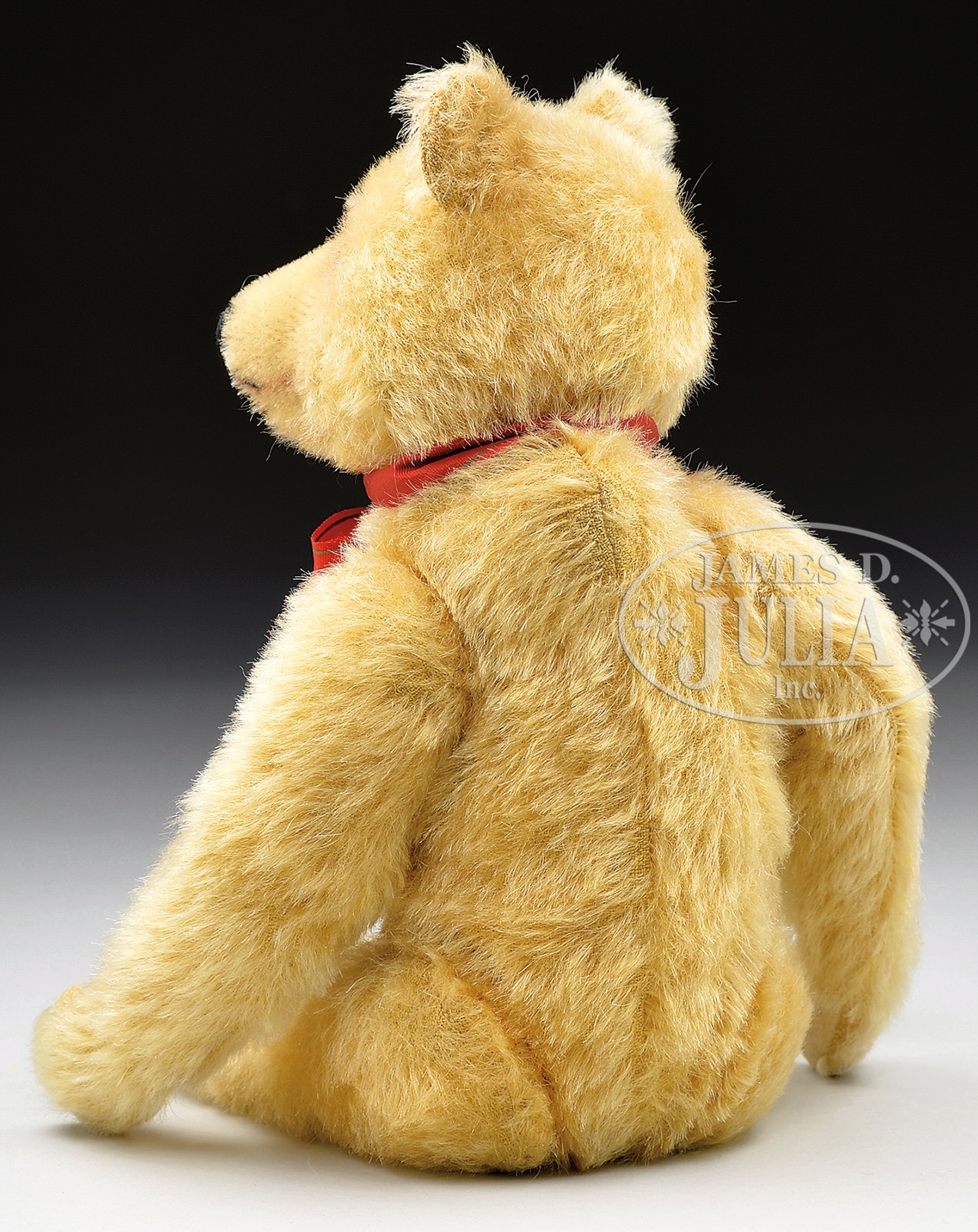 STEIFF BLOND MOHAIR DICKY BEAR WITH BUTTON AND PLAIN FELT PAW PADS.An utterly charming example of Steiff’s relatively rare Dicky bear, which was produced as an inexpensive alternative to the company’s higher priced products in the early 1930s. This circa 1930s Dicky is 5-ways jointed with tan felt paw pads. This model was also produced with velvet paw pads which were authentically stenciled to look like a real bear’s paw. His distinctive and serious looking face is detailed with black and brown glass pupil eyes and a black hand-embroidered nose and mouth located on a prominent inset muzzle. His face is further highlighted with a touch of airbrushing around his eyes and mouth. Dicky retains his original long trailing “F” button and remains of his red ear tag as his Steiff IDs. The Dicky design was produced in blond, white, and brown in sizes ranging from 15-75 cm in the 1930-1941 period. SIZE: Overall 12″ t (30cm). Sitting 8-1/2″ t (22cm). PROVENANCE: Chuck & Cathy Steffes Collection. CONDITION: Professionally replaced paw pad. One foot pad with very minor restoration and holes. Nose possibly restitched. Otherwise very good. 1-13796 (5,000-7,000) – Lot 3067 Auction: Advertising, Toy & Doll - Spring 2014 Please Note: All prices include the hammer price plus the buyer’s premium, which is paid by the buyer as part of the purchase price. The prices noted here after the auction are considered unofficial and do not become official until after the 46th day. |