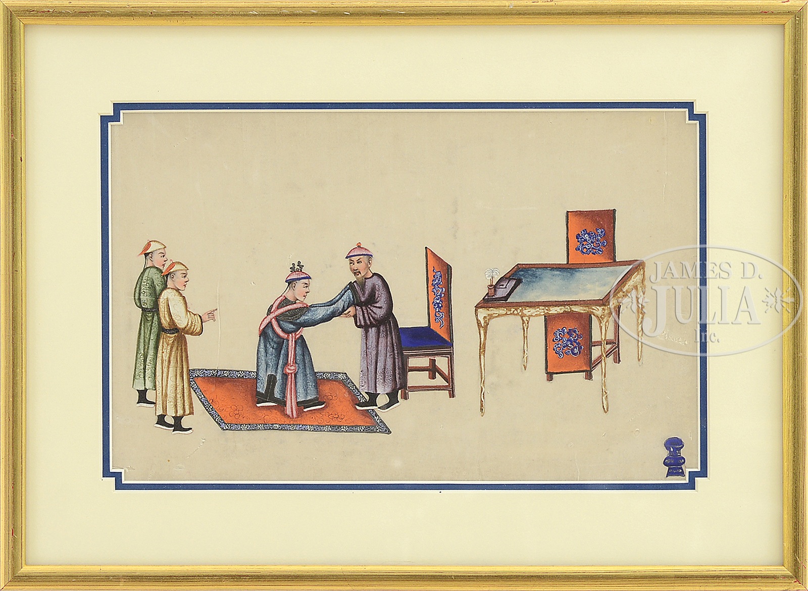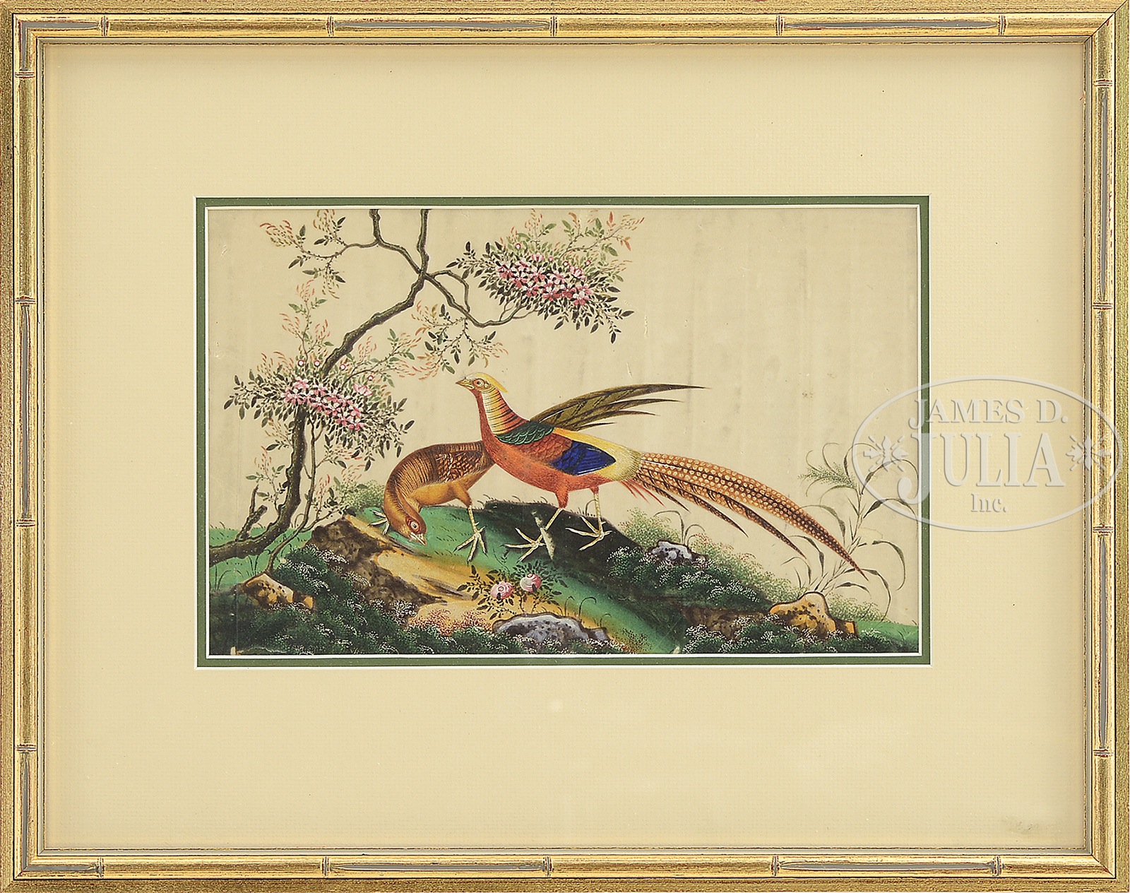 LOT OF FOUR PAINTINGS.China, 19th century. Three depicting figures in various interior scenes along with one depicting birds in a landscape. Each framed under glass. SIZE: Sight: 12″ x 7-1/2″. Overall: 19-1/4″ x 15-1/4″ and (3) 16-1/2″ x 12″. CONDITION: A few visible splits to the paper and scattered toning. Not examined out of frames. 49990-9 (700-900) – Lot 3067