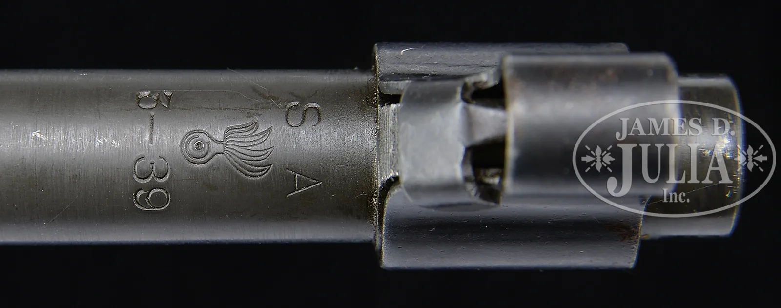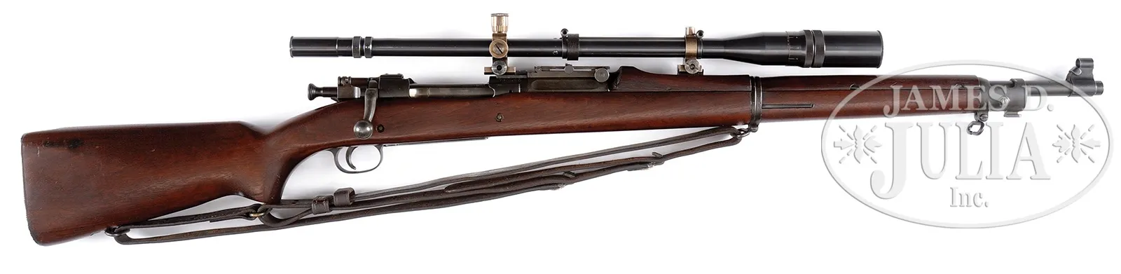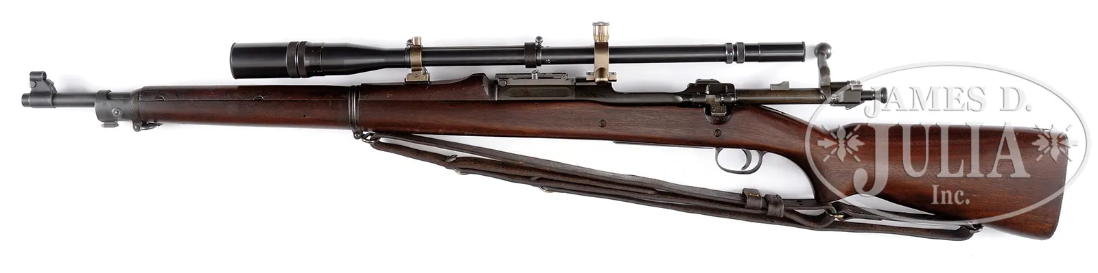 *HIGH ORIGINAL CONDITION SPRINGFIELD 1903 SNIPER RIFLE WITH UNERTL SCOPE AND SCOPE CASE.SN 1397043. Cal. 30-06. Stellar orig condition Springfield 1903 with proper “SA” marked ordnance bomb proofed bbl, dated “5-39”. U.S. marking discernible but partially obscured by rear sight block base on receiver band. Bolt is electro-penciled with matching SN visible when in the open position. There is a slight gap between the receiver and the stock cutout. Scope is marked “J.UNERTL USMC-SNIPER 2648”. Rear scope mount also marked “J.UNERTL” with patent number on opposite side. Forward scope mount devoid of markings. Stock is marked at base of pistol grip “043” with sans sarif “P” to rear of trigger guard. Vintage leather sling with indiscernible makers mark included. Orig scope carrying case also included, complete with endcap and belt hanger. Scope includes both end caps, hooded sight protector present. PROVENANCE: From High Condition Collection of Discerning U.S. Military Rifle Collector, Offered Without Reserve. CONDITION: Overall appearance and finish is superb, over 98% dull gray/blue finish just starting to thin at the safety thumb piece and discernible wear at high edges of scope protecting hood. Bolt finish scrubbed to bare metal where SN is eletro-penciled. Forend cap appears to have some pitting discernible under the finish. It is this catalogers opinion that this piece sustained this pitting at the factory prior to assembly and this is the way it was from that time. Scope finish deep lustrous blue. Optics are clear and perfect. Scope rings retain nearly all of a straw color. Forward scope ring screws show evidence of having been turned. Leather sling starting to crack but still serviceable. Stock exhibits very minor and slight handling marks. Bore is near excellent, shiny and bright. Scope case near excellent condition with penciled name on bottom “C.A. RICE”. It is difficult to imagine one could find a finer condition specimen of this highly sought after model. 50908-6 JWK73 (6,000-10,000) C&R – Lot 3067
