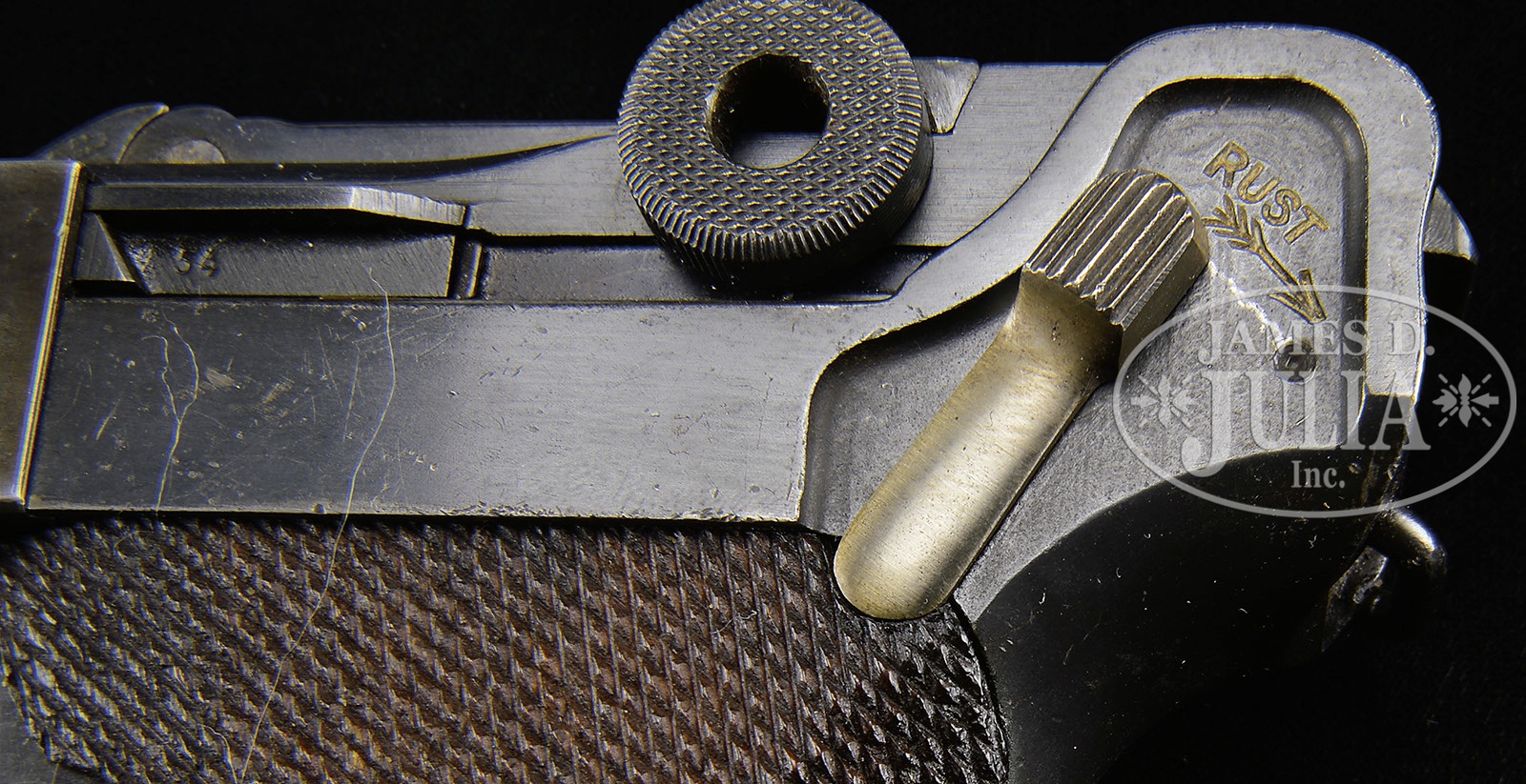 *◊ RARE DUTCH NAVY 1937 MAUSER BANNER LUGER.SN 2154. 4″ 9mm bbl with full SN on bottom. 1937 date above chamber. Mauser Banner on center toggle link. Crown/U proof next to full SN on left receiver. RUST marked safety with arrow pointing downward. Extractor marked GELADEN on both sides. Aluminum bottom S/42 Eagle/63 proofed magazine. All numbered parts are matching except for the checkered walnut grips which are numbered 15. This gun is featured on p. 560 of The Borchardt & Luger Automatic Pistols by Joachim Gortz & Dr. Geoffrey Sturgess. PROVENANCE: Collection of Dr. Geoffrey Sturgess. CONDITION: Excellent. Retaining 97% orig Dutch arsenal blue and straw with some fading on sideplate. Bore is bright and sharp. Grips are sharp with some minor indents to checkering and are oil soaked dark showing some wood grain. Magazine body retains 90% blue and has a few minor dents. Aluminum bottom is excellent with minor wear. Mechanics are excellent. 4-52886 BWS60 (3,000-5,000) – Lot 3069