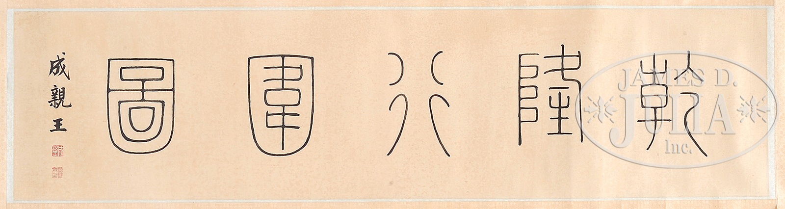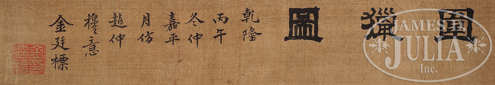 AFTER JIN TING BIAO (Chinese, 18th century) IMPERIAL HUNT SCENE.Ink and color on silk. Featuring the Qianlong emperor’s associates chasing wild game. SIZE: 12-1/2″ x 97-1/2″. CONDITION: Good with minor creases. 49873-4 (3,000-5,000) – Lot 3069