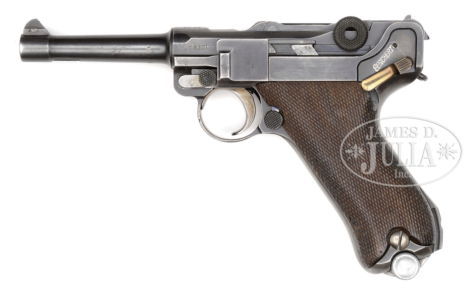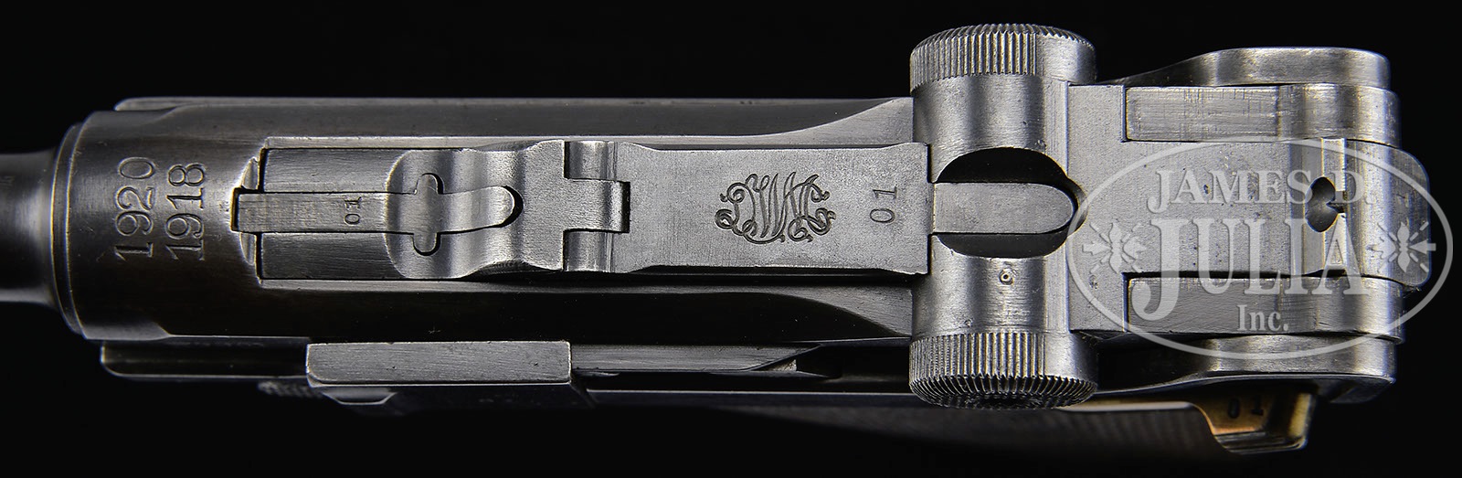 *◊ RARE DWM 1920/1918 BALTIC FLEET NAVY ISSUE REWORK LUGER.SN 9301h. 4″ 9mm bbl with full SN on bottom and Eagle/O (O – Ostsee) inspection mark on left side of bbl. 1920/1918 above chamber. DWM scroll on center toggle link. Eagle/O next to SN on left receiver. Checkered walnut grips. “O.891” (Ostsee/Baltic Fleet Property #891). Aluminum bottom magazine does not match and is Navy marked “N/2360” on bottom. All numbered parts are matching except for trigger which is SN 71. Takedown lever has had matching number added by arsenal and frame number was stamped over orig number by arsenal. This gun is featured on p. 496 of The Borchardt & Luger Automatic Pistols by Joachim Gortz & Dr. Geoffrey Sturgess. PROVENANCE: Collection of Dr. Geoffrey Sturgess. CONDITION: Very fine. Retaining 85% blue with most wear on grip straps and sharp edges. Straw is 50% orig with reheated areas on left trigger and safety lever. Bore is bright with light wear. Grips are worn with dents and chips to checkering and a large chip under safety lever. Magazine is excellent with some wear on body and a few nicks in aluminum bottom. Mechanics are excellent. 4-52911 BWS41 (2,000-3,000) – Lot 3070