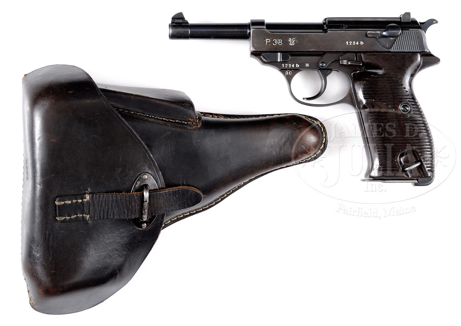*SCARCE WALTHER AC40 P38 PISTOL WITH HOLSTER.SN 1234b. Cal. 9mm. 5″ bbl. Left side of slide marked “P.38”, “ac/40”, SN. Eagle “359” proofed. “ac” marked on left trigger guard web. Proper early high luster blue finish. Chocolate brown Bakelite grips. “p.38v”, eagle “359” marked magazine. Matching SNs on slide, frame and bbl. Accompanied by black leather clam shell holster marked on back with a 9 within an oak leaf within a stylized rectangle, eagle WaA930, “P.38”. CONDITION: Very good with majority of high luster finish. Very light surface rust and minor pitting here and there. Markings are clear. Excellent working order. Bore has strong rifling with light roughness. Grips are fine with light handling marks. Holster is solid with scuff marks and strong stitching. 51709-6 GER (3,000-4,500) C&R – Lot 3070