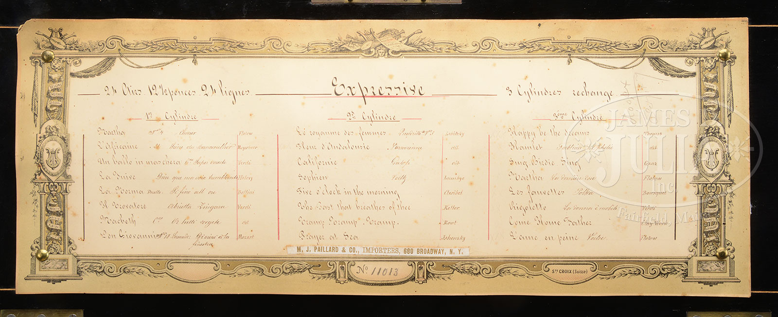 PAILLARD & CO. INTERCHANGEABLE MUSIC BOX WITH THREE 13″ EIGHT TUNE CYLINDERS.Burled walnut cabinet with hinged lid affixed with early, if not original song index for each of the three cylinders. Marked with maker’s name and no. 11013. Each cylinder playing on a silver comb. Brass bed plate impressed with no. A18742. Music box mounted on its original walnut table with ebonized turned legs fitted with a single drawer in which are housed two additional cylinders. NOTE: Music box is accompanied by 1985 receipt for the restoration and recondition of this music box completed by “The Musical Wonder House”, Wiscasset Maine. SIZE: Case: 7-1/2″ h x 29-1/2″ l x 10-3/4″ d. Table: 29-1/4″ h x 40″ l x 20-1/2″ d. PROVENANCE: From the Pierce family of central Maine. CONDITION: The cabinet and table with original surface and undisturbed patina. Cylinders and movement reconditioned as noted. 51637-5 (2,000-2,500) – Lot 3070