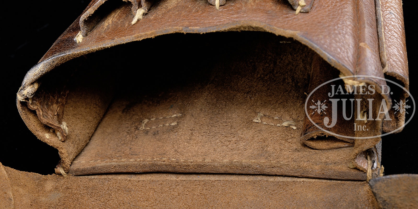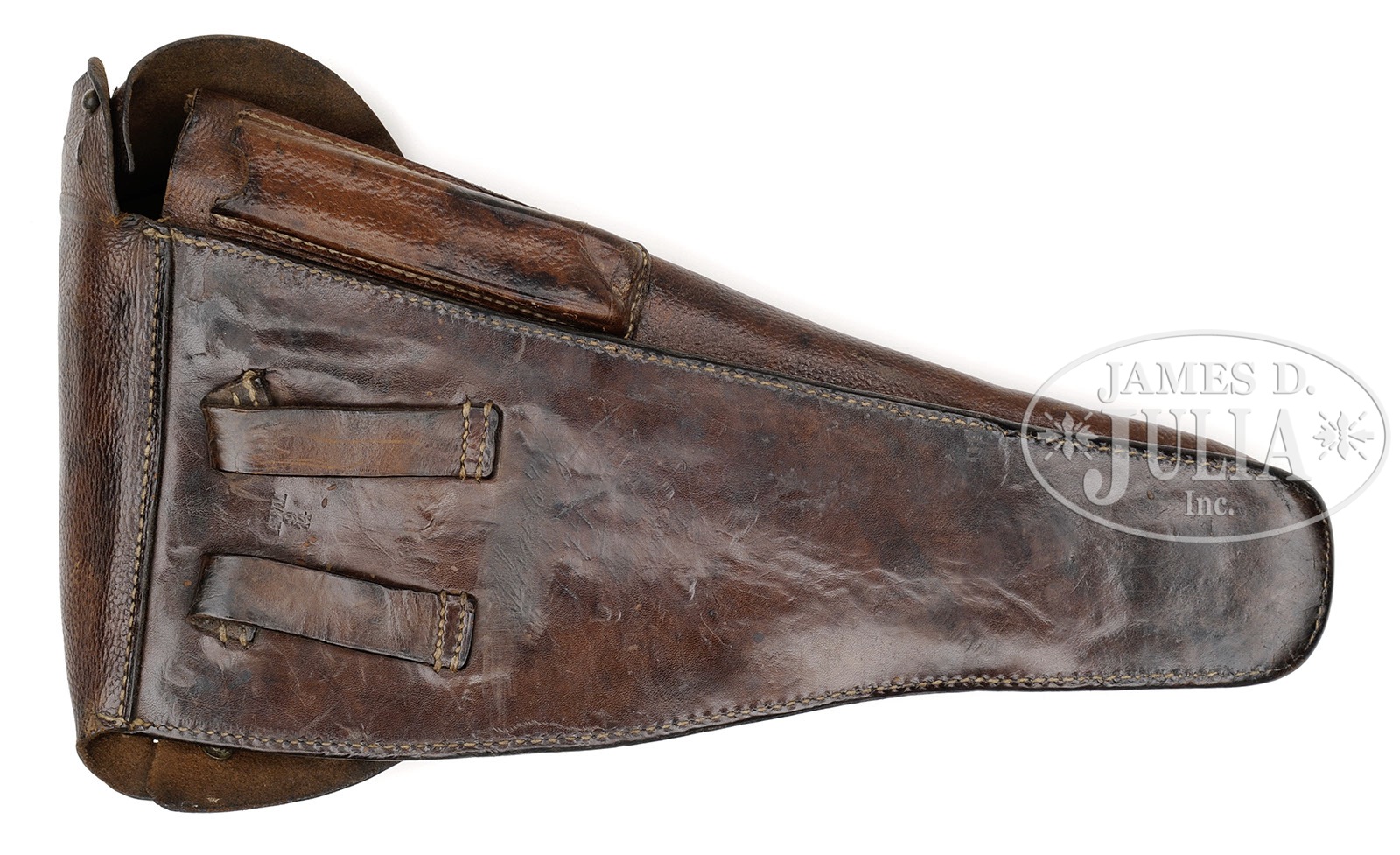 PHENOMENALLY RARE PROTOTYPE LUGER ARTILLERY HOLSTER/STOCK SCABBARD.SN NSN. Heavy grain brown leather front and flap with internal pouches for takedown tool and cleaning rod. 3 brass stud closures on lid. External pouches for four magazines. Backside is smooth leather with belt loops. Marked “AWM/9/14” (manufactured by Artilleriewerkstätten München in 1914). Designed to carry the experimental one-piece wood artillery holster/stocks that were made for the first artillery Luger prototypes. This scabbard is featured on p. 992 of The Borchardt & Luger Automatic Pistols by Joachim Gortz & Dr. Geoffrey Sturgess. PROVENANCE: Collection of Dr. Geoffrey Sturgess. CONDITION: Very fine. With normal wear and scuffs on orig brown finish. 50% of exterior surface is darkened with oil stains. Some cracking on closure strap. Brass shows normal patina for its age. Stitching retains orig color. Structure is sound. 4-53362 BWS114 (4,000-8,000) – Lot 3073a