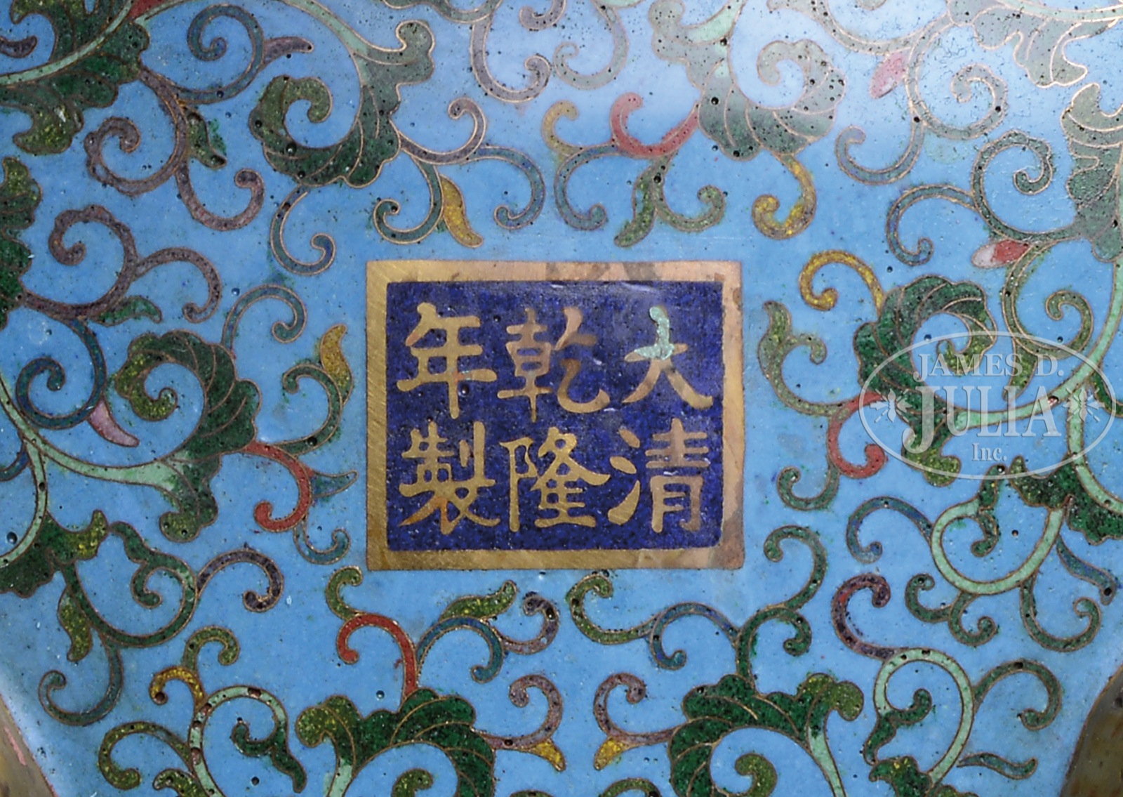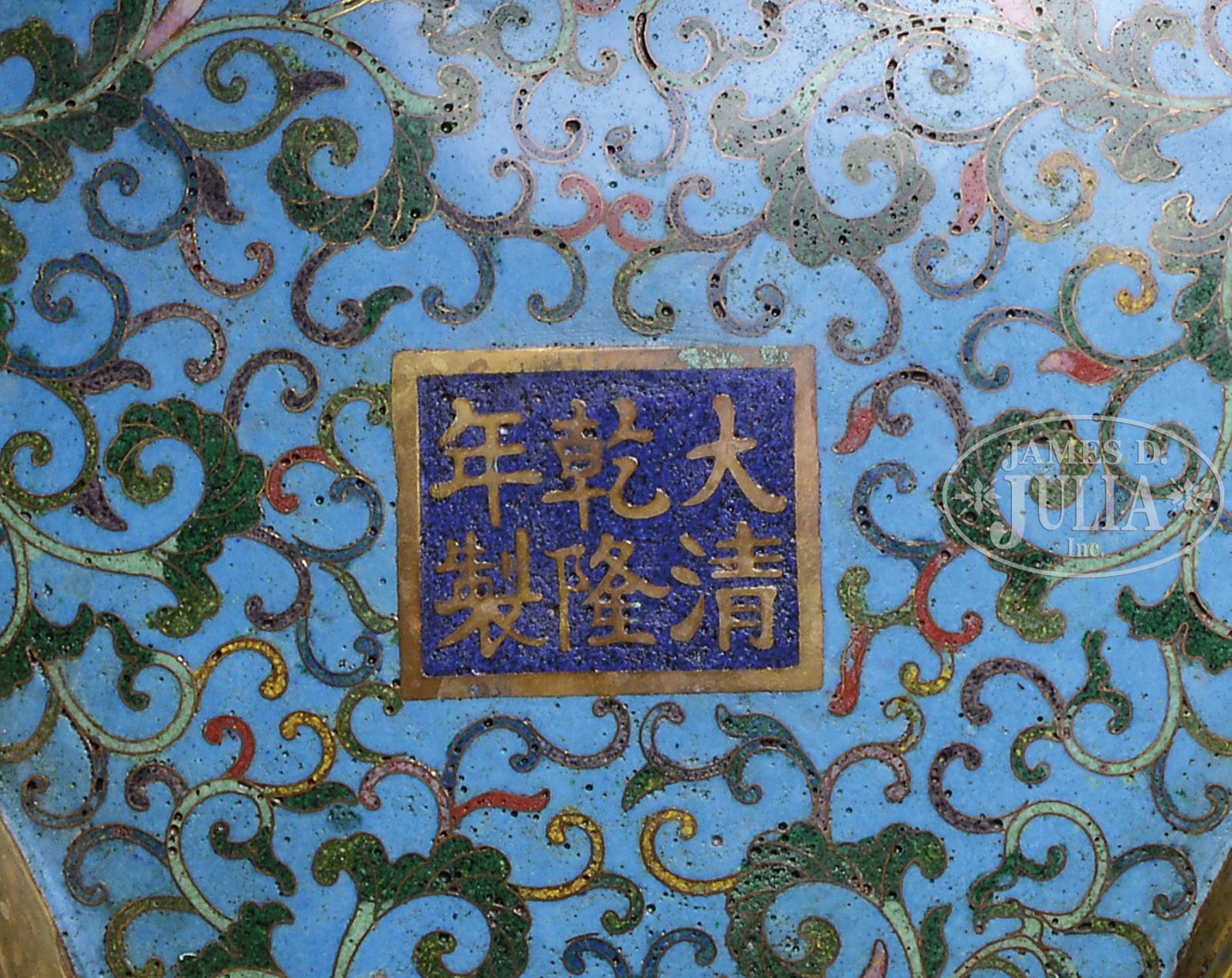 PAIR OF LARGE LIDDED CLOISONNE CENSERS.20th century, China. Repousse gilt copper with lids decorated with a dragon finial and the body covered with a design of a lotus pond with aquatic birds. Body with dragon handles and foo dog feet. Cloisonne work of archaic scrolling and formalized floral meanders with deer on a turquoise ground. Ch’ien Lung mark on the base. SIZE: 26″ h x 10″ dia. CONDITION: Very good. 7-75627 (2,500-3,500) – Lot 3074