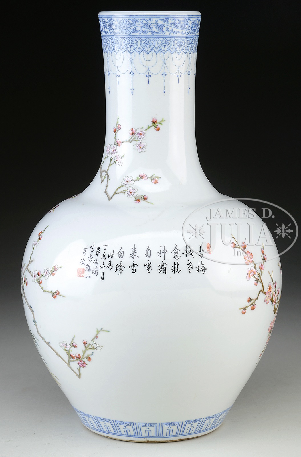 FAMILLE ROSE FLOWERS & BIRDS VASE.20th century. Of globular form, the large vase body painted with magpie birds on plum flower trees, while flowers blossom around them. Chinese calligraphy poetry on the side, artist signature “Zhang Zhitang”, bottom bears additional mark. SIZE: 15″ h x 9″ d. CONDITION: Good. 50053-17 (800-1,200) – Lot 3076