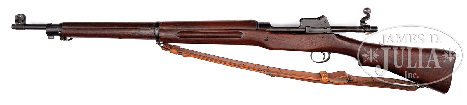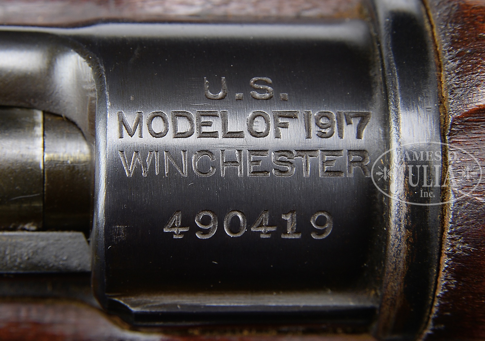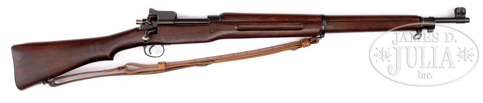 *EXTREMELY FINE WINCHESTER MODEL 1917 ENFIELD BOLT ACTION MILITARY RIFLE.SN 490919. Cal. 30-06. Beautiful all correct and matching standard rifle with 26″ rnd bbl with Winchester marking and flaming bomb marks by the front sight and the date “11-18”. Receiver marked with a large Ordnance Corps flaming bomb. Stock is marked forward of mag well with proof over “500”, and to rear of trigger guard with proof over “510”. Proofmark “W” prominently visible in wood of forend above bayonet lug. The rifle also includes an excellent condition original 1918 dated leather sling. Receiver marked “U.S. MODEL OF 1917 / WINCHESTER /(sn)”. This model was actually carried by more American troops in WW1 than the 1903 Springfield. CONDITION: Extremely fine to near excellent overall appearance and finish with over 97% orig lustrous blued finish remaining on metal parts with loss of finish to the high edges, and some blemishes to the barrel band. Wood finish also original with some light handling marks and two noticeable dings and a small bruise to the underside of the stock 4″ ahead of the forward sling swivel. Bore is excellent, shiny and bright. If you have been waiting and searching for a fine original WW1 Winchester specimen with an excellent bore, look no further. 51087-2 JWK87 (1,200-1,500) C&R – Lot 3078