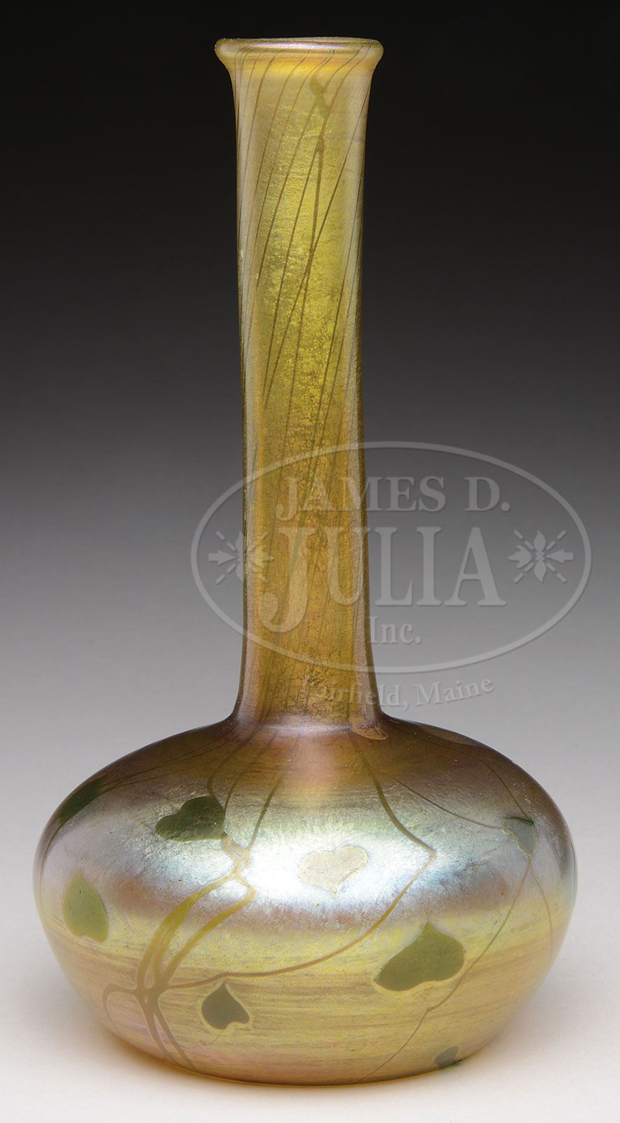 TIFFANY HEART AND VINE VASE.Tiffany gold favrile vase has bulbous body decorated with green heart and vine surrounding the body. The vines continue swirling up the long slender neck all set against a dark gold iridescence with platinum highlights. Signed on the underside “L.C. Tiffany-Favrile 7043G”. SIZE: 6-1/4″ t. PROVENANCE: Private New England Collection. CONDITION: Some dullness to iridescence, otherwise very good to excellent. 5-69283 (2,000-3,000) – Lot 3079