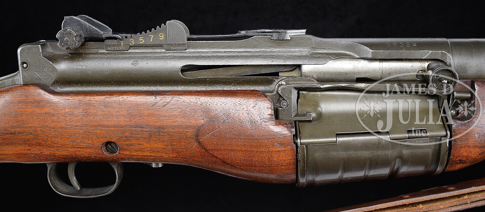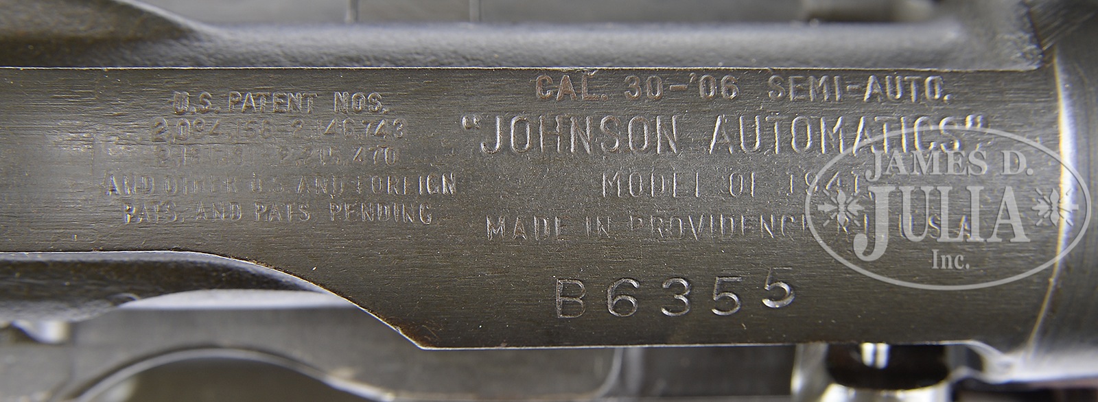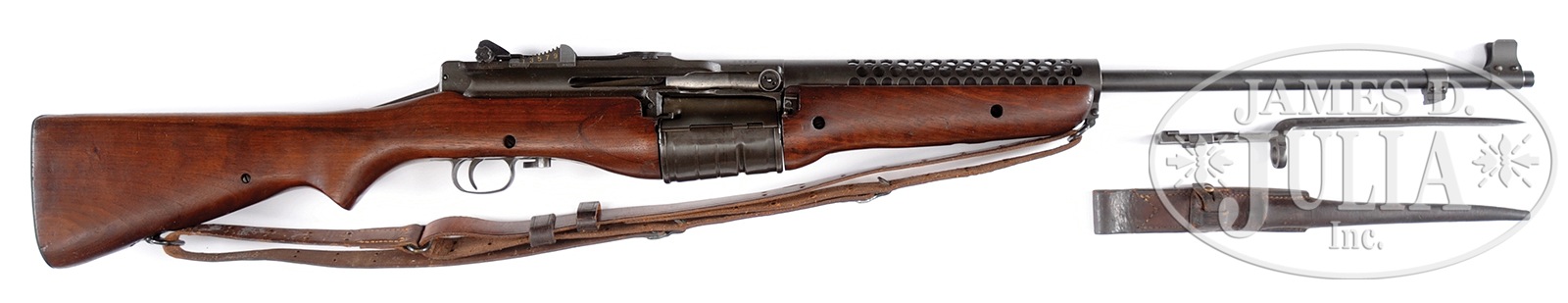 SN B6355. Cal. 30-06. This specimen exhibits standard markings including .30-06 and “41” visible on bbl ring. Includes an orig leather sling marked “B.T.& B. CO. / 2” and rare Johnson bayonet in orig leather scabbard. Also included is an orig Johnson Automatics tri-fold pamphlet with photos of facts about the Johnson rifle, carbine, and machine gun. These rifles are seldom if ever found with matching numbered bolts and this one is no exception with bolt SN B6712. Appropriate “J.A.” over “.30-06” marking visible through perforated bbl heat shield. PROVENANCE: From High Condition Collection of Discerning U.S. Military Rifle Collector, Offered Without Reserve. CONDITION: Overall appearance and finish extremely fine to near excellent orig gray/green finish on metal parts with some thinning and loss of finish to a gray/green patina at the high edge wear points of the mag housing and high edges of receiver to rear of rear sight. Wood buttstock exhibits some light handling marks and has been expertly repaired on both sides to the rear of the mag housing where at some point in the past a “U” shaped piece of wood was inserted as a replacement to both sides of stock. The work is so professional that only the change in the grain and the edge outline is noticeable. Bore exhibits distinct rifling with some shine otherwise dark in the grooves. Leather sling starting to wrinkle with brassing to the furnishings, but still very serviceable. Bayonet rates good or a little better, with a uniform brown patina and numbered 988 on the retaining spring stud. Leather scabbard in good condition with tight stitching, soft and supple just starting to flake. The Johnson automatic rifle saw limited service in the Pacific Theater as an alternative to the M1 Garand which was available in insufficient quantities to equip all American units, it also saw some use in Italy with specialized units. This makes it an important and sought after model for the U.S. Military arms collector. 50908-11 JWK77 (4,000-6,500) C&R – Lot 3079