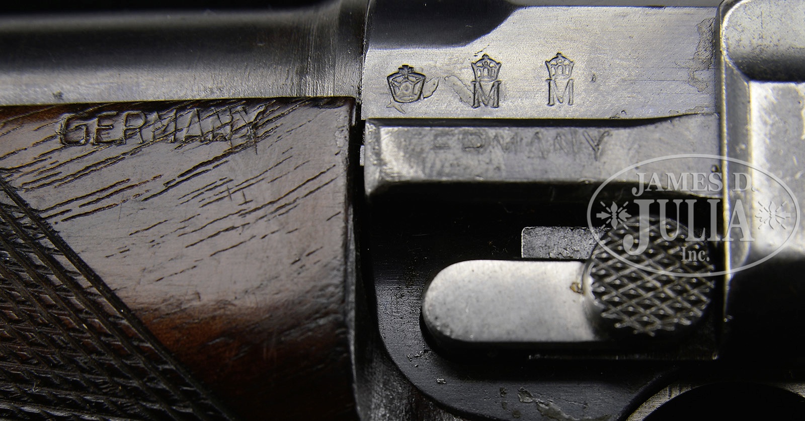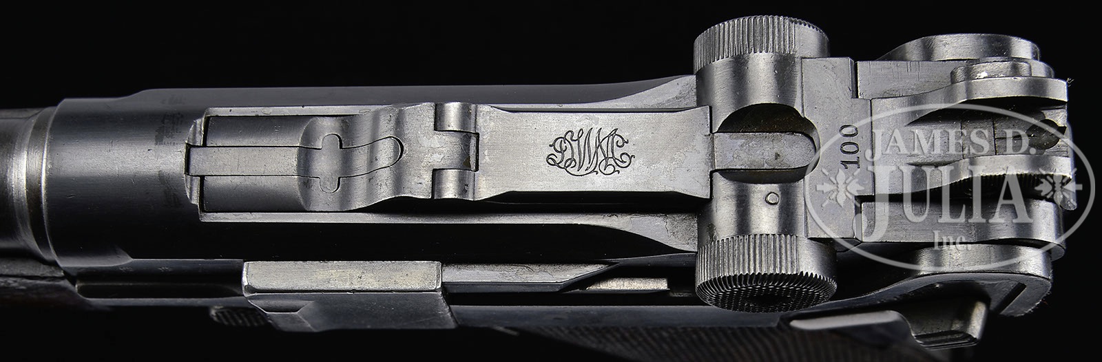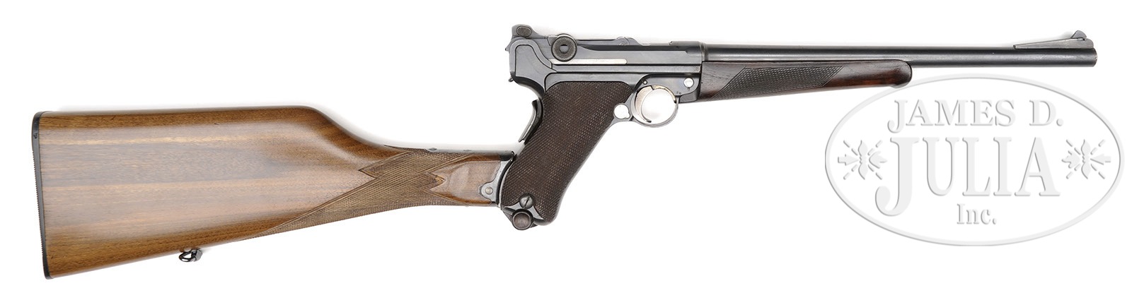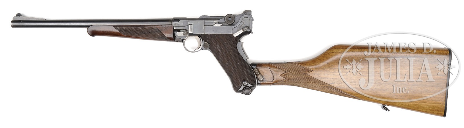 *◊ DWM 1906 NAVY/POST WW1 COMMERCIAL LUGER CARBINE CONVERSION.SN 84. 11-3/4″ 7.65 mm Cal carbine bbl with long front sight ramp. DWM scroll on center toggle link. 2-position Navy rear sight. Crown/M proofs on left receiver. “GERMANY” US import marked on left frame rail and on left side of forearm. Grip safety with safety lever that has been altered to Gesichert in the upper position. Checkered walnut grips. All numbered parts are matching. Plain wood bottom magazine with a non standard forearm lug with unique numbering on frame and lug and checkered wood forearm that attaches with a single screw. Inside of forearm has assembly/part #4. Also has a 1902 pattern stock with a SN that does not match. This gun is featured on p. 532 of The Borchardt & Luger Automatic Pistols by Joachim Gortz & Dr. Geoffrey Sturgess. PROVENANCE: Collection of Dr. Geoffrey Sturgess. PROVENANCE: Collection of Dr. Geoffrey Sturgess. CONDITION: Excellent. Retaining 97% orig blue and 50% straw that appears to have been reheated. Bore is bright and sharp with very light frosting. Grips are sharp with minor dings and indents to checkering and are oil soaked dark. Forearm is excellent with minor wear. Stock is in near new condition with sharp checkering and bright blue, straw and wood finish. Mechanics are excellent. 4-52061 BWS35 (5,000-9,000) – Lot 3082