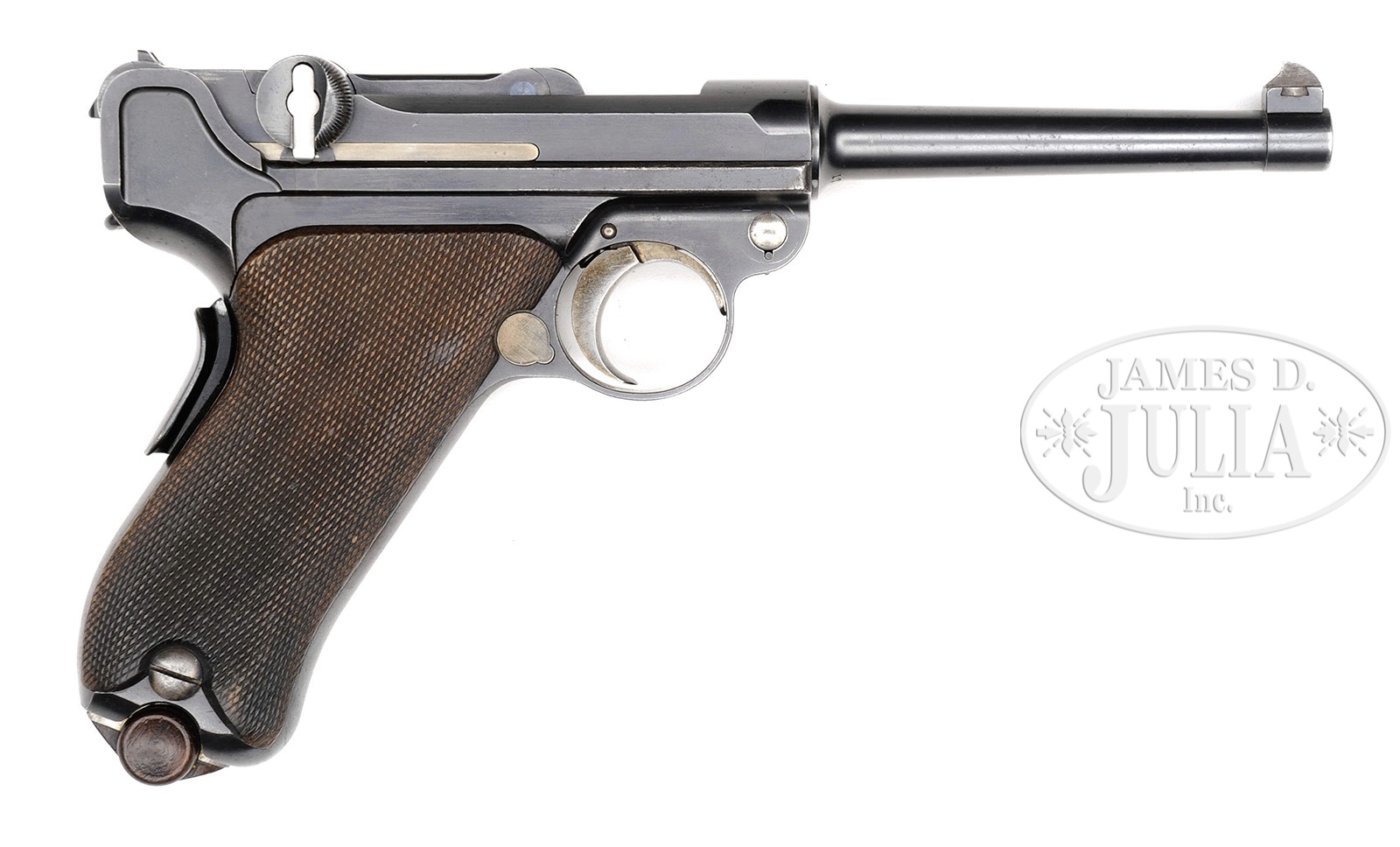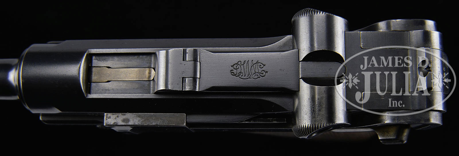 SN 17397. 4-3/4″ 7.65 mm Cal bbl with full matching SN. DWM scroll on center toggle link. Dished toggles with toggle latch. Toggle assembly, side plate and receiever have 3-digit matching serial numbers. Grip safety. Proper plain wood bottom magazine. All numbered parts are matching down to the checkered walnut grips. PROVENANCE: Collection of Dr. Geoffrey Sturgess. CONDITION: Excellent. Retaining 97% orig blue with scattered light corrosion. Orig straw is 90% with scattered light corrosion. Bore is sharp with frosting. Grips are lightly worn showing wood grain with some minor dings and dents to checkering. Magazine body has some light corrosion and there is very little wear to wood bottom. Mechanics are excellent. 4-52755 BWS17 (2,500-3,500) – Lot 3084