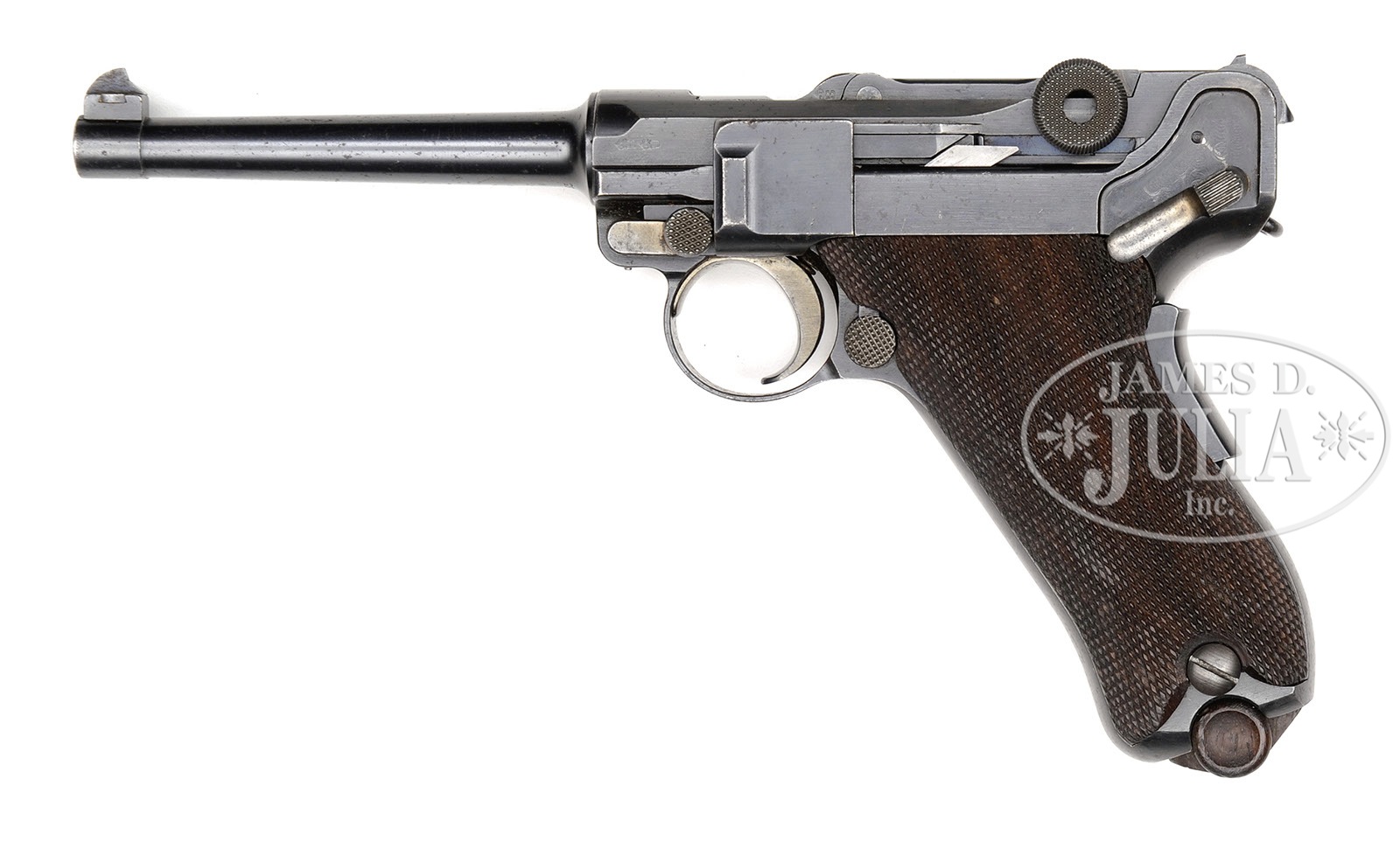 *◊ DWM 1906 7.65 MM CAL. COMMERCIAL LUGER.SN 33165. 4-3/4″ “BUG” proofed 7.65 mm Cal. bbl with full SN on bottom. “DWM” scroll on center toggle link. “BU” proofed toggle assembly and receiver. Flaming bomb proof in front frame well. Grip safety. Checkered walnut grips. Proper plain wood bottom magazine. All numbered parts are matching. This gun is featured on pp. 566 and 900 of The Borchardt & Luger Automatic Pistols by Joachim Gortz & Dr. Geoffrey Sturgess. PROVENANCE: Collection of Dr. Geoffrey Sturgess. CONDITION: Excellent retaining 97% orig blue with scattered light corrosion. Retains 70% orig straw with scattered light corrosion. Bore is lightly worn with frosting. Grips are sharp with dings and chips to the checkering. Wood grain is visible. Magazine is excellent with a few minor dings on the wood bottom. Mechanics are excellent. 4-52765 BWS26 (2,000-3,000) – Lot 3085