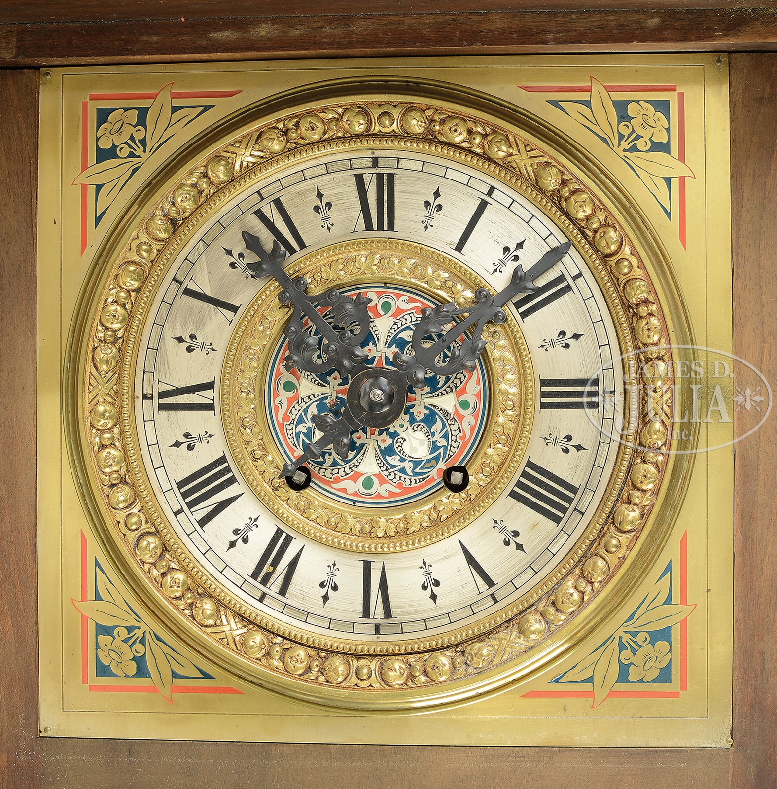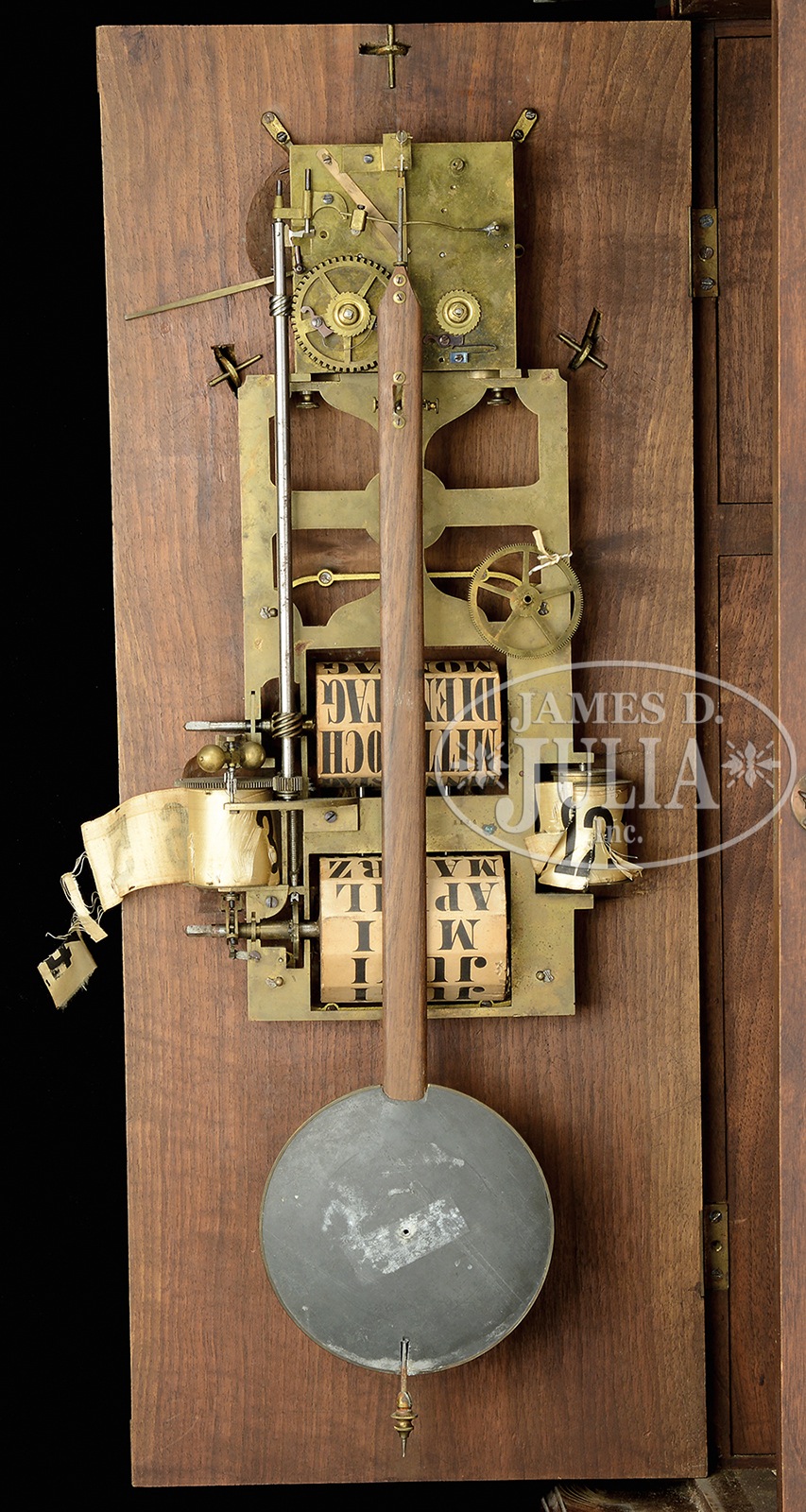 GOTHIC REVIVAL WALNUT CALENDAR REGULATOR CLOCK.First quarter 20th century, Northern Germany. This large and heavily carved regulator with peaked molded cornice beneath a scrolled crest with turned finials, a classical cast brass mask in the frieze above the bevel glass paneled door surmounted by Byzantine columns with scrolled brass capitals above cast brass female busts. Cast grotesque masks are mounted at either side of the base of door on corbels. The door with beveled glass plates. The interior fitted with a clock and calendar movement above a pendulum window, all with cast brass facings and with polychrome painted and foliate decorated back plates. The clock face with silvered Roman numeral chapter ring centering time and strike apertures with enameled inner dial. The calendar movement with three apertures, the upper aperture with days of the week, the central aperture is for the number of the date of the month, and the lower aperture with months of the year, all on silk and rotating on drums. The pendulum aperture with cast brass ring, reveals a burnished and etched brass pendulum with silvered outer ring. The pendulum decorated with entwined serpents around a central torch inscribed “VERITATEM APERIT DIES”. The molded base with carved corbels and pendant turned finials with scrolling apron with cast-brass elements of pineapple and scallop shells. SIZE: 57″ h x 20″ l 10″ w. CONDITION: The case and all cast elements in very good condition as are the dials and decorated back plates. The spring driven eight day brass movement striking on a bell is only partially assembled, missing the bell, winder and possibly missing additional cogs. The days of the week and months of the year appear intact, the 31 day silk strip is torn in half. 50743-1 (2,000-3,000) – Lot 3086