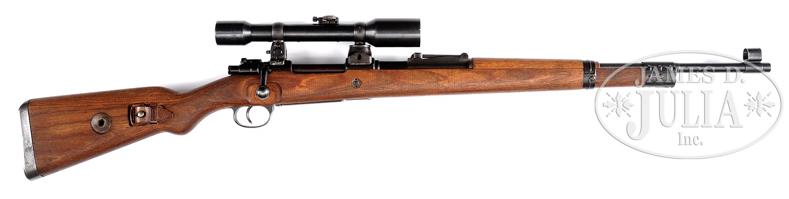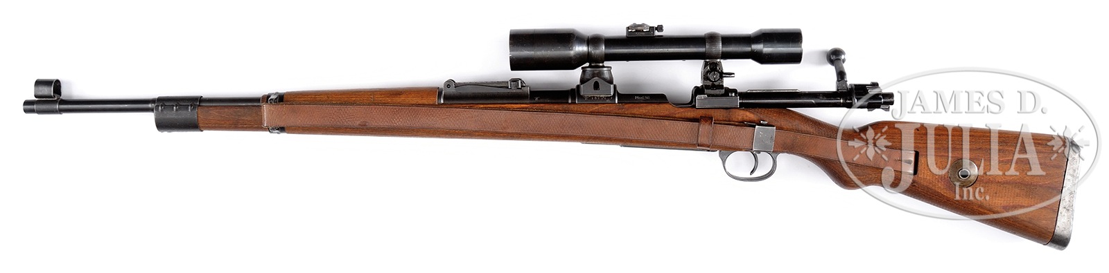 Please Note: It has been brought to our attention that some of the components including the stock were not manufactured at the same time. However, these abnormalities or misconfigurations are likely late factory production with mismatched parts or was reconfigured shortly thereafter since the gun was a “bring back” and arrived in this country shortly after the war in this current configuration. *OUTSTANDING AND HIGHLY SOUGHT AFTER GERMAN MAUSER K98K LATE WAR TURRET SNIPER RIFLE.SN 10414F. Cal. 8mm. This is a very late war turret sniper rifle as issued to snipers when they went to sniper school and carried by that sniper from that day on. Manufactured at “Mauser/Oberndorf” with final inspection eagle over 135 on left side of receiver band. Rings are SN 5934 and do not match rifle. Exhibits Kriegsmodel screw on bands, no bayonet lug, shortened sniper safety, and cupped buttplate marked “brg” (H.W. Schmidt Metalwaren). All numbers are matching and orig nothing has been altered in any way since it left the factory. Stock not numbered externally, nor any cartouches visible. Scope is an Ajack 4 X 90, SN 51799. Orig sling and sight hood present. CONDITION: Overall finish and appearance simply outstanding near mint with some brassing and loss of finish at both ends of the scope with some mottling to the gray of the buttplate. Rifle and scope are in excellent condition, probably picked up at a Depot or training school by a U.S. GI. Wood stock has some slight handling marks. Solder of scope bases visible which is a testament to the originality. These guns were made to be used, not for collectors. Bore is perfect, shiny and bright. Optics are clear. Impossible to upgrade this specimen. If you are fortunate enough to own it, you need not look at another. 50821-5 JWK63 (15,000-20,000) C&R – Lot 3087