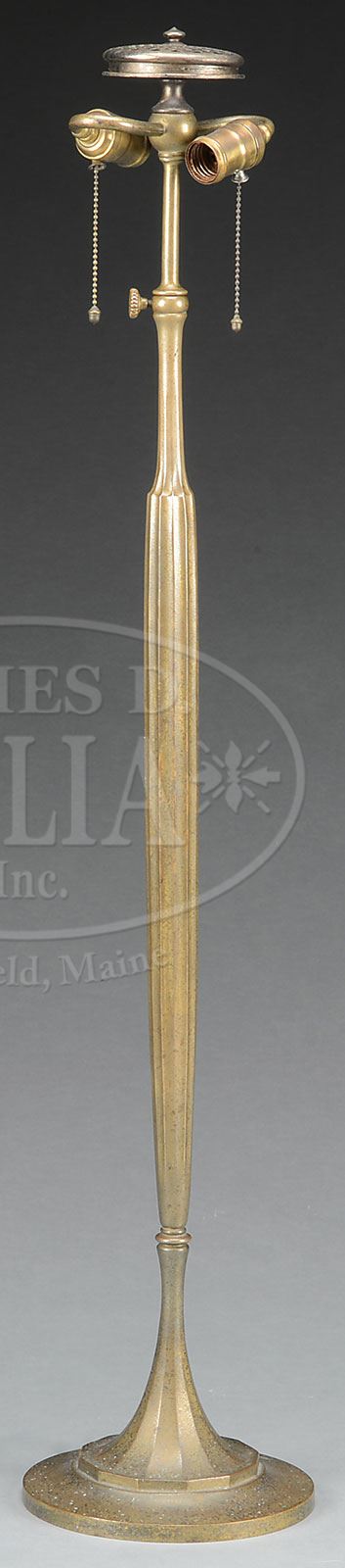 TIFFANY STUDIOS ADJUSTABLE FLOOR BASE.Tiffany Studios floor base has round platform foot with vertically ribbed stem leading to an adjustable rod that supports a 2 socket cluster. Base is finished in gold dore and has a replacement cap painted to match the color of the base. Marked on the underside “Tiffany Studios New York 578”. SIZE: Base adjusts from 41-1/2″ t to 47-1/2″ t. CONDITION: Very good to excellent with some wear and discoloration to patina, rewired with appropriate cloth cord. 5-69467 (3,000-5,000) – Lot 3088