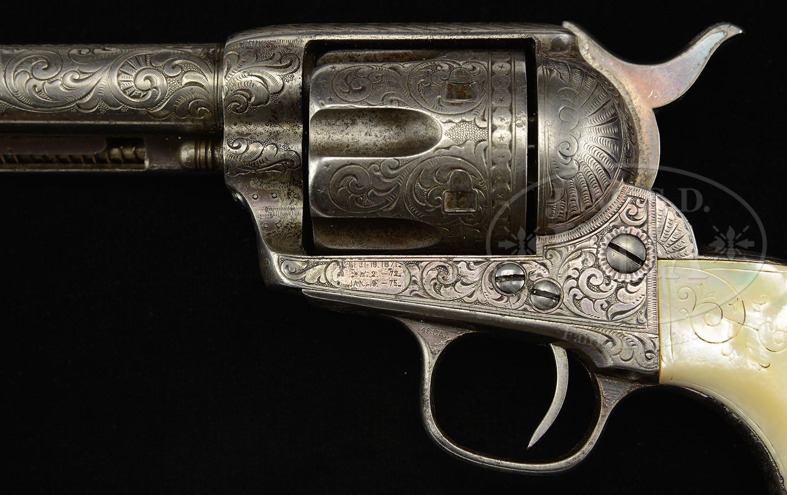 SN 95521, 111471. Cal 45 Colt. Revolvers are virtually identical with 7-1/2″ bbls and 1-line block letter addresses. Left side of frames have 3-line patent dates and left front web of trigger guards have caliber markings. They are mounted with 2-pc pearl grips, left and right hand, incise carved with a shaggy face-on buffalo head on one side and a naked lady on the other side. Both sets of grips have foliate arabesque patterns at tops and bottoms with a fine line borders. Right grip on #111471 is broken and repaired. Revolvers are identically engraved by L.D. Nimschke with nearly full coverage foliate arabesque patterns on the frames and elaborate shell patterns on the recoil shields and loading gates. Top straps are engraved in feather patterns. Almost identical matching engraving patterns extend up both sides of the bbls, over the tops between the addresses and front sights, and each side of the muzzles. Backstraps are engraved in Mr. Nimschke’s distinctive fan patterns with foliate arabesque and geometric patterns down the backstraps. Buttstraps and trigger bows are also engraved in geometric patterns. Cyl has matching foliate arabesque patterns on lands between the flutes with fine pearled panels in between and a wide square & stars border around the back edges. Ejector housings are engraved with geometric patterns in the top gullets and snake and dot patterns on the outer radii. Accompanied by a large packet of information which includes several Colt Factory letters for both revolvers. These letter identify these revolvers in cal 45 with 7-1/2″ bbls, silver finish, pearl grips, and factory engraved, shipped to William Nelson, address unavailable, on September 30, 1884, in a 2 gun shipment. The early letters list his name as “William Nelon” and the later letters show his name as “William Nelson”. These later letters also list both serial numbers in the same shipment. Additional research accomplished by previous owners disclose that Major William Nelson came from Indiana along with Judge J.B. Shackleford to Muscogee, OK, in April 1889 to establish the first court in Oklahoma, Indian Territory. Judge Shackleford was the presiding judge and he appointed Major Nelson as Clerk of the Court. The records show that Major Nelson was from Evansville, IN, a retired officer who had served in the immediate county (around Muscogee) and “in Arizona”. There is very little additional information regarding Major Nelson in this large volume of research other than he is mentioned on pps 458 & 462 of the Chronicles of Oklahoma. A copy of an article which appeared in the April 23, 1988 Oklahoman & Times newspaper is a story about the Guthrie, OK, Old Blue Belle Saloon being back in business. The article relates that on April 23, 1889 John Sampsel opened the first Blue Belle Saloon in Guthrie on a lot that he purchased from Major William Nelson for $30. Since Major Nelson was a member of the court and in Oklahoma, Indian Territory, prior to the Great Oklahoma Land Rush it is elsewhere speculated that he might have used his position to stake claims “a little early” as did many other sooners. A search of a Civil War personnel data base disclosed several hundred Union soldiers named William Nelson, so no conclusive evidence could be found that Mr. Nelson had served in the Army. Regardless of Major Nelson’s status, it is apparent that he had fine taste in firearms. PROVENANCE: Larry Scherrin Collection; Jack Slaughter; Lang Spraggins; Tom Seymour Collection; Dr. S.H. Janes Collection. CONDITION: 1) Serial number 95521: Extremely fine. Overall retains about 97-98% strong orig silver finish with only faint losses inside the cyl opening. Cyl shows equal amount of coverage and very little use, if any. Grips are extremely fine, showing very little to no wear, with good crisp carving showing and great fire and are possibly more modern replacements, carved to match. Mechanics are fine. Bright shiny bore with scattered very fine pitting. 2) Serial number 111471: Overall retains about 60-70% orig silver finish with loss areas barely distinguishable gray metal. Both left and right edges of muzzle show extremely heavy holster wear, as does the recoil shield and outer radius of ejector housing. Cyl is a gray metal patina, showing moderate to heavy wear on the engraving. Grips show moderate wear with a chipped left toe and the aforementioned repair of right grip. Mechanics are fine. Strong bore with moderate pitting. It is readily apparent that Mr. Nelson used revolver #1 and not #2. 4-51263 JR217 (60,000-80,000) – Lot 3088