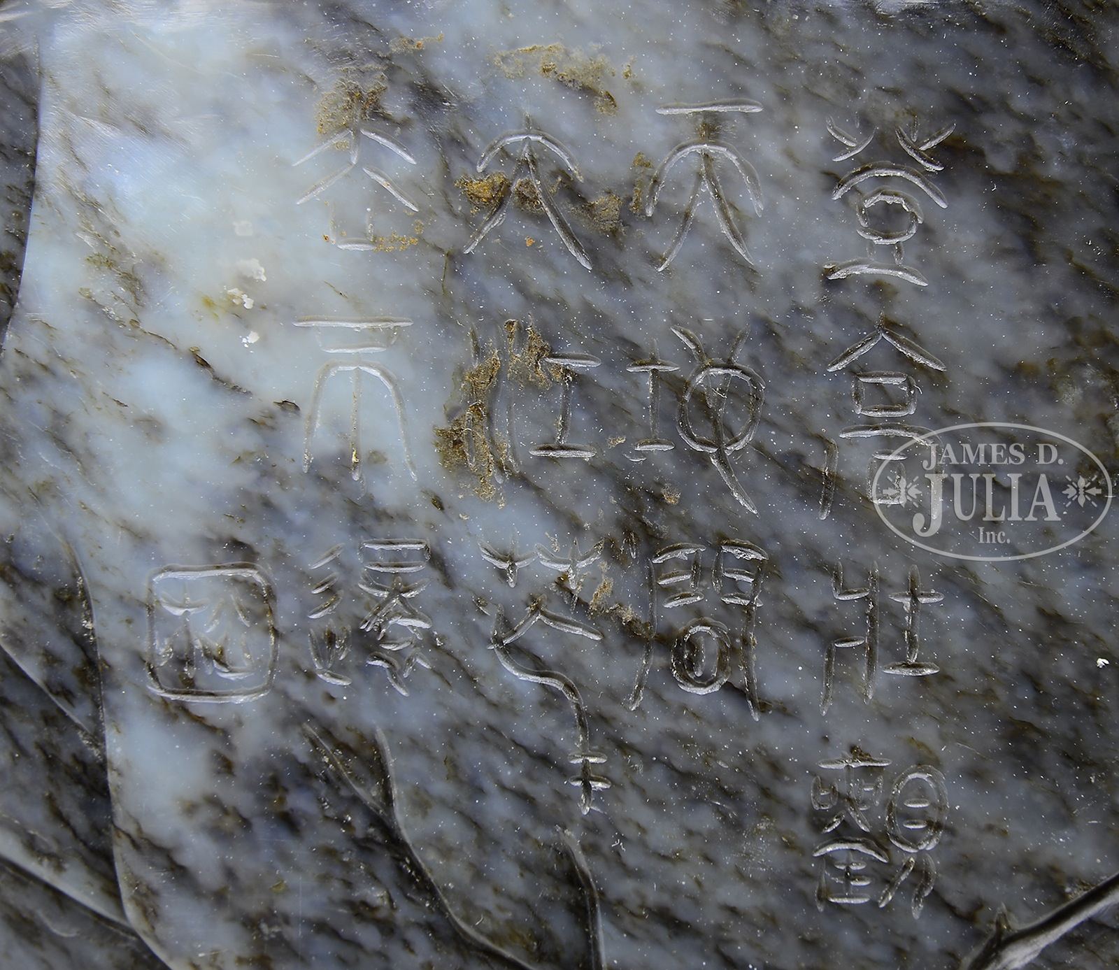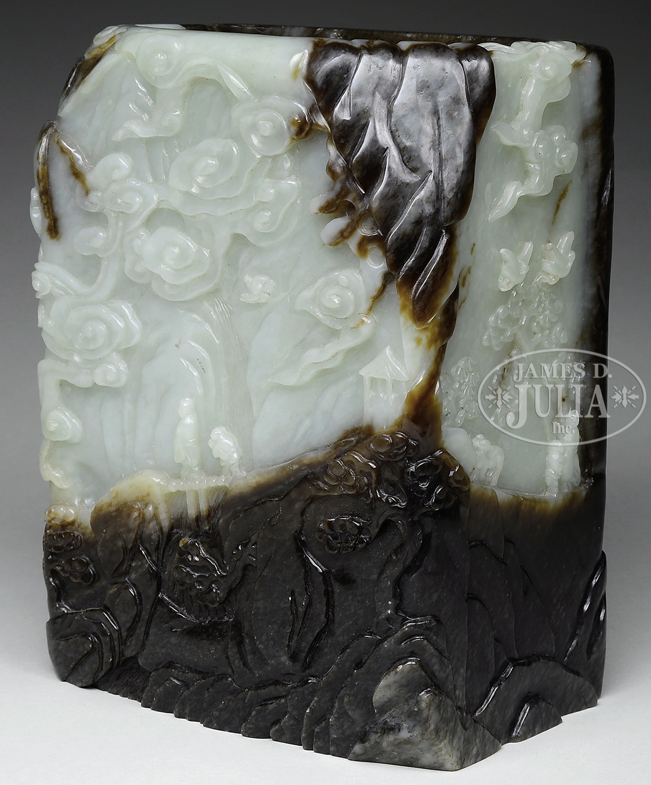 RECTANGULAR BI-COLORED BRUSH HOLDER WITH FIGURES IN LANDSCAPE.20th century, China. Nephrite: Greyish yellow-green (celadon) with large areas of dark brown. Inscription: Thirteen-character seal script text reading : “To mount high to view the spectacle between sky and earth (i.e., in the world), the big river is wild and goes beyond return”, followed by a seal reading “Pine”. A handsome, boldly carved work, this flat-based brush holder makes clever use of its two widely differing tones to create a landscape scene of the type found on Qing jade and bamboo brushholders (Wang, p. 120, #64, for example). The indebtedness of these forms to the painting medium is undeniable. The deep brown craggy mountain foreground, through which a stream flows, gives way to a lighter-toned cloudy region, with a small hut and a distinguished figure walking down a path and over a bridge below a waterfall, followed by a smaller, stoop shouldered attendant; other figures approach around the side. The rapidly-flowing stream culminates in heavy waves at one side, while on the other, a man with an attendant observes two flying birds, and a deer enters the scene at the lower left. The clouds are lingzhi (magic fungus)-shaped, and no doubt there are longevity implications throughout the work. The poem on the reverse is an apt description of the scene on front and side. Though the rectangular form is not as common for brush holders as round or ovoid forms, there are other known examples such as the nine-dragon rectilinear brushholder of the 18th century in the National Palace Museum, Beijing (Keverne, p. 172, #112). This massive (15 lb., 7 kg.) brushholder from the Yangtze River Collection is a relatively recent production, though in the style of the 18th century, and illustrates the strength of tradition continuing into modern workshop productions. Reference: The Yangtze River Collection, Later Chinese Jades published by Helga Wall-Apelt, 1993. SIZE: 9.5″ x 7.13″ x 4.75″. (24.1 x 18.1 x 12.1 cm.) PROVENANCE: The Personal Collection of Dr. Helga Wall-Apelt. CONDITION: Very good with polished surfaces. 47671-99 (15,000-25,000) – Lot 3088
