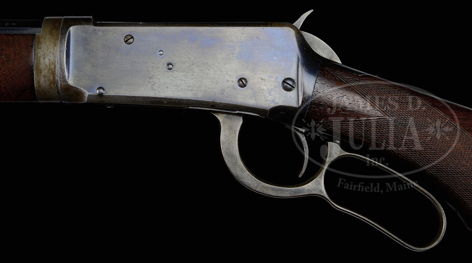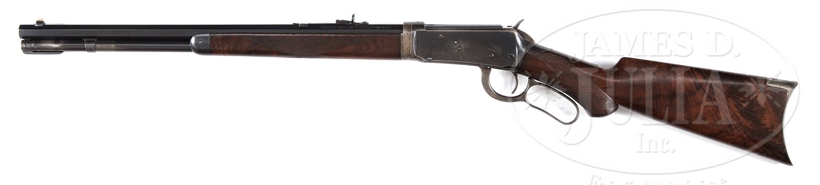 *DELUXE WINCHESTER MODEL 1894 LEVER ACTION SHORT RIFLE.SN 122220. Cal. 32 WS. Deluxe ’94 with 24″ oct bbl, full magazine, take down, half nickel front sight with screw and full buck horn rear sight. Mounted with about 3-X, center crotch, flame grain American walnut with H-style checkered forearm that is 9-3/8″ long and capped pistol grip stock with crescent buttplate. Left side of lower tang, under the wood is marked with the assembly number “1208”, “XX” and 2 or 3 other small symbols. Matching assembly number is found on rear face of buttstock under the buttplate along with “94”. Buttstock has a repaired chunk out of the toe that emanates through the lower buttplate screw. Accompanied by a Cody Firearms Museum letter which identifies this rifle in Cal. 30, oct bbl, plain trigger, oil finished, checkered, pistol grip stock and take down, received in warehouse February 21,1902 and shipped July 17,1902 to order # 147720. It is readily apparent that this rifle was returned to Winchester and re-barreled to its current length and caliber. Receiver ring and bbl have the “WP” proof mark which did not come into general use until late 1905. Unfortunately the records do not show a returned and repaired entry, but there is no doubt that this is factory work. CONDITION: Fine, all matching. Buttplate is un-numbered. Bbl retains about 98% strong orig blue with very light sharp edge wear. Magazine tube retains about 85% orig blue with wear around the magazine band from take down. Forend cap retains about 95% orig blue and the bbl extension is a silver brown patina, possibly with touch-up. Receiver retains about 75% thinning orig blue, showing sharp edge wear and worn to gray on the bottom. Hammer retains strong case colors, moderately faded and lever faded case colors on sides turned silver on outer faces. Buttstock has a repaired toe, otherwise wood is sound and retains most of an old, very light restored finish. Mechanics are fine. Bright shiny bore. 49432-12 JR C&R (7,500-12,500) – Lot 3091 Click here to view provenance