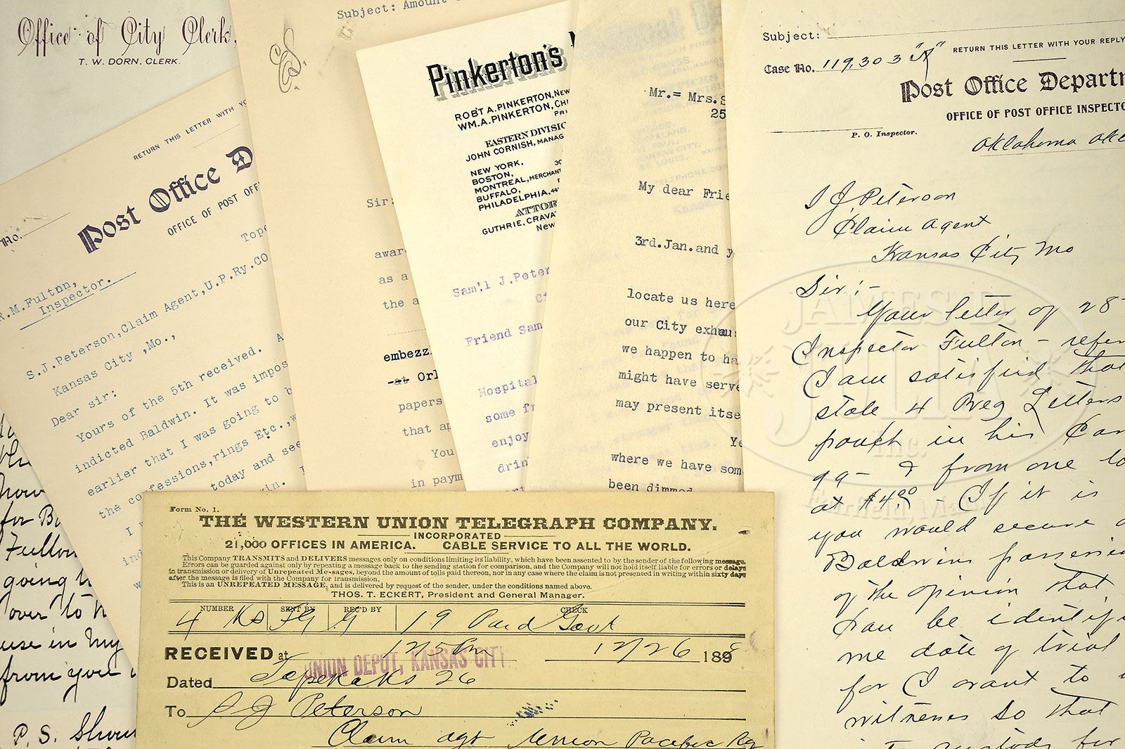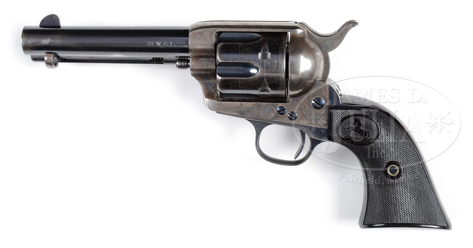 EXCELLENT COLT SINGLE ACTION ARMY REVOLVER OF KANSAS CITY POLICEMAN SAMUEL PETERSON & ARCHIVE.SN 143558. 38-40 Cal. Hard rubber rampant Colt grips. Gun is excellent overall condition retaining most of its orig finish. Factory letter confirms configuration. Shipped December 2, 1891 to Schmelzer & Sons, Kansas City, Kansas. This gun descended in the Peterson family being sold by Peterson’s grandson, and affidavit accompanies along with numerous family letters and other documents. Samuel Peterson was born near Liberty, MO in 1860 and became a Kansas City Police officer August 15, 1885. Peterson would remain in police work until his retirement from Union Pacific RR in 1930. Peterson had an interesting start to police work by being charged with murdering a man he arrested in September 1887. A year would pass with over 50 witnesses called in Kansas City trial before he was found “not guilty” in November 1888. The 6’1”, 240 pound Peterson would move on to a “claim agent” for the Union Pacific Railroad. There are seven orig letters & telegraphs to Peterson from 1889-1901 concerning criminals accused of crimes against the RR. Peterson received a $100 reward for service leading to arrest and conviction of a mail thief in 1901 from the U.S. Post Office Dept. There are other letters, one from Pinkertons on their stationary written in 1904. Wonderful archive should be read by those interested. The newspaper accounts of this trial read like a modern soap opera. There is also a very interesting “police code” book Barnard’s Criminal Cipher Code 1895 which was used for telegraphic communication between Chiefs of police, sheriffs, Marshals and other peace officers. 63 pages long with additional 1896 list of police agencies who have this code book listed by state and territory. PROVENANCE: Samuel Peterson. Peter Peterson. CONDITION: Very fine and excellent overall. Bbl and ejector housing retain about 90% bright blue, thinning in areas and a rubbed patch about 1” long on bottom next to ejector housing. Cylinder has about 80% orig polish, thinning with vivid blue in flutes and darker blue on remainder with thinning. Backstrap and trigger guard retain about 80% bright blue. Case colors are 90% intact overall though some muted, silver color on remainder, top strap has less color. Stocks well fit with good black color, some small nicks and dents on buttstrap and grip. Action is crisp and bore is bright. 4-54410 JS269 (10,000-20,000) – Lot 3095 Click here to view provenance
