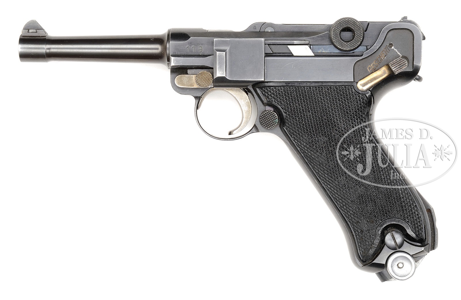 *◊ RARE AND BEAUTIFUL POST WAR KRIEGHOFF LUGER SN 119.SN 119. 4″ 9mm Muaser bbl with Eagle/135 proof on upper left. HK Anchor/KRIEGHOFF SUHL on center toggle link. Krieghoff Eagle 2 proofs on right side of receiver and right frame rail. Large digit 119 SN on left receiver and front of frame. Small parts are unnumbered. Sideplate has large matching number on back. Proper Krieghoff black plastic grips with border. Plain bottom machined FXO Eagle/37 proofed magazine. This gun is featured on p. 622 of The Borchardt & Luger Automatic Pistols by Joachim Gortz & Dr. Geoffrey Sturgess. PROVENANCE: Collection of Dr. Geoffrey Sturgess. CONDITION: Excellent. Retaining 97% bright blue with silvering on sharp edges. 95% orig bright straw. Bore is bright and sharp. Grips are sharp with some minor chips to checkering mostly on left grip. Magazine is excellent with very little overall wear. Mechanics are excellent. 4-52999 BWS52 (8,000-14,000) – Lot 3096