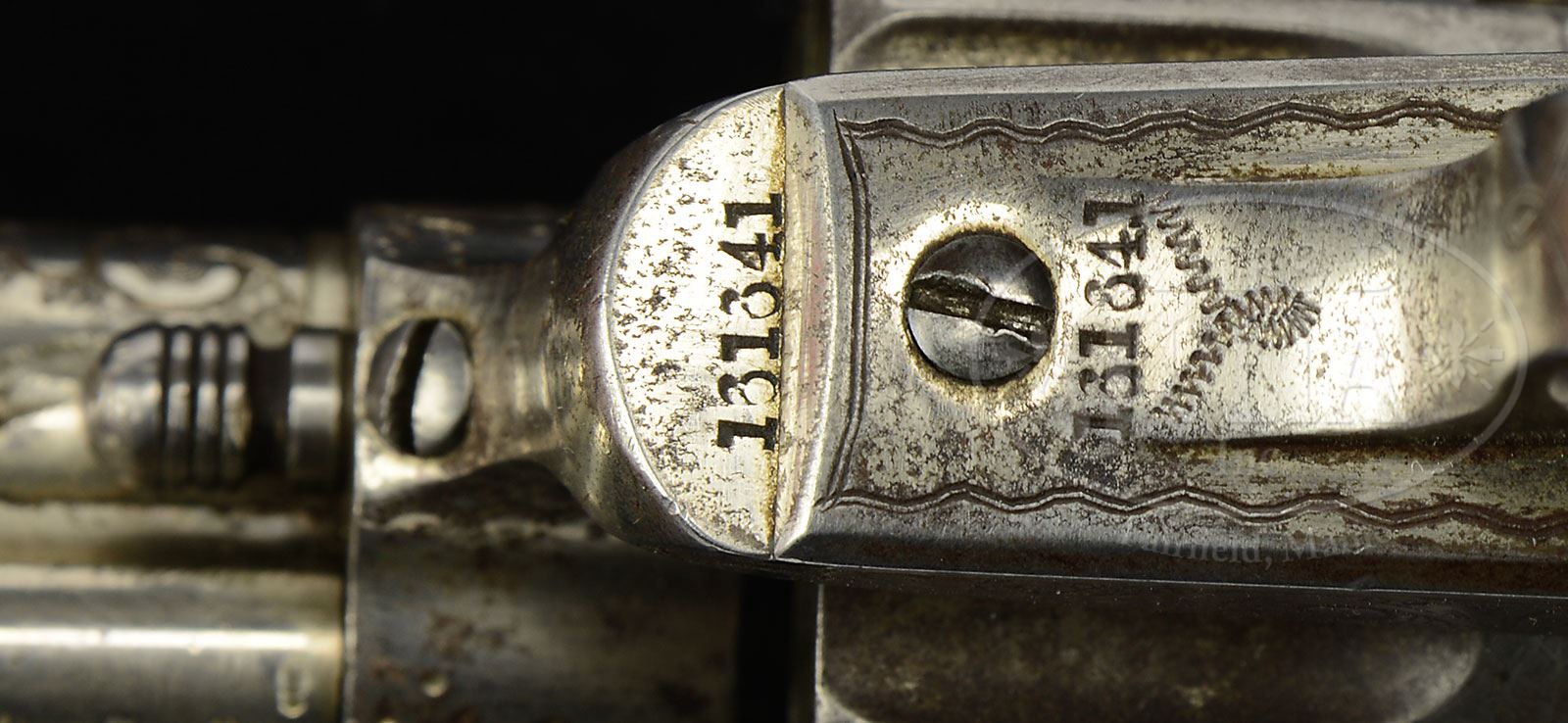 ENGRAVED COLT SINGLE ACTION ARMY WITH FACTORY CARVED PEARL GRIPS WITH TEXAS HISTORY.SN 161641. 45 Cal. Nickel finish with 4-3/4″ bbl with 2-line Hartford address. Full front sight. Left side of frame stamped with 2-line 3-patent dates. Mounted with carved American eagle pearl grips. Factory letter states gun was sold April 5, 1895 to Simmons Hardware in St. Louis, MO but shipped to Matthews & Royalty. Factory letter states correct cal. bbl length, finish and “carved pearl with American eagle” though there is no mention that gun was engraved. Other Simmons Hardware guns often lack this mention though this gun was no doubt engraved contemporaneous to shipping. According to 1963 letter from Brunelle R. Moon a Major in the US Air Force certified that he inherited this gun from his uncle Jack Moon in 1934 and that his uncle had related a story that the gun had come from a gambler who had “hocked” it and never returned as he died a violent death in a card game somewhere in Texas in the early 1900s. Jack Moon retained the revolver and carried it as a side arm when he served as a law enforcement officer in Gatesville, TX. It was used to apprehend several horse thieves and two persons who attempted a train robbery. Brunelle also stated he carried the gun through all of WW2 but, “there was no special glory attached to it as nearly all my duty was stateside”. It is interesting to note the progression of the price of this gun. When this gun left the factory in 1885 its total cost was $25.37. Then early in the 20th century it was pawned for $100.00 and then sold in 1963 to Lewis Yearout from descendent of orig owner. This gun has not been offered since that date over 50 years ago. PROVENANCE: Jack Moon. Brunelle Moon, 1934. Lewis Yearout, 1963. Estate Collection of Lewis & Leyton Yearout. CONDITION: Bbl and ejector housing retain about 90% orig finish. Frame, trigger guard and backstrap retain about 50% finish. Hammer which is un-engraved matches gun well with 80-90% orig nickel. Cylinder retains traces of orig nickel in flutes and stops. Grips fit gun well. Small chips on right rear toe and left forward toe, two 1/2″ glued chip repairs made to each grip where they meet frame and grip straps as can be seen in photographs. 4-53891 JS20 (7,000-9,000) – Lot 3097 Click here to view provenance