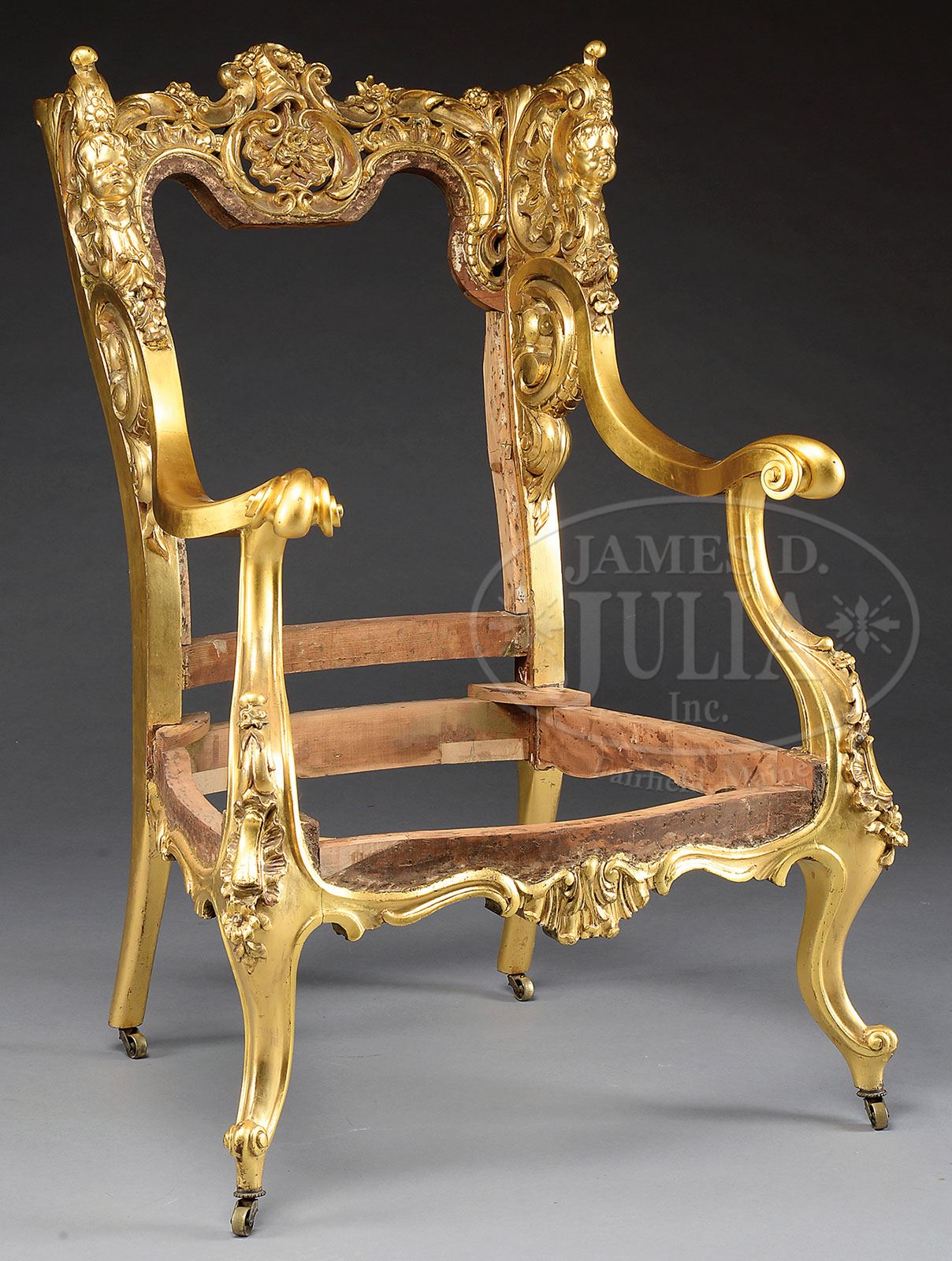 ROCOCO CARVED GILTWOOD ARMCHAIR. Last quarter 19th century, Eastern European. The rectangular back with ornately carved crest rail decorated with molded C-scrolls, floral clusters and leaf tips joined to winged sides similarly carved, each centering a bust of a cherub, continuing to downscrolled arms with dramatic rolled hand grips, the sides with volutes, on shaped and molded supports carved with flower heads centering a trapezoidal seat frame with serpentine front rail, the central shell carving raised on frontal dramatic cabriole legs terminating in snails feet raised on brass casters. SIZE: 44-1/4″ h. Overall: 28″ w. Seat frame: 14-3/4″ h. CONDITION: Chair retains original gilded surfaces, upholstery has been removed, frame structurally very good. 9-90152 (750-1,250)