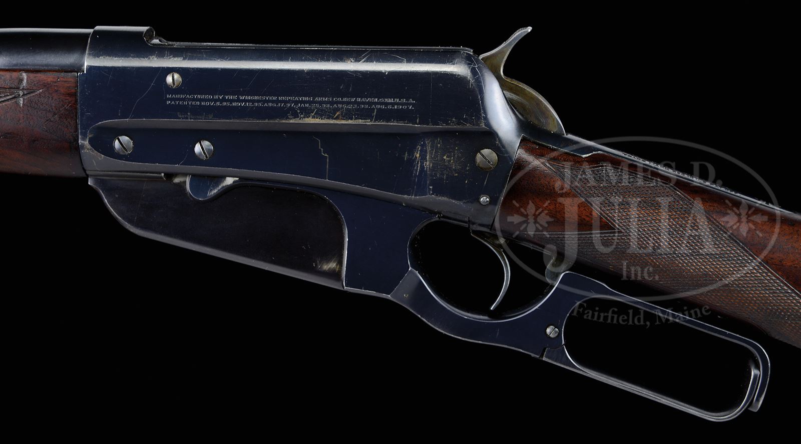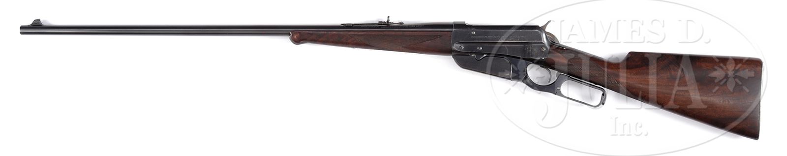 *WINCHESTER MODEL 1895 DELUXE LEVER ACTION RIFLE WITH SHOTGUN BUTT.SN 67890. Cal. 30 ARMY 28″ bbl, blue finish. Highly figured checkered stocks with shotgun buttplate. PROVENANCE: The Estate Collection of Phil A. Bleakney, Jr. CONDITION: Very fine, bbl retains 95% blue with only minor muzzle wear and a few light scratches. Receiver retains 95% blue with miniscule scratches overall and high point wear. Bore is frosty with strong rifling. Bolt is blue with slight staining. Magazine retains 50% blue drifting to gray. Lever retains 90% blue with light scratching overall. Hammer shows 80% case color with some scratching on left side. Stocks are very good with highly figured crotch grained walnut, checkering is sharp, small repair at left wrist of stock, a few minor dents and bruises commensurate with the age of the rifle. Forend has an ebony insert at the Schnabel tip. Buttplate shows a sliver/gray patinated finish. This is a very nice deluxe ’95 rifle in a great caliber. 49059-48 TEP C&R (4,000-6,000) – Lot 3101