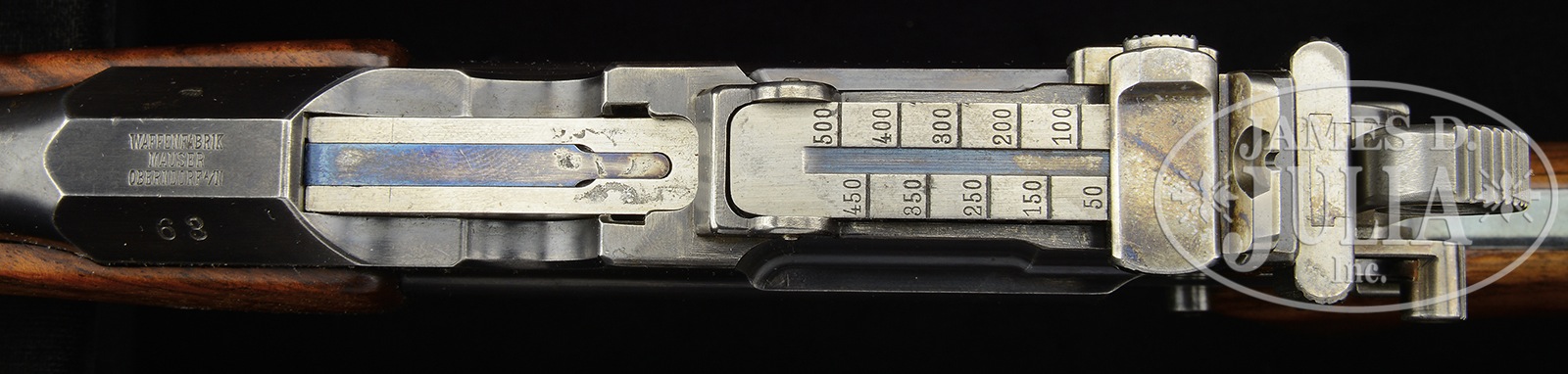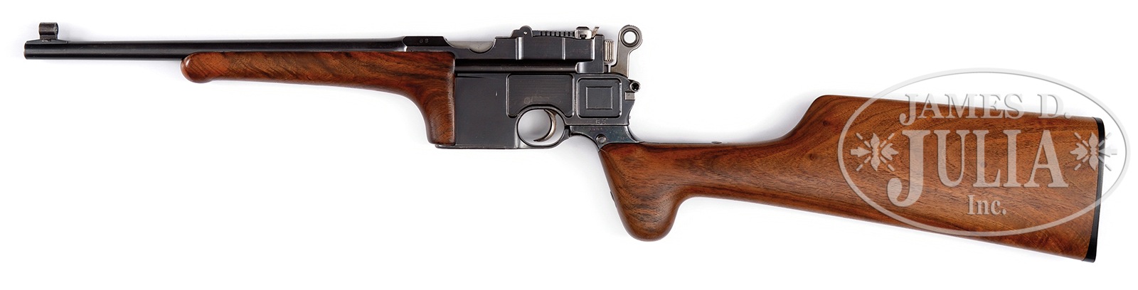 ◊ SCARCE MAUSER C96 CARBINE, EARLY LARGE RING TRANSITIONAL.SN 63. Cal. 7.63 mm. Mauser made very few Early Large Ring Transitional carbines that shared the same receiver and trigger assembly as the earlier Conehammers. Unlike its predecessor, these guns had a tapered bbl with a short ramped serrated sight base and a hooded front sight with a bead insert. This example has a 11.75″ bbl and a pinned 50-500 rear sight. Chamber is marked with a 3-line address “WAFFENFABRIK MAUSER OBERNDORF A/N”. The SN 63 is on left chamber flat and repeated on left side of receiver. In the central recess of the receiver is a small rectangular insert that appears as an old factory repair. The left side bbl extension is marked with a Crown/Crown/U. An antler proof is on the right chamber flat. Other features include long extractor and separately retained firing pin. The bbl/bbl extension, frame and floorplate are rust blued while the extractor, components of rear sight, bolt stop, firing pin retainer, safety and shoulder stock lug are fire blued. In this case, all components are matched to SN 63 except for the buttstock that is from a different gun and cannot be easily released from the receiver. The buttstock is numbered “1004” and has an orig horn buttplate molded with the intertwined “MW” monogram. PROVENANCE: The Friedrich-Wilhelm Dauphin Collection, Germany. CONDITION: The Carbine retains about 97% rust blue with mild thinning and sharp edge wear. The fire blued parts have largely faded except the buttstock lug that retains most of its orig blue, nicely complementing the balance of the gun. Both the forend and buttstock have been lightly refinished to present a uniform, pleasing color and surface. 49828-6 LMA (13,500-22,500) – Lot 3103