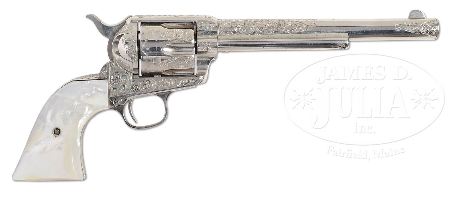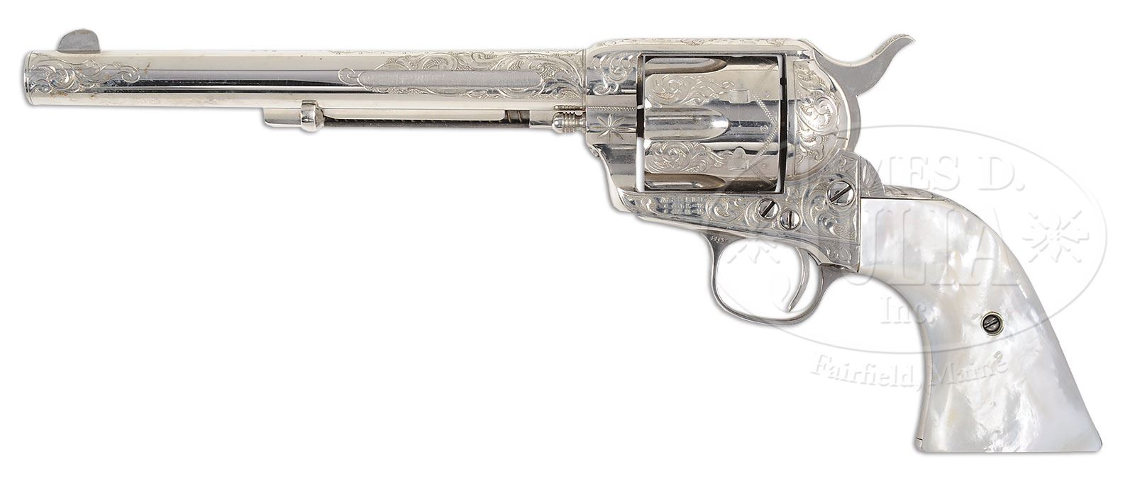 RARE ENGRAVED COLT FRONTIER SIX SHOOTER SINGLE ACTION ARMY REVOLVER.SN 8819. Cal. 44 WCF (44-40). Nickel finish with 7-1/2″ bbl, full front sight and 1-line block letter address with etched panel “COLT FRONTIER SIX SHOOTER” and a tiny “44” on the bottom. Left side of frame has 3-line patent dates and left front web of trigger guard is marked “44 CF”. Mounted with replacement, 2-pc, smooth pearl grips. Revolver is very nicely engraved in New York style from the Nimschke shop in L.D. Nimschke patterns with about 70% coverage foliate arabesque patterns on the frame which extend up the sides of the bbl and sides of the muzzle with geometric, snake & dot patterns around the address. Top of backstrap is engraved with Mr. Nimschke’s typical shield pattern. Cyl has matching engraving on lands between the flutes with a zig-zag & dot pattern around the back edge. Ejector housing is 3rd type with half moon ejector rod head and base pin is orig type with dimpled ends. Accompanied by a Colt Factory letter which identifies this revolver in caliber 44-40 with bbl length and types of stocks not listed, finish “soft”, and shipped to Hartley & Graham, New York, NY on Feb. 17, 1883 in a 25 gun shipment. Remarks section states that “the word ‘soft’ which appears with the finish indicates subject revolver was shipped without final finishing for engraving outside our factory”. Hartley & Graham was one of Colt’s major distributors who contracted with several of the New York area engravers to embellish various firearms, of which this is one. They were one of Mr. Nimschke’s major customers. PROVENANCE: Collection of John Montague. CONDITION: Very fine. Overall retains about 98-99% crisp restored nickel finish with a completely legible etched panel which may also be restored; grips are sound with great fire & color; hammer is not solid in safety notch, otherwise mechanics are fine; strong frosty bore. 4-54335 JR177 (7,500-12,500) – Lot 3104 Click here to view provenance
