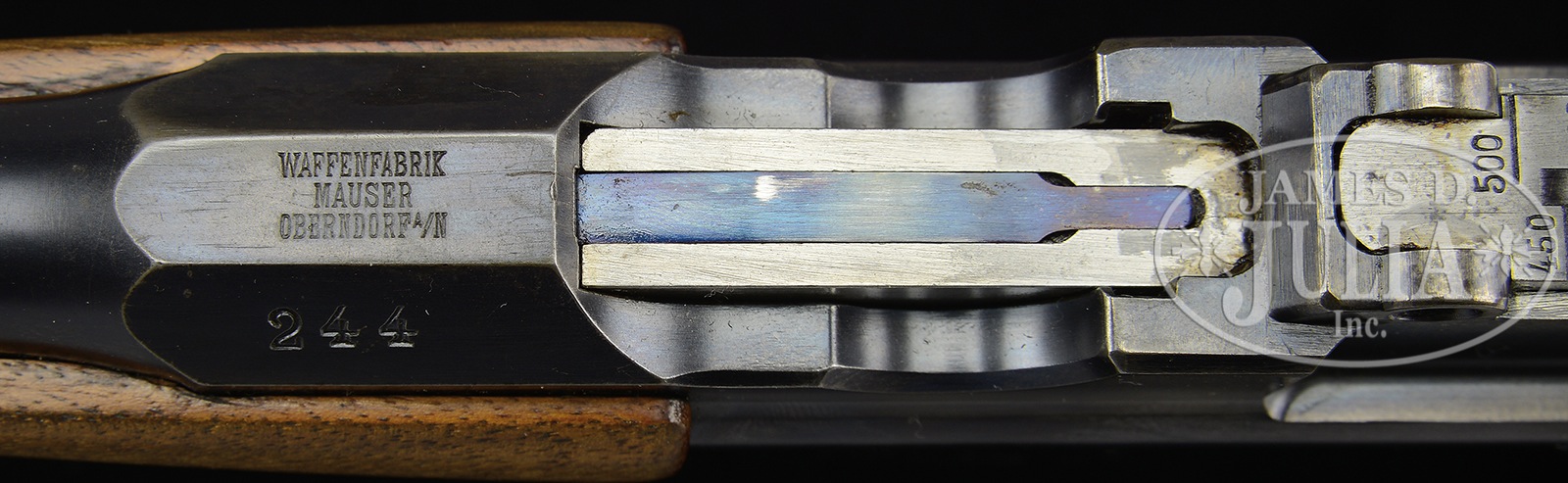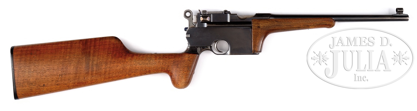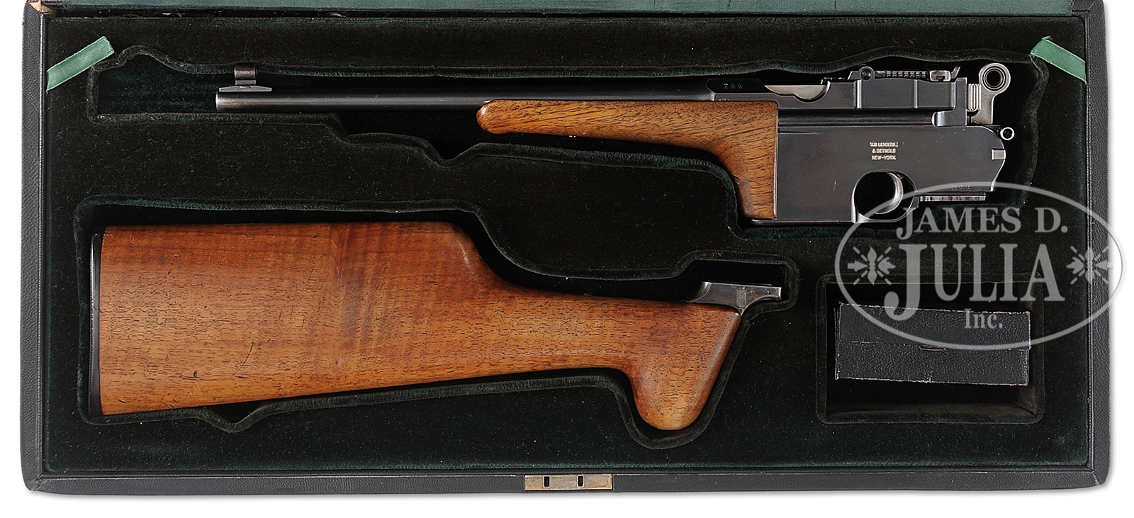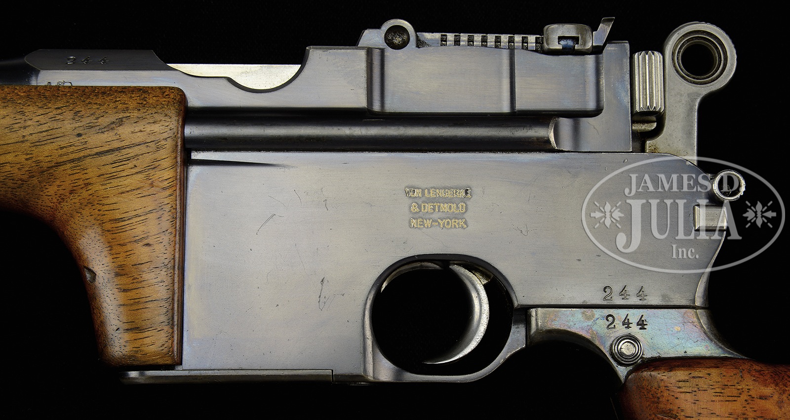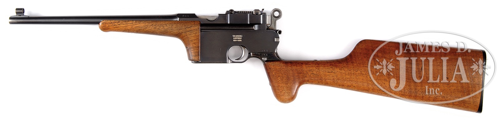 *◊ EXCELLENT MAUSER C96 FLATSIDE CARBINE WITH 12″ BARREL, VL&D, IN PRESENTATION CASE.SN 244. Cal. 7.63mm. Mauser made approximately 200 Large Ring Flatside carbines. This example has a 12″ bbl with a hooded, drift adjustable bead front sight and a slip-in 50-500 rear sight. The elongated chamber is marked with the usual Mauser address while SN “244” is on the left chamber flat; antler acceptance is on the right chamber flat. Left side of the frame is retailer marked “VON LENGERKE/& DETMOLD/NEW-YORK”. The SN is repeated on the left side of the frame and on the left side of the stock iron at their juncture. SN “244” is additionally marked under the rear sight bar and back of the hammer. Limited disassembly shows the matching SN on the follower, floorplate, firing pin retainer, bolt and firing pin. Major components are rust blued. The extractor, the usual components of the rear sight, the firing pin retainer, bolt stop, safety and stock lug are fire blued while the trigger and attendant housing are in-the-white. Standard smooth forearm and buttstock that has an orig Mauser buttplate with an intertwined “MW”. Accompanied by a high quality black, leather bound and weighted, presentation case measuring 23-3/4″ x 11″ x 3″. An oval unmarked silver plated plaque measuring 2-1/8″ x 1-1/4″ is mounted on the lid that is lined with green cloth having gold imprint “WAFFENFABRIK MAUSER/AKTIENGESELLSCHFT/OBERNDORF a NECKAR/(Deutsches Reich)”. Compartmentalized base, lined in dark green velvet, made to separately hold the top assembly of a longer barreled carbine, buttstock and ammunition. Included is a single reproduction black leather ammo case. PROVENANCE: The Friedrich-Wilhelm Dauphin Collection, Germany. CONDITION: Approx 95-97% bright orig rust blue with muzzle and sharp edge wear reflecting careful use. Comparable condition fire blue on all small parts except stock lug that shows more oxidative change, particularly on the upper and lower arms. Forearm and buttstock retain most orig light varnish with scattered handling dings. No discernible cracks or significant losses. Near excellent buttplate. Bright bore with sharp rifling. Perfect manual mechanics. Excellent condition presentation case and ammo box with scattered marks and scuffs applied to reflect appropriate aging. 49828-16 LMA (13,500-19,500) C&R – Lot 3104