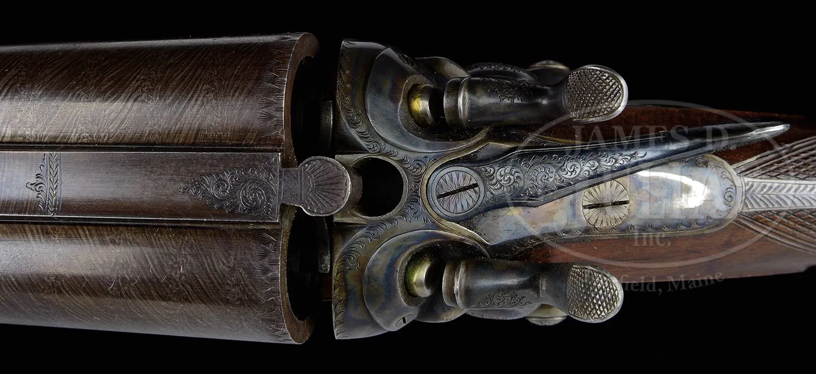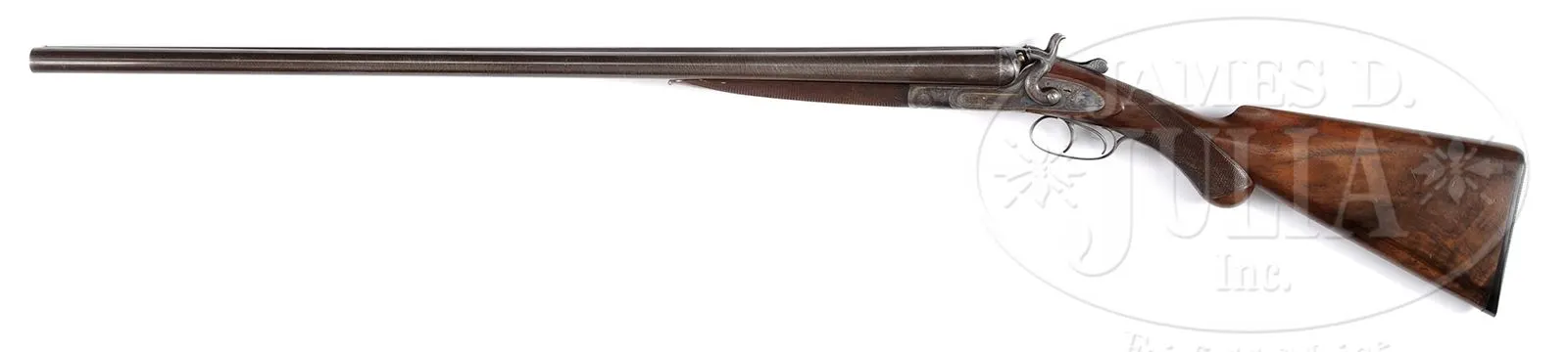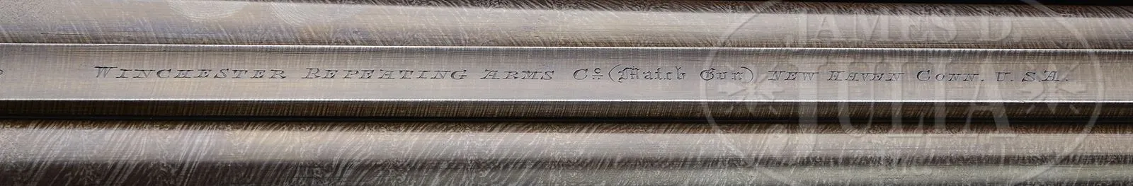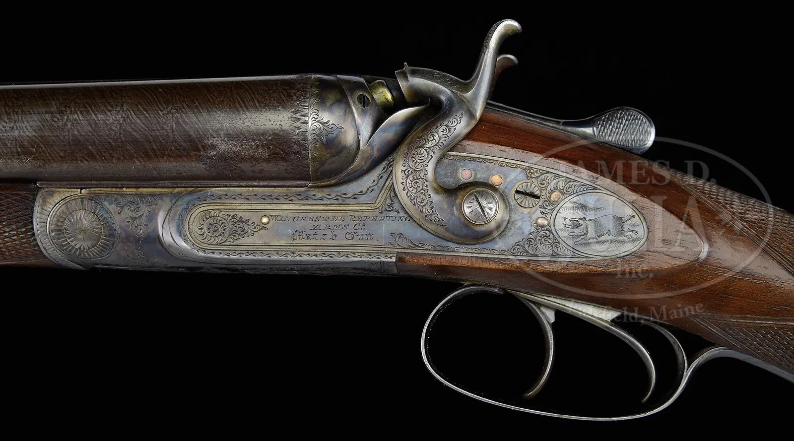 RARE WINCHESTER MODEL 1879 MATCH GRADE DAMASCUS DOUBLE BARREL SHOTGUN.SN 1185. Cal. 12 ga. Beautiful Winchester Match Gun with 31″ fine Damascus bbls with dolls head rib extension and single silver bead. Rib is marked with the Winchester Company name & address and “(Match Gun)”. Receiver, lockplates & hammers are beautifully engraved with the oval vignettes of a running Spaniel on the left lockplate and a Pointer on the right. Lockplates are also engraved “WINCHESTER REPEATING / ARMS CO. / Match Gun”. Engraving consists of fine English scrolls with about 65-70% coverage and extends onto the rib and opening lever with light patterns at the breech end of the bbls. Trigger guard is engraved with intertwined initials that are difficult to decipher. Receiver has raised filed, shielded fences. Mounted with very nicely figured European walnut including full checkered splinter forearm and rnd knob stock with checkered horn buttplate. It is generally reported that there may have been as many as 10000 of these shotguns sold by Winchester 1879-1884. They were produced in 5 grades, 10 & 12 ga and 30 & 32″ bbls. Winchester apparently contracted for these shotguns with a variety of English gunmakers. The Match Grade guns, represented here are the highest grade offered by Winchester. CONDITION: Extremely fine plus (no disassembly was effected to check for matching numbers). Bbls retain about 98-99% crisp, orig brown Damascus pattern with some faint thinning over the forearm area. Receiver, lockplates & hammers retain virtually all of their bright, orig case colors. Trigger guard retains about 60% fire blue and the opening lever about 90% fire blue. Top tang has faded to silver. Wood is sound with a few light nicks & scratches and retains virtually all of its orig, crisp oil finish. Mechanics are crisp. Bright shiny bores. 48568-6 JR (7,500-12,500) – Lot 3105