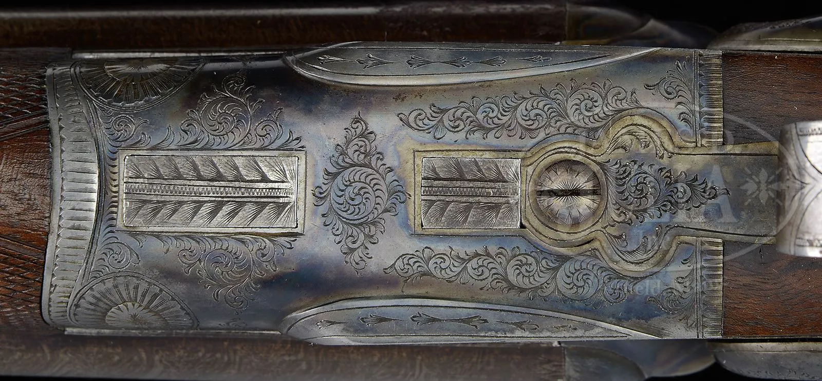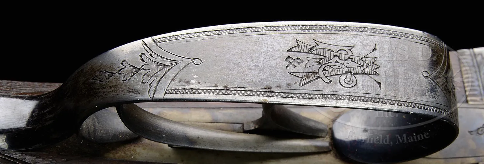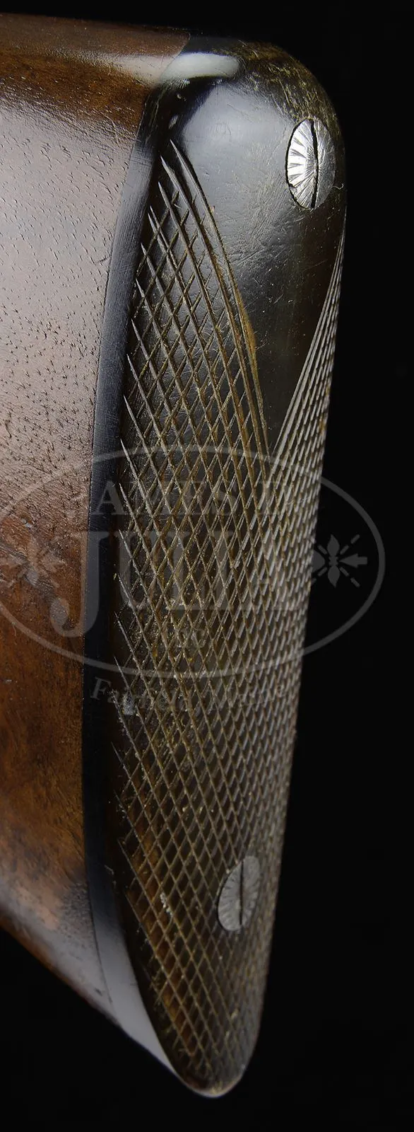 RARE WINCHESTER MODEL 1879 MATCH GRADE DAMASCUS DOUBLE BARREL SHOTGUN.SN 1185. Cal. 12 ga. Beautiful Winchester Match Gun with 31″ fine Damascus bbls with dolls head rib extension and single silver bead. Rib is marked with the Winchester Company name & address and “(Match Gun)”. Receiver, lockplates & hammers are beautifully engraved with the oval vignettes of a running Spaniel on the left lockplate and a Pointer on the right. Lockplates are also engraved “WINCHESTER REPEATING / ARMS CO. / Match Gun”. Engraving consists of fine English scrolls with about 65-70% coverage and extends onto the rib and opening lever with light patterns at the breech end of the bbls. Trigger guard is engraved with intertwined initials that are difficult to decipher. Receiver has raised filed, shielded fences. Mounted with very nicely figured European walnut including full checkered splinter forearm and rnd knob stock with checkered horn buttplate. It is generally reported that there may have been as many as 10000 of these shotguns sold by Winchester 1879-1884. They were produced in 5 grades, 10 & 12 ga and 30 & 32″ bbls. Winchester apparently contracted for these shotguns with a variety of English gunmakers. The Match Grade guns, represented here are the highest grade offered by Winchester. CONDITION: Extremely fine plus (no disassembly was effected to check for matching numbers). Bbls retain about 98-99% crisp, orig brown Damascus pattern with some faint thinning over the forearm area. Receiver, lockplates & hammers retain virtually all of their bright, orig case colors. Trigger guard retains about 60% fire blue and the opening lever about 90% fire blue. Top tang has faded to silver. Wood is sound with a few light nicks & scratches and retains virtually all of its orig, crisp oil finish. Mechanics are crisp. Bright shiny bores. 48568-6 JR (7,500-12,500) – Lot 3105