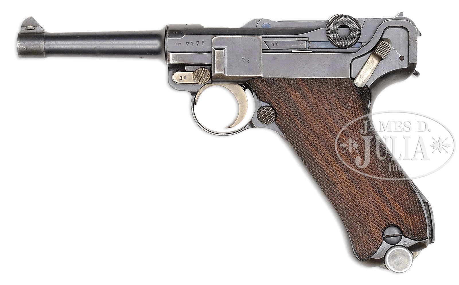 *◊ EXTREMELY RARE TURKISH ARMY 1936 MAUSER BANNER LUGER.SN 2176v. 4″ 9mm bbl with 4-digit SN, German Wehrmacht pattern bore mark 8,80, and Eagle/63 proof on bottom. 1936 above chamber. Mauser Banner on center toggle link. Crescent with star, “TC” (Turkish Republic property mark) and “Subaylara/mahsustur” (Officer’s Property) on right receiver. Left receiver has horizontal Crown/U next to 4-digit SN. Uniquely positioned small Eagle/63 inspection stamps on stop lug. Eagle/63 proof on right frame by takedown lever and tiny Eagle/63 on back of frame above lanyard ring. All numbered parts on gun are matching except checkered walnut right grip which is unnumbered and left grip that has numbers that do not match. Plain aluminum bottom magazine with no proofs or numbers on body or bottom. This gun is featured on pp. 539 and 783 of The Borchardt & Luger Automatic Pistols by Joachim Gortz & Dr. Geoffrey Sturgess. PROVENANCE: Collection of Dr. Geoffrey Sturgess. CONDITION: Excellent. Retaining 95% orig blue with light wear turning to corrosion on grip straps, right frame rail and sideplate. Straw has been reheated to 97%. Bore is worn with light pitting. Grips are sharp with beautiful wood grain. Magazine is excellent with little wear and minor scratches on bottom. Mechanics are excellent. 4-52895 BWS66 (15,000-22,500) – Lot 3106