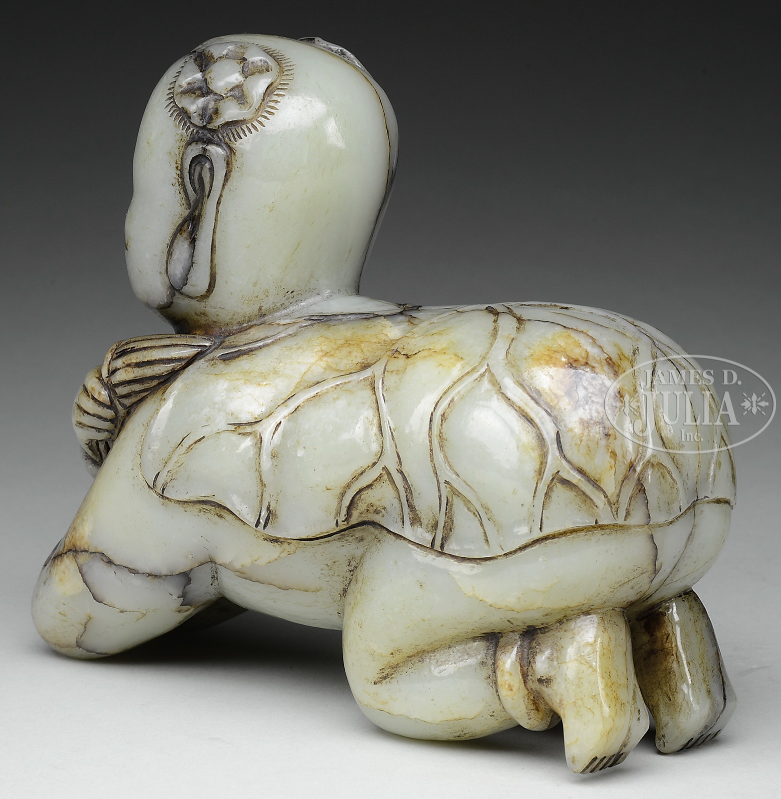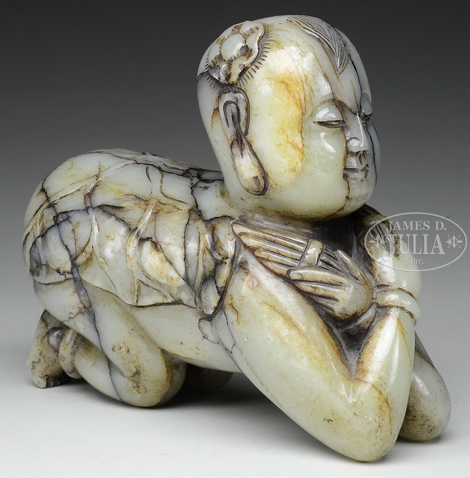 PILLOW IN FORM OF LOTUS-DRAPED BOY.18th-19th century, China. Jadeite(?): pale greenish-yellow with brown fractures and added color. Pillows in the form of small boys are found in ceramic and hardstone form from the Sung period on, but during the later Qing period there was an explosion of interest in, and production of, jade pillows shaped like kneeling boys holding objects of symbolic import. Both pairs and single images of this form are known in jadeite and nephrite. The general shape is that of a kneeling boy, feet tucked up under his hips, arms crossed with hands resting on opposite shoulders, and head up and looking straight ahead. Often the boy wears only a stomacher (belly warmer) or a lotus leaf, but in some examples he may be more fully dressed, in jacket and leggings (Palm, p. 52, #39). One or both hands may hold a sheng (mouth organ), a lotus (SHK 11/18/86, #193), a ruyi (magic fungus) (Keverne, p. 8, #2), or other objects such as a bird (Gump, p. 159). There may be bracelet pairs encircling wrists and ankles, and on some technically spectacular pillows of this type, this jewellery may revolve independently. The boy’s head may have hair assembled into a top knot (or top knots), or there may be a lotus cap. As well as being functional, the boy bedecked with a lotus and mouth organs (as here) symbolizes an important rebus, the wish for “continuous birth of noble sons”. This is based on the homophones lien and sheng, “lotus” and “mouth organ”, which are akin verbally to the lien and sheng of “continuous birth” (Barth, fig. 13). The felicity of thought accords with the typically blissful smile on the boys’ faces. It is unlikely that this work ever served as a pillow, since the effective space available for a head is only about 3.5″ (8.9 cm) wide. Reference: The Yangtze River Collection, Later Chinese Jades published by Helga Wall-Apelt, 1993. SIZE: 7″ x 7.88″ x 3″. (17.8 x 20 x 7.6 cm.) PROVENANCE: The Personal Collection of Dr. Helga Wall-Apelt. CONDITION: Stone with variegated russet inclusions and multiple natural fissures. Good polished surfaces. 47671-152 (1,250-2,250) – Lot 3106