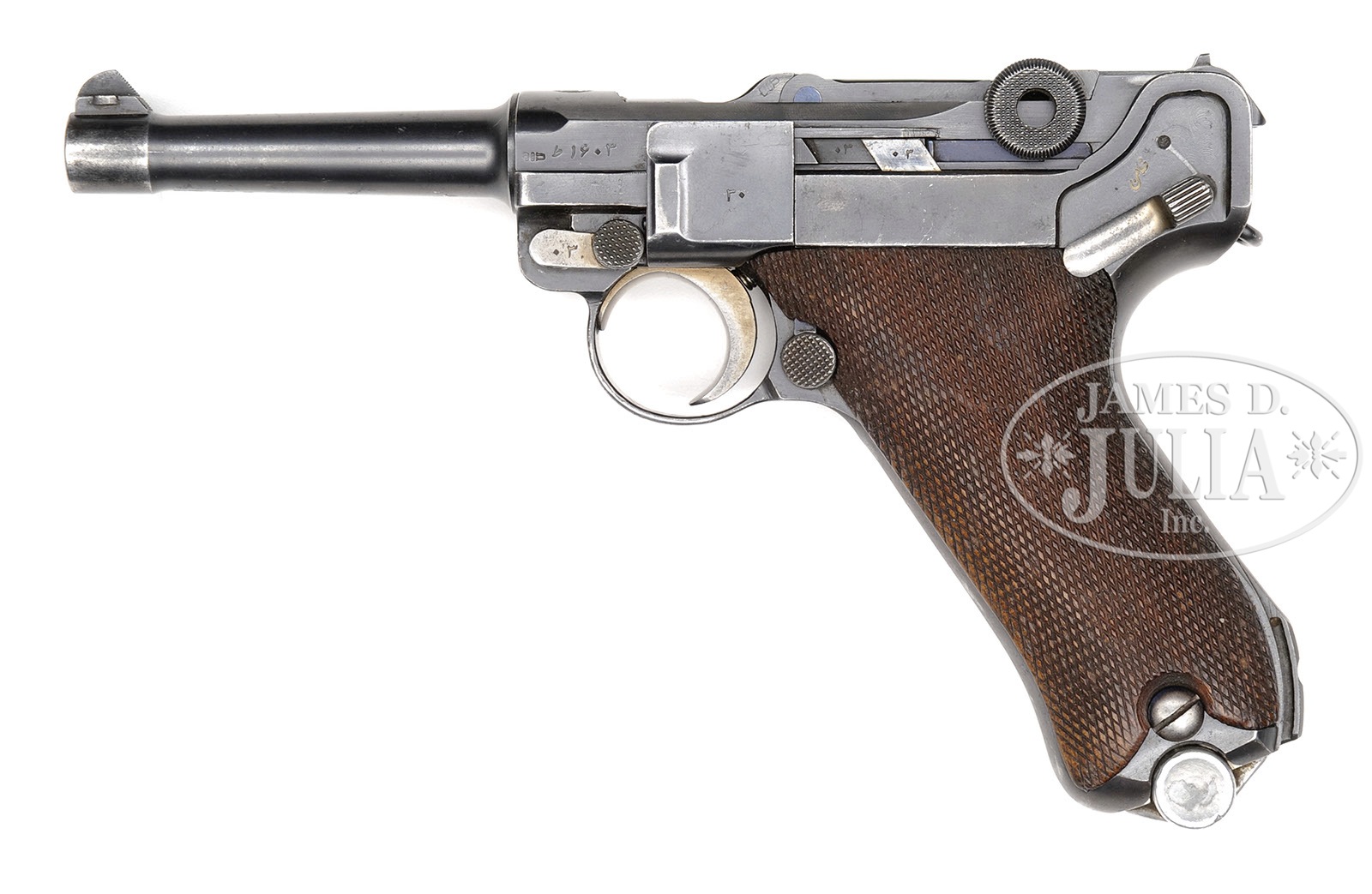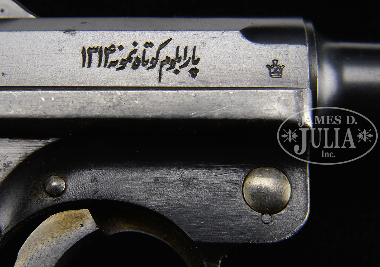 *◊ RARE PERSIAN MAUSER 4″ LUGER.SN 1903. 4″ 9mm bbl with Crown/U proof on front of sight base and full SN in Farsi on bottom of bbl. Pahlavi Crowned lion crest above chamber. Farsi script on center toggle link. “Parabellum Short Model 1314” (in Farsi, 1314 being Gregorian year 1935) next to a Persian proof on right side of receiver. Left side of receiver has a horizontal Crown/U proof next to full SN in Farsi. Upper safe position and extractor are marked “Safe & Loaded” in Farsi. All numbered parts on gun are matching in Farsi. Checkered walnut grips. Proper Persian aluminum bottom magazine with numbers in Farsi that do not match. This gun is featured on p. 561 of The Borchardt & Luger Automatic Pistols by Joachim Gortz & Dr. Geoffrey Sturgess. PROVENANCE: Collection of Dr. Geoffrey Sturgess. CONDITION: Excellent. Retaining 95% orig blue with most wear on grip straps which are fading and starting to corrode. Also an area of light wear and corrosion toward right front of bbl. Orig straw is 60% with some scattered light corrosion. Bore is bright and sharp. Grips are lightly worn with minor chips and dings to checkering and still show wood grain. Magazine is excellent with some minor dings to aluminum bottom. Mechanics are excellent. 4-52893 BWS59 (5,000-10,000) – Lot 3107
