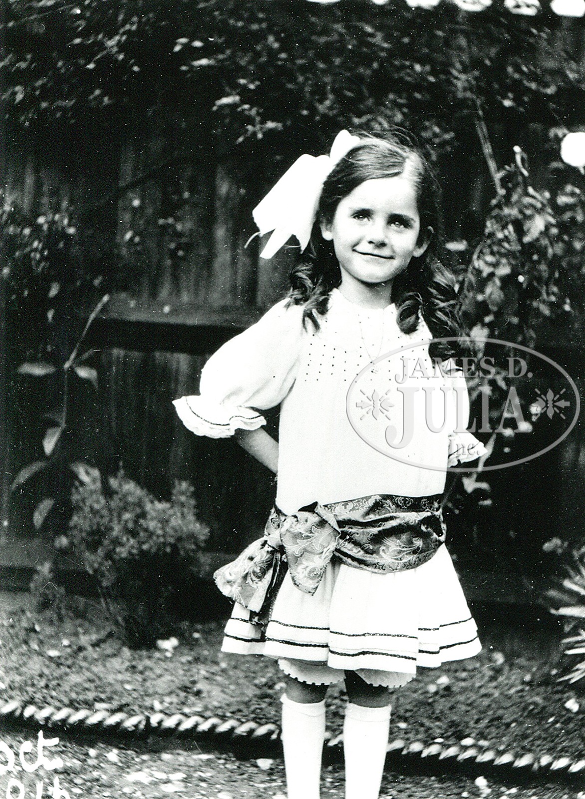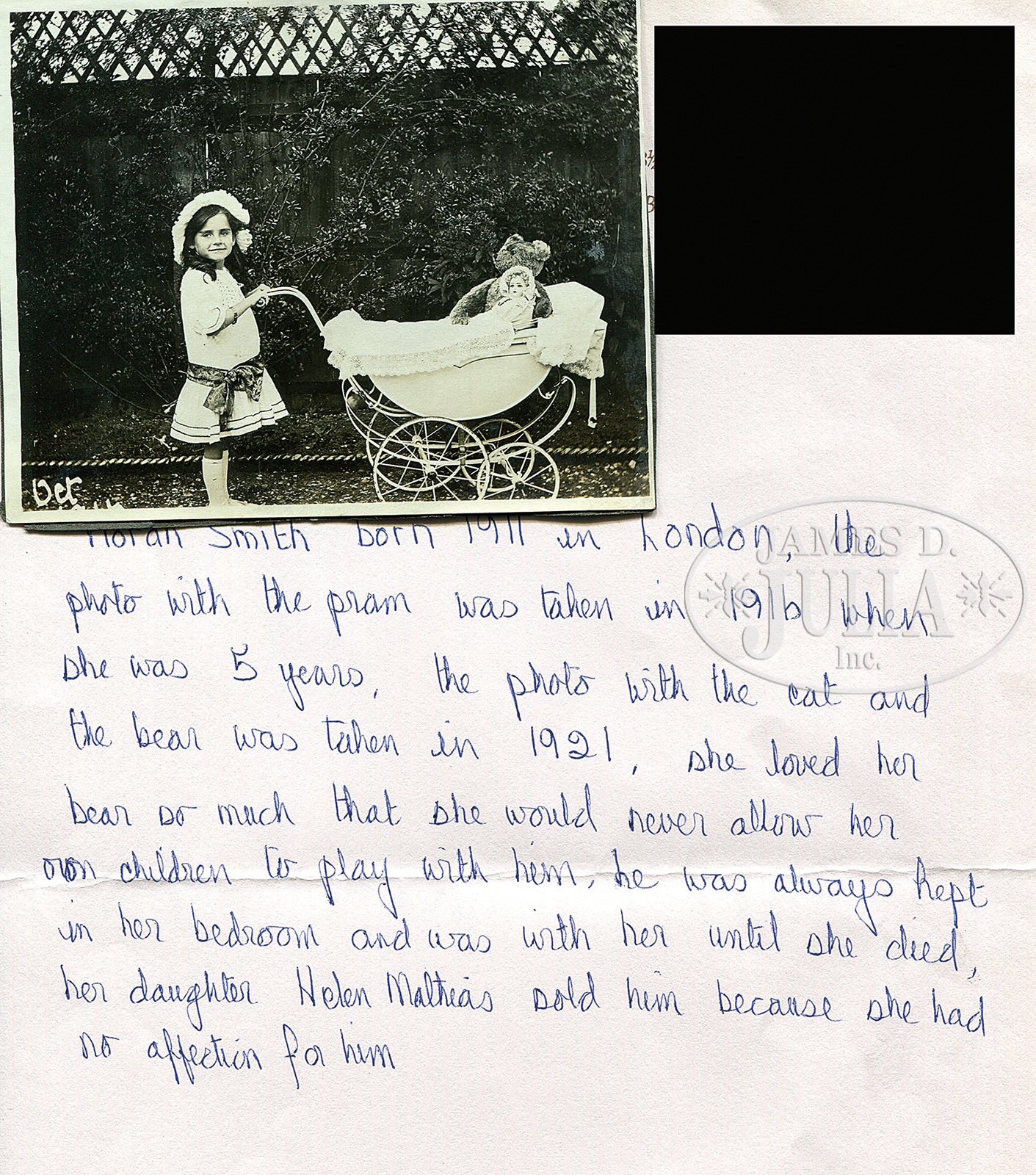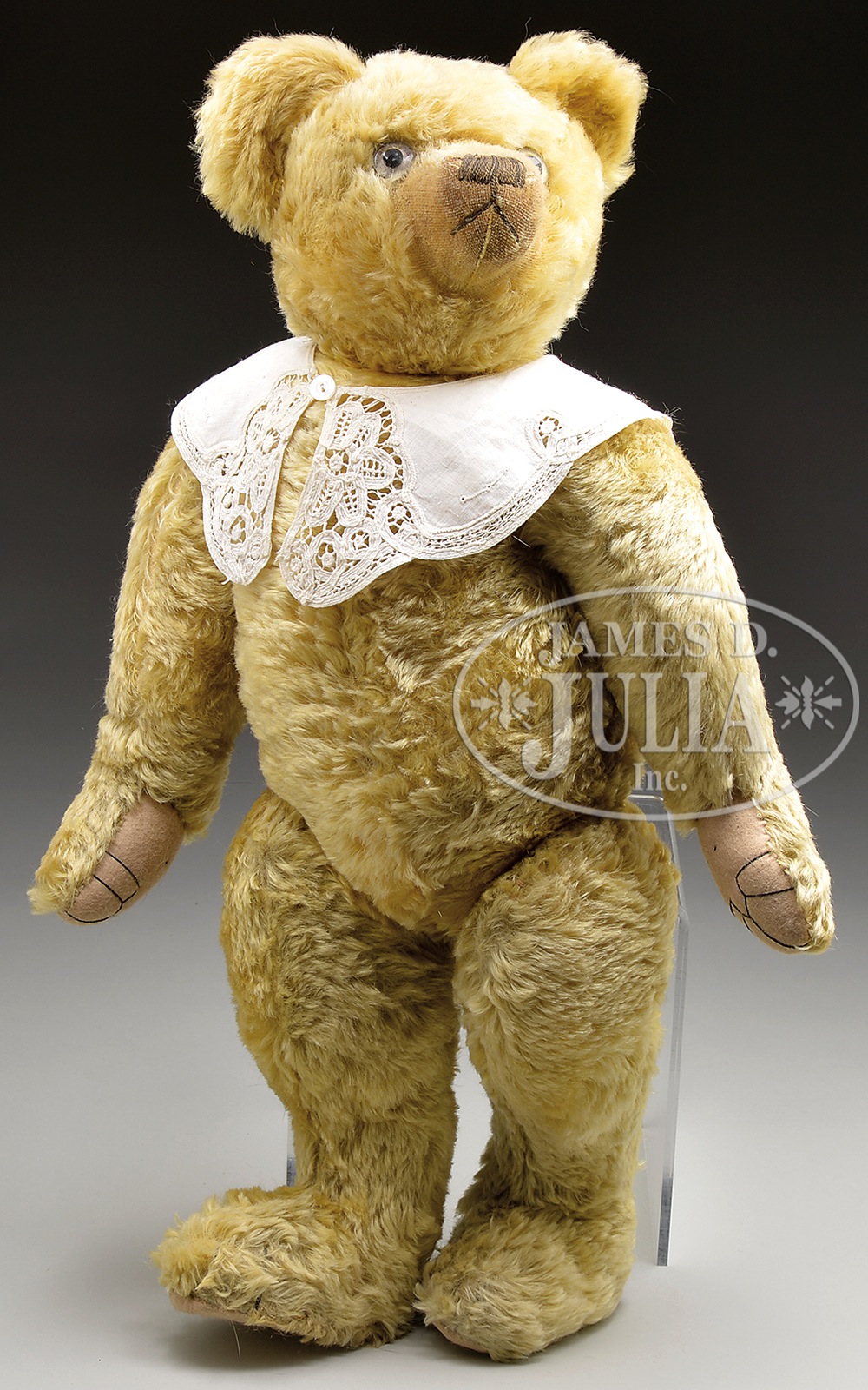 LARGE AND EARLY ALPHA FARNELL BEAR WITH PROVENANCE.Lovely and important larger early Alpha Farnell bear. Teddy is 5-ways jointed and made from light blond mohair. She has typical features and proportions of early Farnell Bears including chunky limbs, smaller hands and wrists, and a prominent muzzle. With early “webbed” claw stitching on hands. Teddy’s face is detailed with oversized glass pupil eyes (showing the typical paint flaking off the back) and a hand-embroidered nose and mouth. Bear comes with several photographs of the original owner as a child and a letter explaining the bear’s history. SIZE: Overall 26″ t (66cm). Sitting 20″ (50cm). PROVENANCE: Chuck & Cathy Steffes Collection. CONDITION: Pawpads recovered and webbed claws restitched. Otherwise very good. 1-13844 (1,000-2,000) – Lot 3109 Auction: Advertising, Toy & Doll - Spring 2014 Please Note: All prices include the hammer price plus the buyer’s premium, which is paid by the buyer as part of the purchase price. The prices noted here after the auction are considered unofficial and do not become official until after the 46th day. |