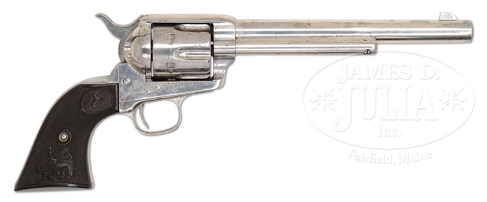 SN 1721. Cal. 22. Nickel finish with 7-1/2″ bbl, slightly altered front sight and 1-line block letter address. Left side of frame has 3-line patent dates & left front web of trigger guard has the caliber marking. Hammer & frame are orig rimfire parts with the firing pin secured with 2 rivets. Mounted with 2-pc Rampant Colt/Eagle hard rubber grips that are correct style, old replacements. Accompanied by 2 Colt factory letters, both of which identify this revolver in cal. .22 RF with 7-1/2″ bbl, blue finish, and rubber stocks, sold & shipped to “C.A. Damon”, address unknown on Oct. 22, 1888. One letter shows one gun in the shipment & the other 2 guns. This revolver is pictured and identified by serial number in The 36 Calibers of the Colt Single Action Army, Brown. Accompanying documentation shows that “Charlie A. Damon” was born 1863 & died 1937, and is buried in Fenton, MI. Another document discloses that Charlie Damon was one of the organizers of the Fenton Historical Society. According to various publications, there were only 107 caliber 22 Single Action revolvers ever made by Colt from left over 44 Rimfire frames. They were in their own SN series with the .44 Rimfire revolvers with a few others made later in another series. PROVENANCE: Collection of John Montague. CONDITION: Good; overall retains about 85% of a re-nickel finish; the 3 frame screws are modern replacements; grips show light wear; mechanics are fine; worn bore with visible rifling. 4-54370 JR166 (7,500-12,500) – Lot 3109