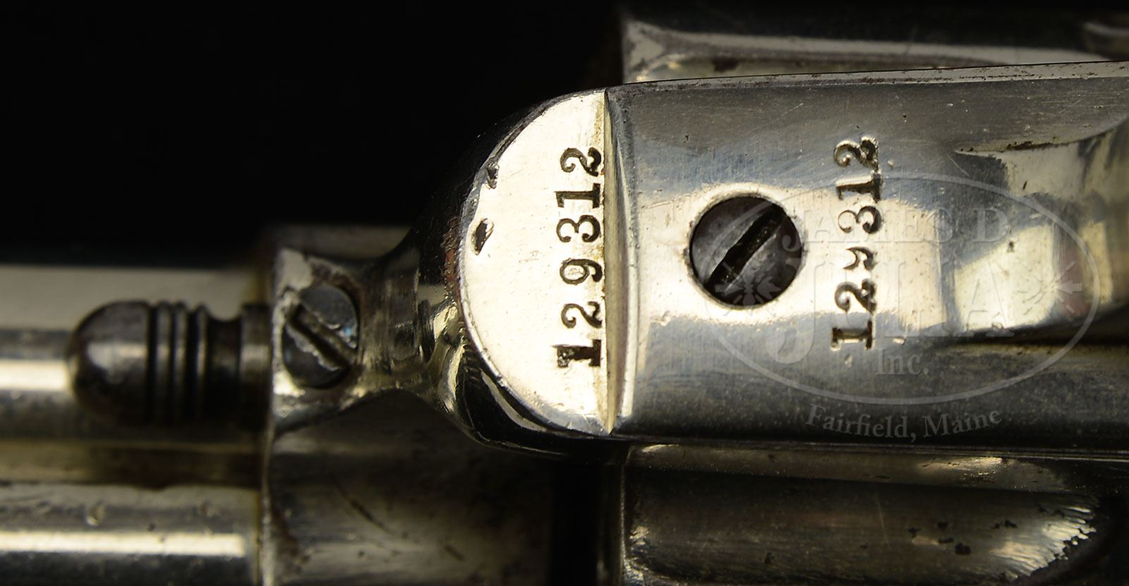 EXTREMELY RARE 22 CALIBER COLT FLAT TOP SINGLE ACTION ARMY TARGET REVOLVER.SN 129312. Cal. 22. Nickel finish with 7-1/2″ bbl, German silver blade in target front sight post and 1-line block letter address. Bottom of bbl under base pin is marked “22″, left side of frame has three patent dates in 3-lines and left front web of trigger guard is marked “22 CAL”. Frame is flat top style with dovetailed target sight in top strap. Mounted with 2-pc smooth mother of pearl grips. According to Colt Peacemaker Encyclopedia, Cochran, there were 917 flat top Single Action revolvers produced, out of which only 93 were in Cal. 22 Rimfire. Most target Single Actions noted in 22 Rimfire, it is thought were shipped to England and British Proofed. This is a rare example in beautiful condition that is pictured on p. 116 of Graham, Kopec and Moore’s A Study of the Colt Single Action Army Revolver. It is noted that SN 129314 was sold by our company in March of this year from the Tommy Rholes collection. In addition to being an extremely rare caliber in one of these revolvers, it is additionally rare not being British proofed. Colt factory letter states this gun was shipped August 24, 1889 to Griffith & Semple of Louisville, KY, the finish was listed as blue and stocks are not listed. It does state 7-1/2″ target bbl and 22 Cal. PROVENANCE: Bob Bell, Inglewood, CA. Lewis Yearout 1966. Estate Collection of Lewis & Leyton Yearout. CONDITION: Fine as refinished in nickel. Markings on bbl are crisp and discernible. The “22” on bottom of bbl and “22CAL” on trigger guard are light but discernible. Interesting marking under ejector housing on bbl which includes “6”, “F” and “A” all stamped over each other along with anther cryptic character not noted by this cataloger on Colts before but appears orig to time of use. Bbl retains virtually all of its nickel plating, ejector housing, frame, trigger guard and backstrap retain over 90% of their finish with largest reductions at front face of frame where it mates with cyl. Functionally gun performs well with good discernible rifling. 4-53878 JS58 (10,000-15,000) – Lot 3110 Click here to view provenance