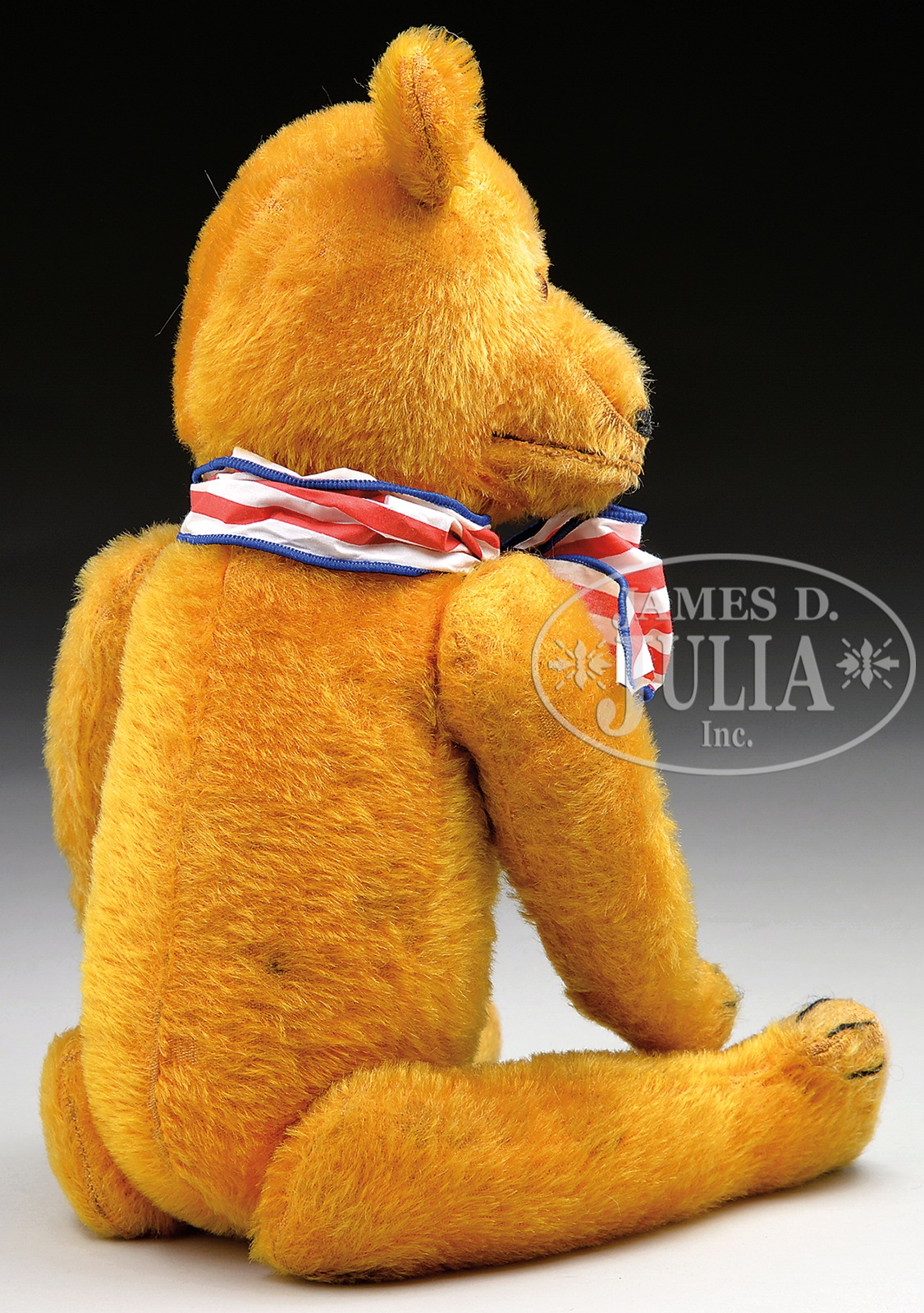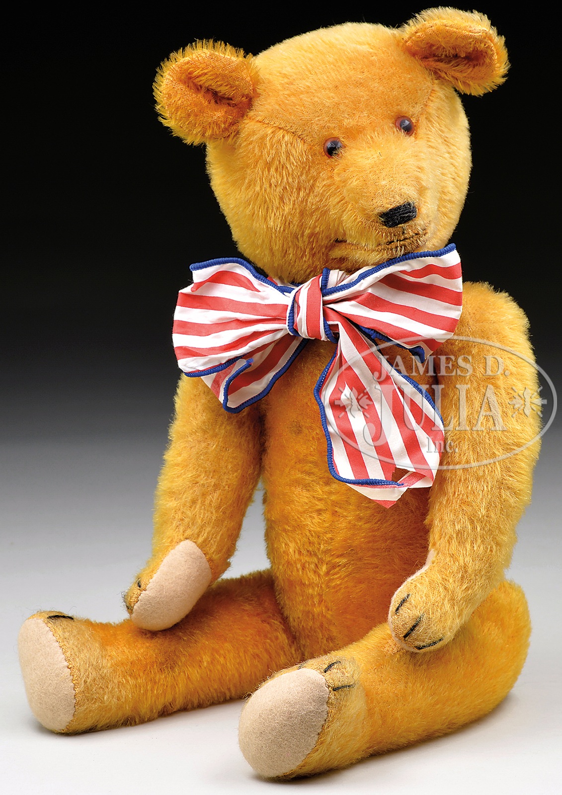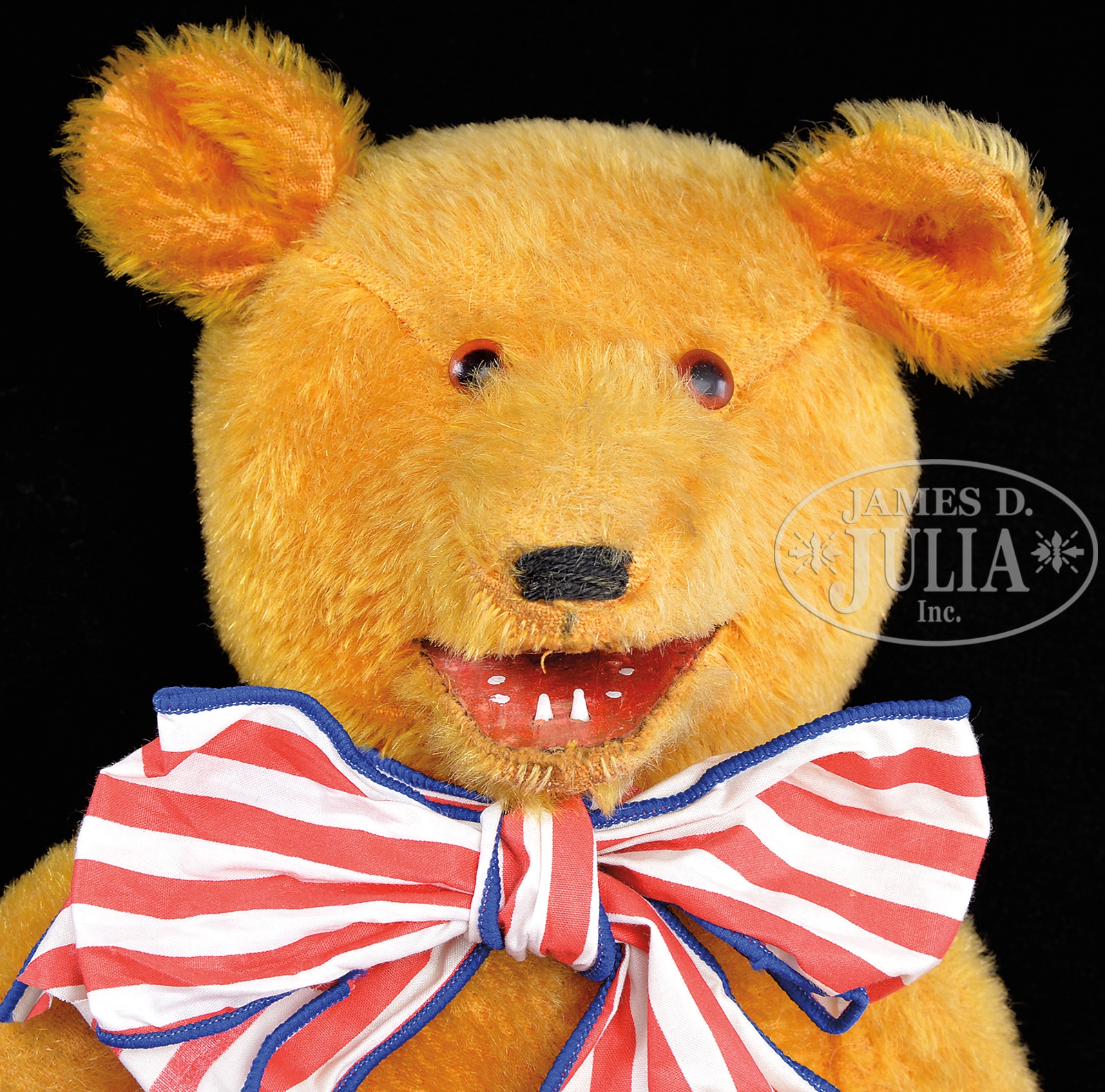 COLUMBIA TEDDY BEAR BRAND “LAUGHING ROOSEVELT” BEAR.Circa 1907 5-ways jointed teddy bear is excelsior stuffed and made from golden colored mohair. Traditional American style bear with long, thin limbs and proportions with felt paw pads. When stomach is pressed, the mouth opens up to reveal two white teeth. Face is detailed with brown and black glass pupil eyes and hand-embroidered black nose. Three black claws on each paw and foot. Produced as a novelty from a manufacturer in New York in response to the teddy bear craze of the period. SIZE: Overall 18″ t (47cm). Sitting 12″ (30cm). PROVENANCE: Chuck & Cathy Steffes Collection. CONDITION: Slight foxing throughout, possible pad replacement, otherwise very good. 1-13848 (1,000-2,000) – Lot 3111 Auction: Advertising, Toy & Doll - Spring 2014 Please Note: All prices include the hammer price plus the buyer’s premium, which is paid by the buyer as part of the purchase price. The prices noted here after the auction are considered unofficial and do not become official until after the 46th day. |