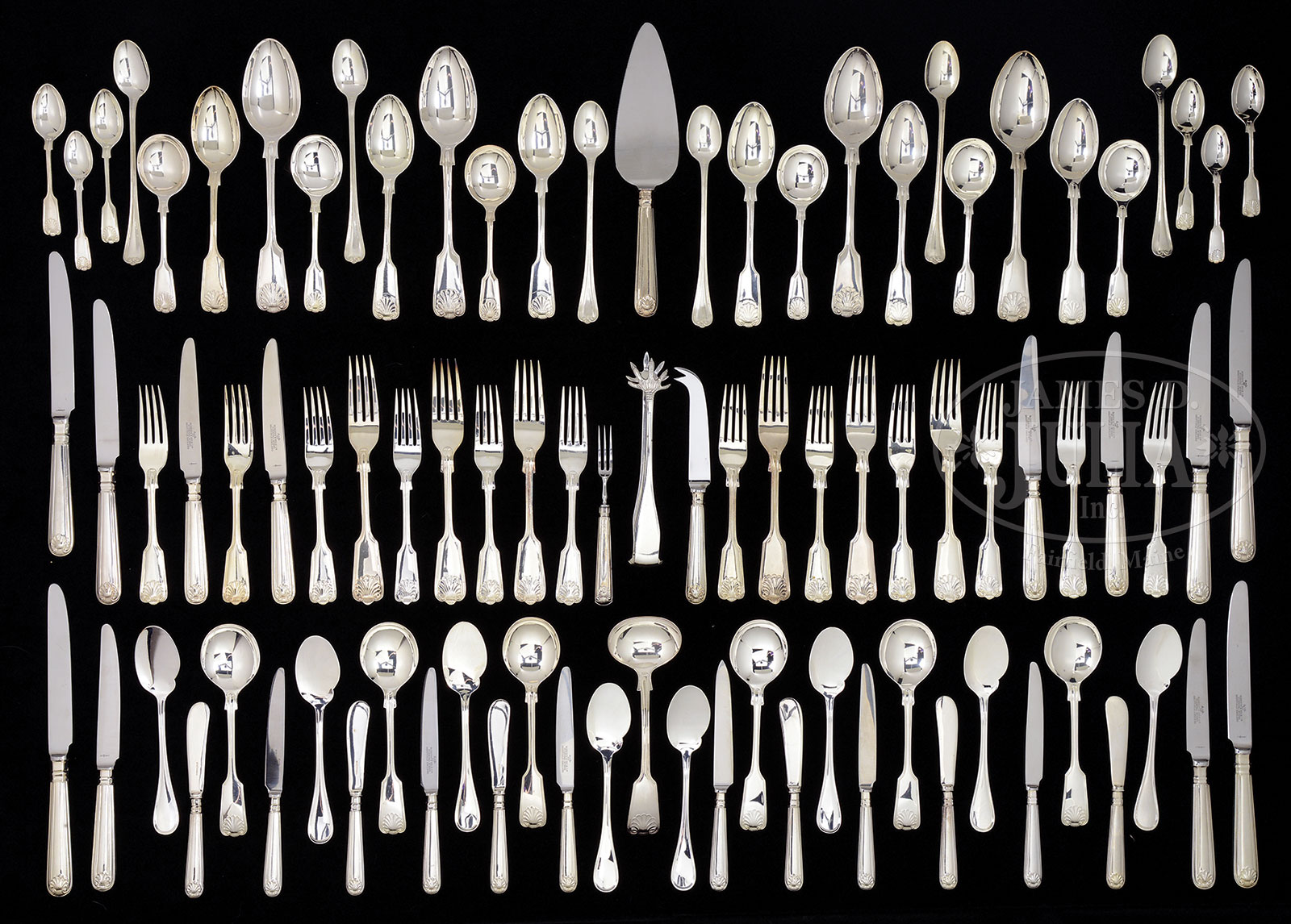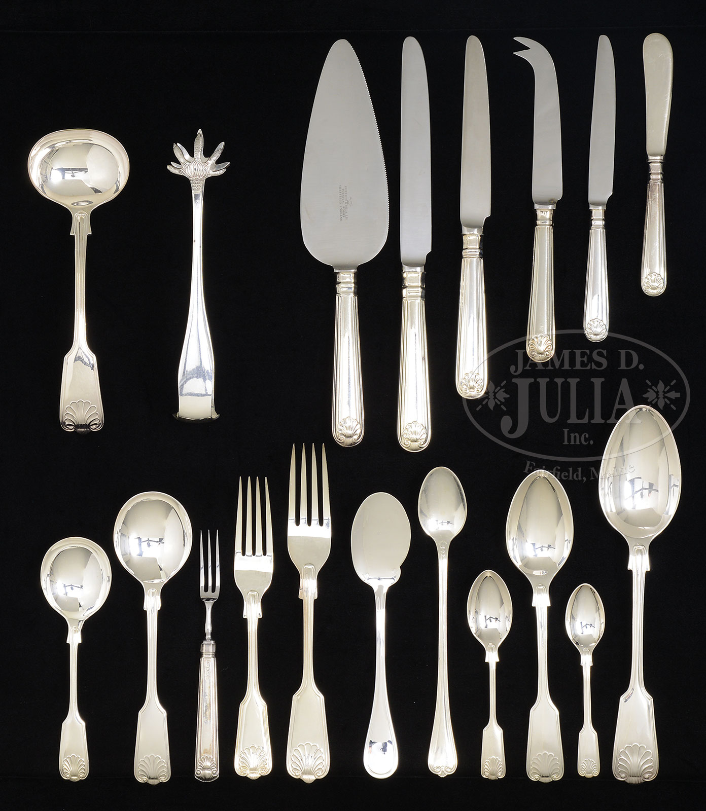 74 PIECE SILVER PLATED FLATWARE SET BY ROBERTS & BELK IN THE FIDDLE, THREAD & SHELL PATTERN AND 15 OTHER PIECES OF SILVER PLATE.Set includes: Six 8-1/4″ dinner forks, twelve 7-1/4″ luncheon forks, four 9″ serving spoons, six 7-1/2″ tablespoons, six 7″ soup spoons, six 6″ bouillon spoons, four 5″ coffee spoons, two 4-1/2″ demitasse spoons, six 10″ dinner knives, six 8-3/4″ luncheon knives, six 7-1/2″ fruit knives, six 6-1/4″ butter knives, 7-1/2″ ladle, 8″ cheese knife, 6″ pickle fork, and a 10″ cake knife. Along with eight 7″ French sauce spoons by Christofle, 7″ claw form silver plate ice tongs, and six silver plated ice tea spoons by Rogers Brothers. PROVENANCE: From a fine New Hampshire home. CONDITION: Set purchased in 1995 and in as new condition. No monogram. Other pieces are very good. 52210-7 (200-400) – Lot 3112