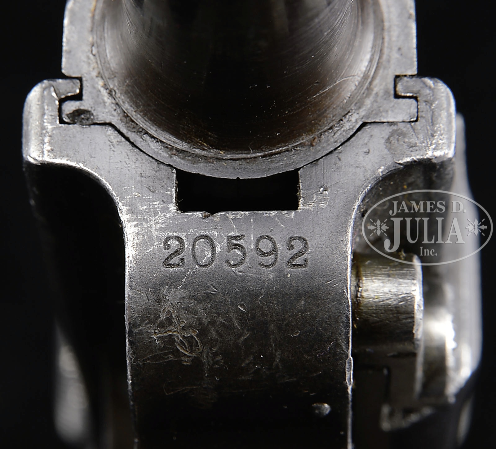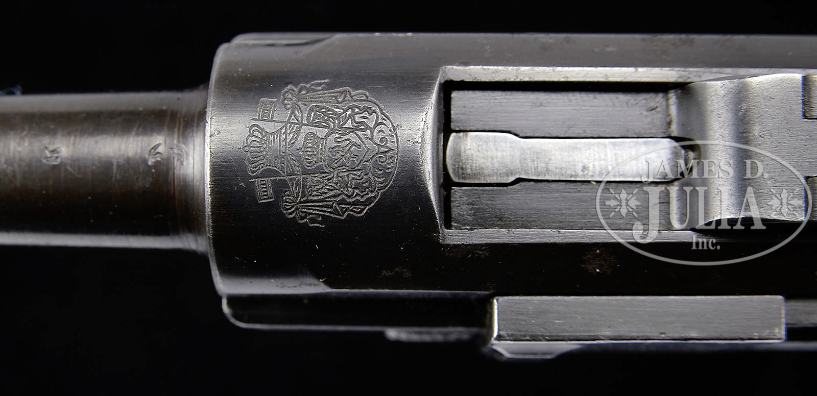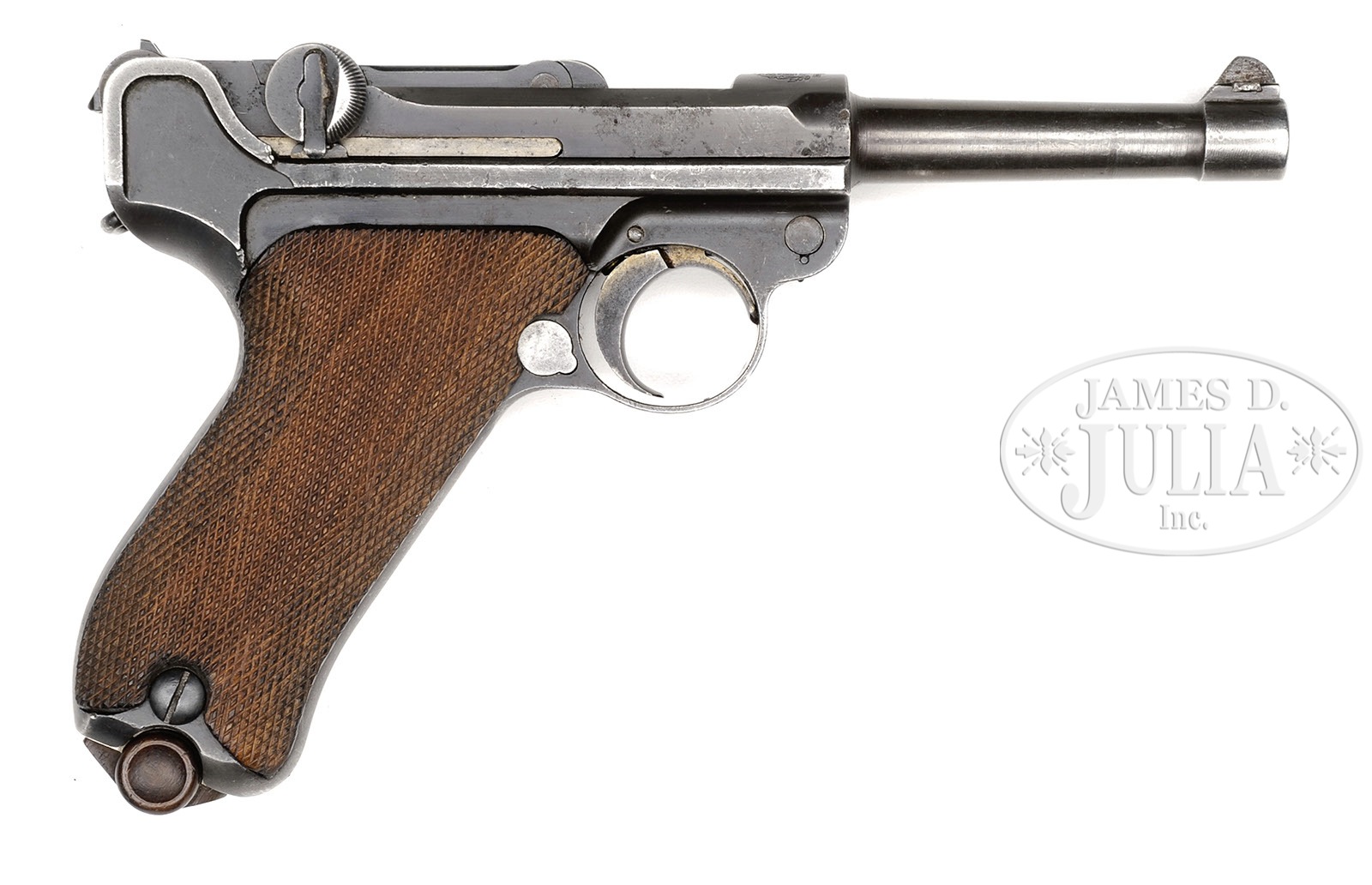 *◊ RARE 1900 BULGARIAN LUGER CONVERTED TO 9MM P.08.SN 20592. 4″ 9mm bbl. Bulgarian crest above chamber. DWM scroll on center toggle link. Dished toggles with toggle latch. Bulgarian safety marking. Frame and toggle assembly are matching; receiver, side plate, trigger and other small parts do not match. 9mm bbl is unnumbered and the flange has been machined off to fit the long frame. Grip safety has been removed and internal components have been converted to p.08 pattern. Main spring has been converted to coil spring. Wood bottom magazine has numbers that do not match. These pistols were converted to P.08 configuration by German Wehrmacht depots during WWII. This gun is featured on p. 684 of The Borchardt & Luger Automatic Pistols by Joachim Gortz & Dr. Geoffrey Sturgess. PROVENANCE: Collection of Dr. Geoffrey Sturgess. CONDITION: Very good, retaining about 60% blue with scattered light pitting and scratches. 20% orig straw. Bore is worn and frosted. Right grip is sharp with nice wood grain, left grip is well worn with dings. Magazine is excellent with very little wear. Mechanics are sound. 4-52856 BWS11 (2,000-3,000) – Lot 3113